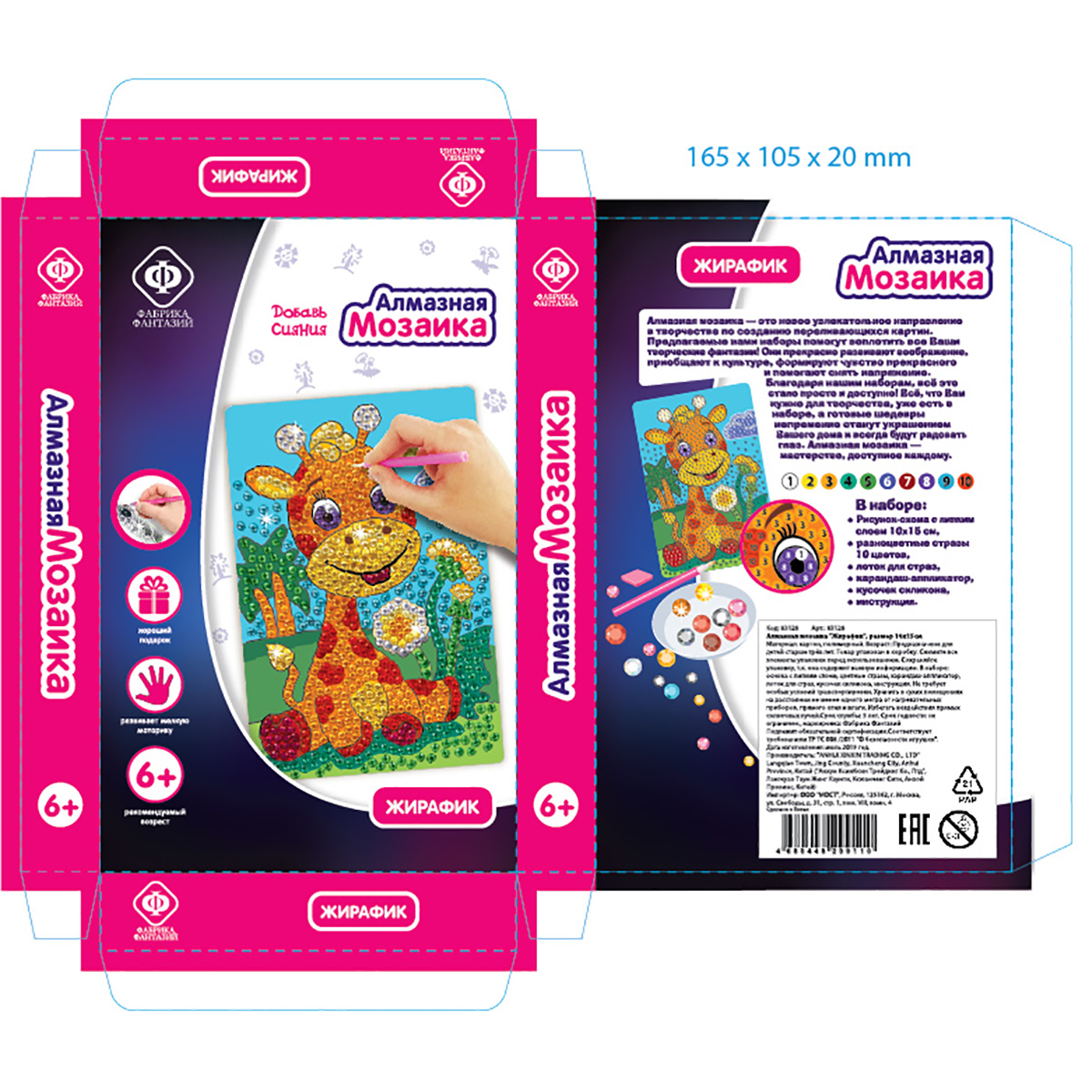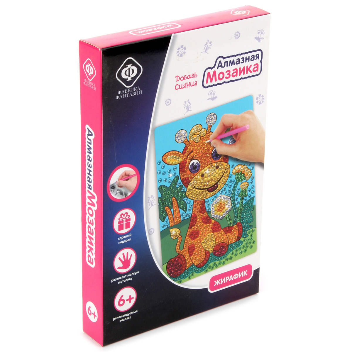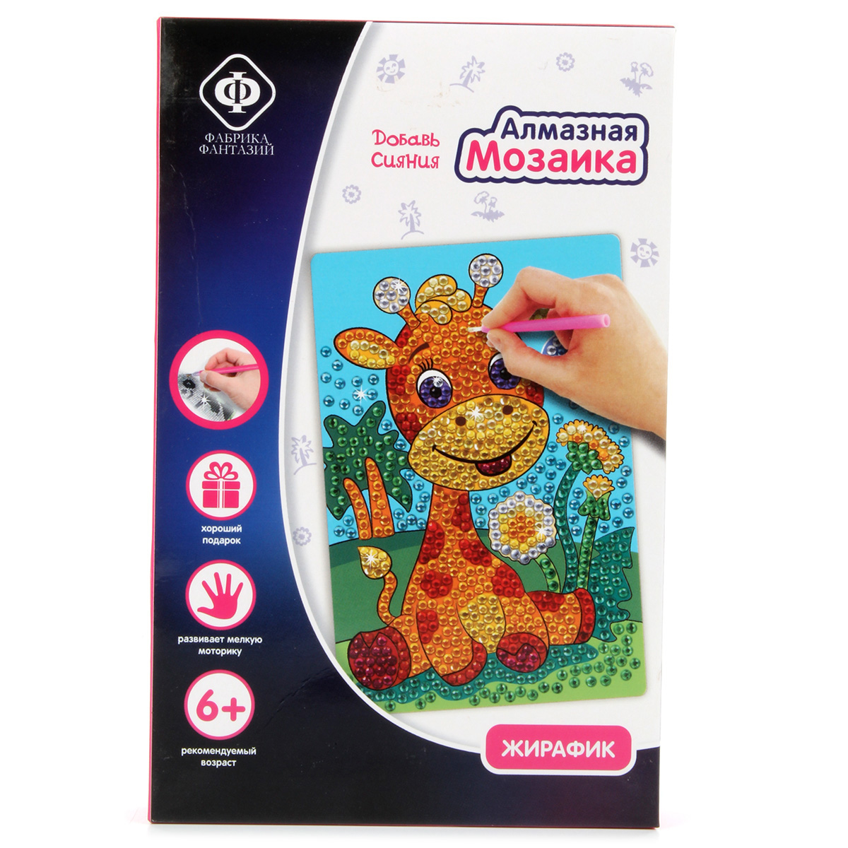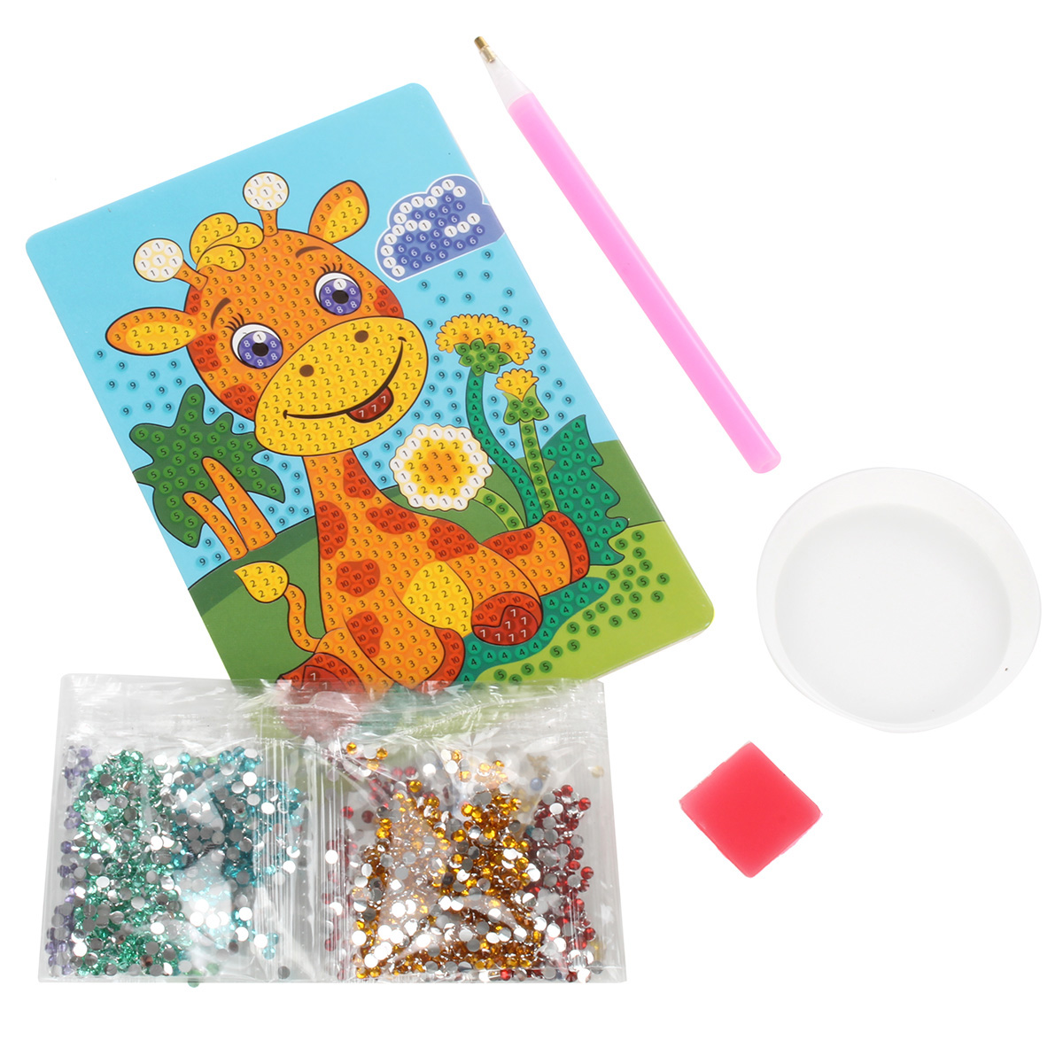 Алмазная мозаика - это новое увлекательное направление в творчестве по созданию переливающихся картин! Предлагаемые наборы помогут воплотить все ваши творческие фантазии! Всё, что вам нужно для творчества, уже есть в наборе, а готовые шедевры непременно станут украшением дома и всегда будут радовать глаз! В набор входят: основа с липким слоем 10х15 см, цветные стразы, карандаш-аппликатор, лоток для страз, кусочек силикона, инструкция. Механизм создания картинки: - выложите перед собой содержимое набора. Стразы для удобства разложены по цветам, каждый пакетик со стразами пронумерован. Эти номера соответствуют номерам на схеме; - снимите защитную пленку с клеевого слоя на рисунке-схеме; - возьмите пакетик со стразами, соответствующими номеру на рисунке схемы, отсыпьте немного в лоток; - карандаш-аппликатор имеет на конце полость, в которую нужно набрать немного силикона простым нажатием на него; - возьмите стразу кончиком карандаша и прикрепите ее на схему; - соберите всю картинку таким способом и обяза