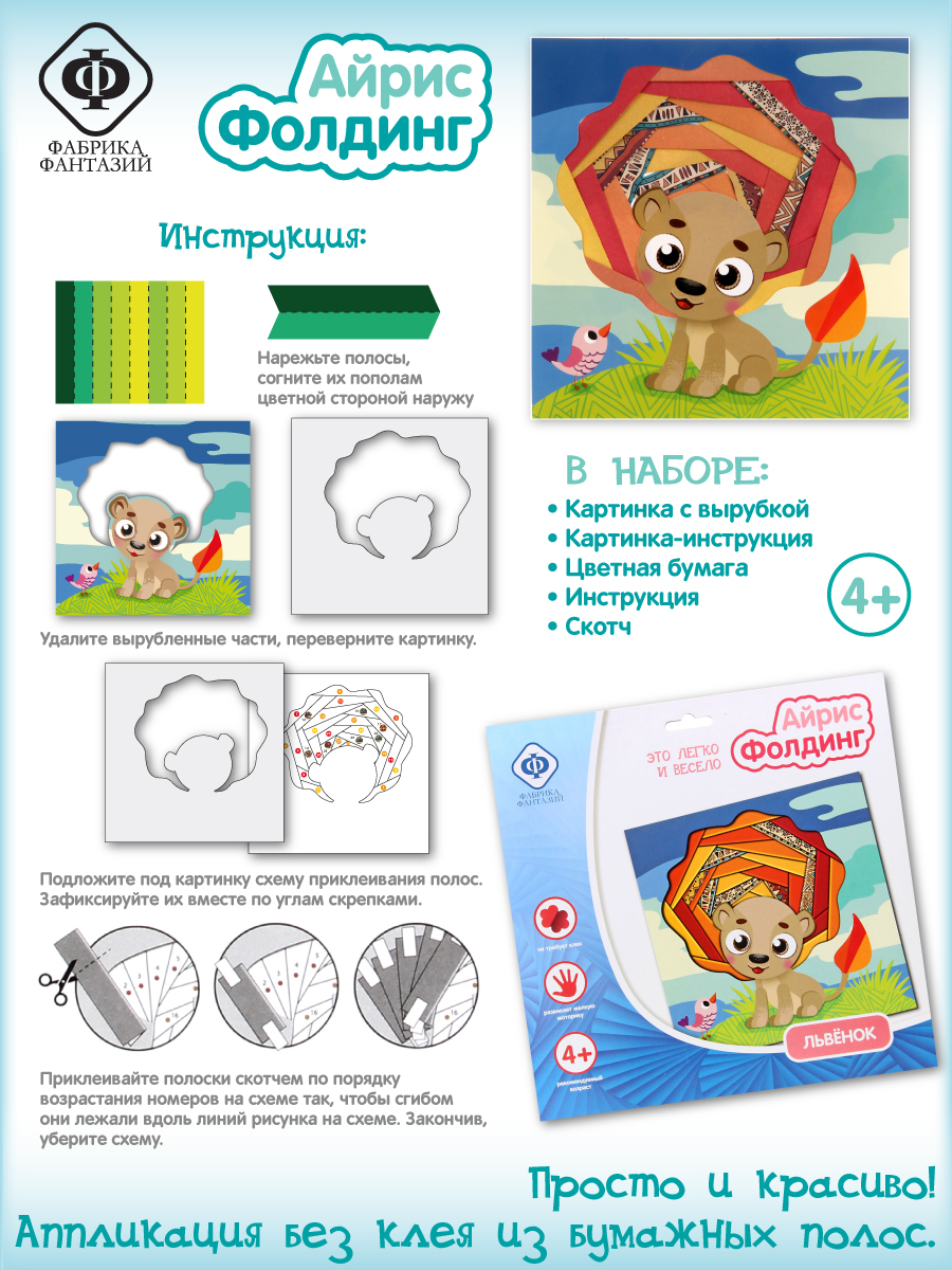Айрис Фолдинг (Iris Folding) - заполнение вырезанной по контуру картинки разноцветными полосками. Эта техника является одновременно и методом скрапбукинга и наследницей оригами. "Радужное складывание" только кажется сложным, на самом деле, эта техника требует внимания и аккуратности, но при этом позволяет без труда делать эффектные картины. Ваш ребенок будет в восторге от аппликации, так как картина получится радужной и цветной, особо яркой и фактурной. В наборе: картинка с вырубкой, картинка-инструкция, цветная бумага, инструкция, скотч. Развивает мелкую моторику, не требует клея. Рекомендовано для детей в возрасте от 4 лет. Размер упаковки: 24,5х24,5см.