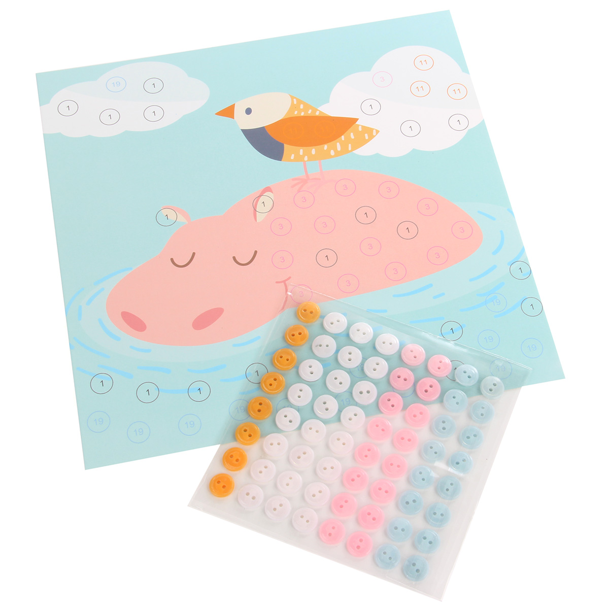 Аппликация пуговицами - полезная и развивающая идея для занятия с ребенком. Все, что нужно для творчества, уже есть в наборе. Пуговки с клеевым слоем очень удобно и чисто клеить, а готовые шедевры непременно станут украшением интерьера и напоминанием о достижениях вашего малыша! Набор прекрасно развивает воображение, мелкую моторику рук и координацию движений. В наборе: - яркий фон 22*22 см с метками; - цветные пуговицы с клеевым слоем; - инструкция на упаковке. Покажите малышу, что пуговицу лучше брать за бока, чтобы не портить клеевой слой. В расстановке пуговиц ориентируйтесь по меткам на фоне и фото на упаковке. Рекомендуемый возраст: 4+ Упаковка: цветной конверт с европодвесом. Материалы: полимер, картон. Размеры упаковки: 25*0,5*24,5 см.
