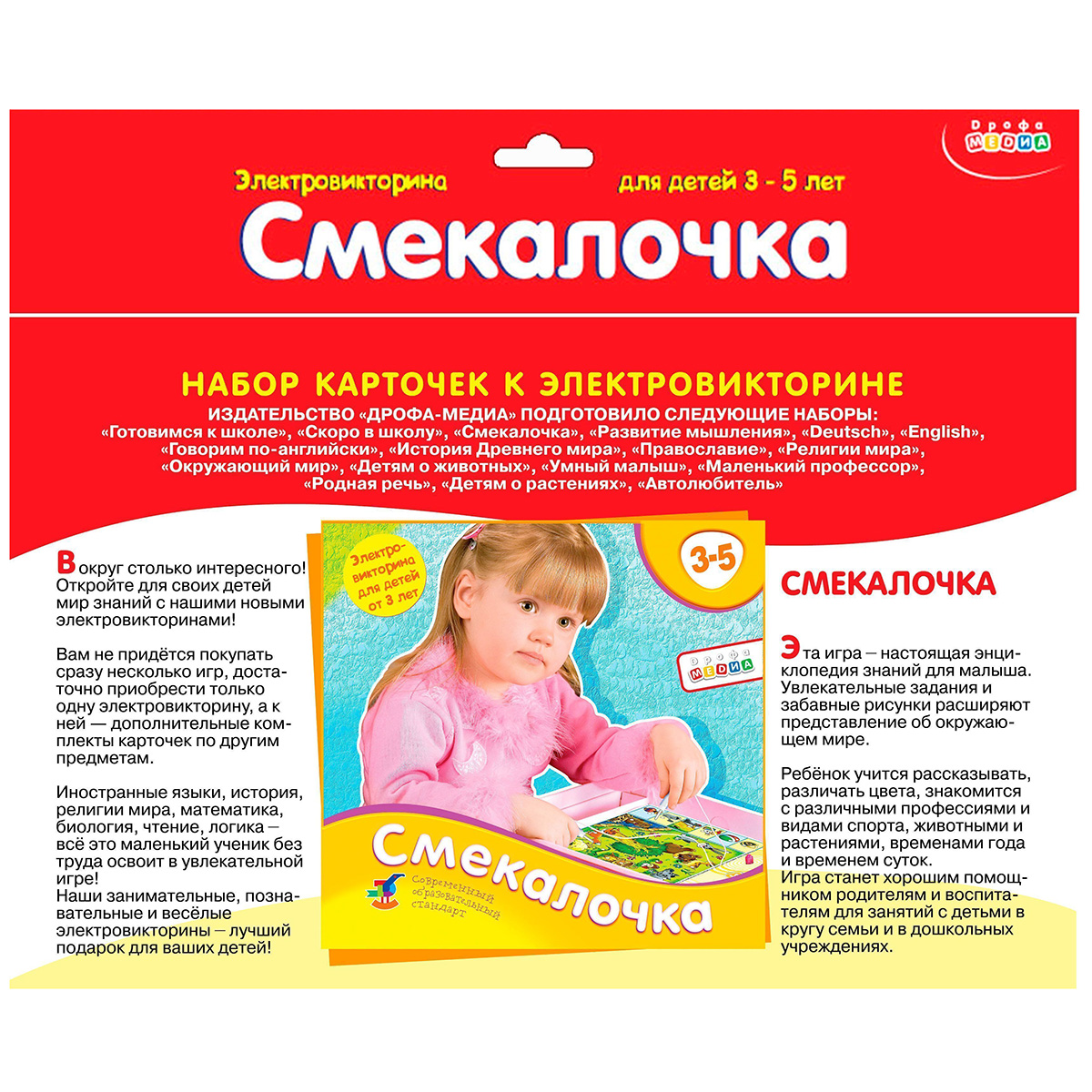 Дополнительный набор карточек к любой электровикторине в коробке. К любой нашей электровикторине подходят наборы карточек от других игр этой серии. Поэтому, если у вас уже есть одна электровикторина, то покупать другие игры этой серии в коробках не нужно, достаточно приобрести дополнительные наборы карточек к уже имеющейся игре. Игра развивает наглядно-образное мышление, произвольное внимание, память, речь, расширяет кругозор. Играя, ребёнок учится рассуждать, сопоставлять, сравнивать, устанавливать простые закономерности, принимать самостоятельные решения и проверять правильность их выполнения, доказывать и обосновывать свой выбор. ТЕМЫ КАРТОЧЕК: Ищем предметы одного цвета Тренируем произвольное внимание Учимся видеть части целого Находим сказочного героя и его вещи Ищем одинаковые игрушки Соединяем детёнышей и родителей Называем предметы одним словом Соединяем части предметов Определяем, с какого дерева плоды Узнаём, кто чем питается Сопоставляем форму и расцветку предметов Называем слова, начинающиеся с о