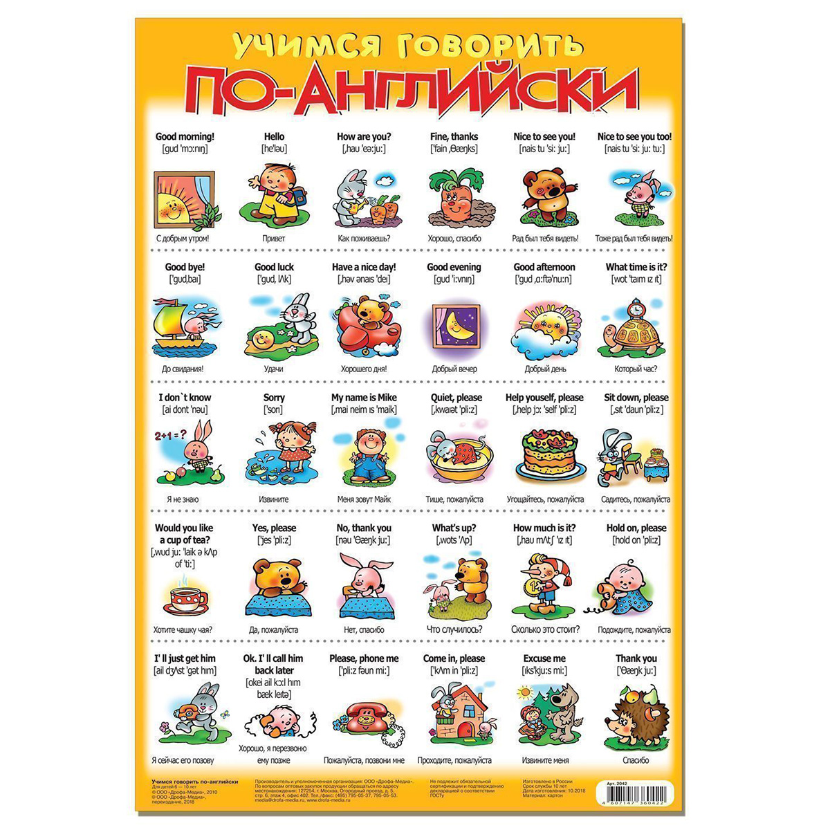 Плакат можно использовать для обучения и развития детей дома, в детском саду или в школе. В плакате представлены часто используемые фразы на разные темы: приветствие, просьбы, вежливые слова. Вы найдёте фразу на английском языке, транскрипцию, перевод и весёлую иллюстрацию. Возраст: 6—10 лет.
