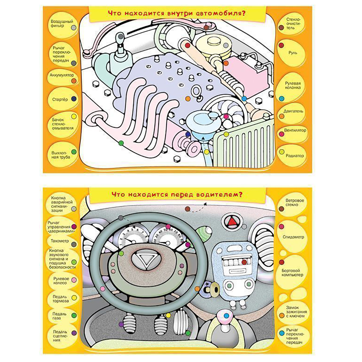 Дополнительный набор карточек к любой электровикторине в коробке. К любой нашей электровикторине подходят наборы карточек от других игр этой серии. Поэтому, если у вас уже есть одна электровикторина, то покупать другие игры этой серии в коробках не нужно, достаточно приобрести дополнительные наборы карточек к уже имеющейся игре. В игре-электровикторине собраны сведения о величайшем изобретении в истории — автомобиле. Юные автолюбители познакомятся с современными и старинными автомобилями, военной и специальной техникой, популярными и экзотическими машинами. Ребята узнают, как выглядели первые автомобили и современные модели, кто изобрёл велосипед и что находится под капотом, познакомятся с правилами дорожного движения и дорожными знаками. ТЕМЫ КАРТОЧЕК: Найди части автомобиля Что находится под капотом автомобиля? Что находится на приборной доске перед водителем? Как называется тип кузова? Как выглядели первые машины? Как выглядели первые автомобили? Как выглядели автомобили в начале ХХ века? Какие маш