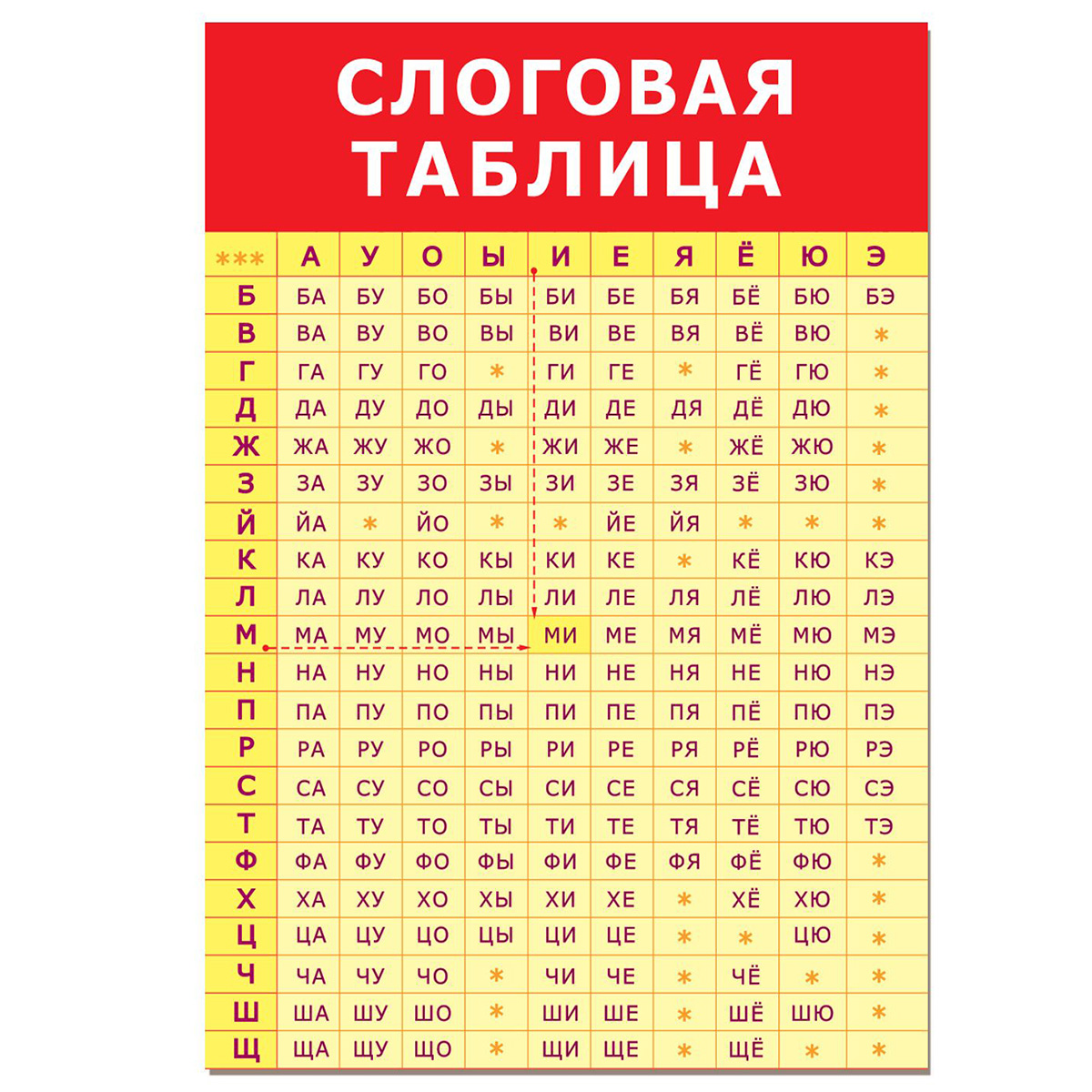 Плакат помогает освоить навыки чтения по слогам. В верхней строке по горизонтали размещены гласные, в левом столбце по вертикали — согласные. В месте их пересечения образуются прямые открытые слоги. Такой принцип образования слогов поможет ребёнку быстро находить нужный слог и правильно произносить сочетания звуков. Наглядный материал можно использовать для обучения и развития детей дома, в детском саду или школе. Возраст: от 3 лет