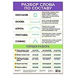 Плакат даёт представление о частях слова, приводит их определение, показывает графическое обозначение. Приведён порядок разбора по составу существительного, прилагательного и глагола. Рекомендуется использовать в качестве наглядного пособия дома и в школе. Возраст: от 7 лет.