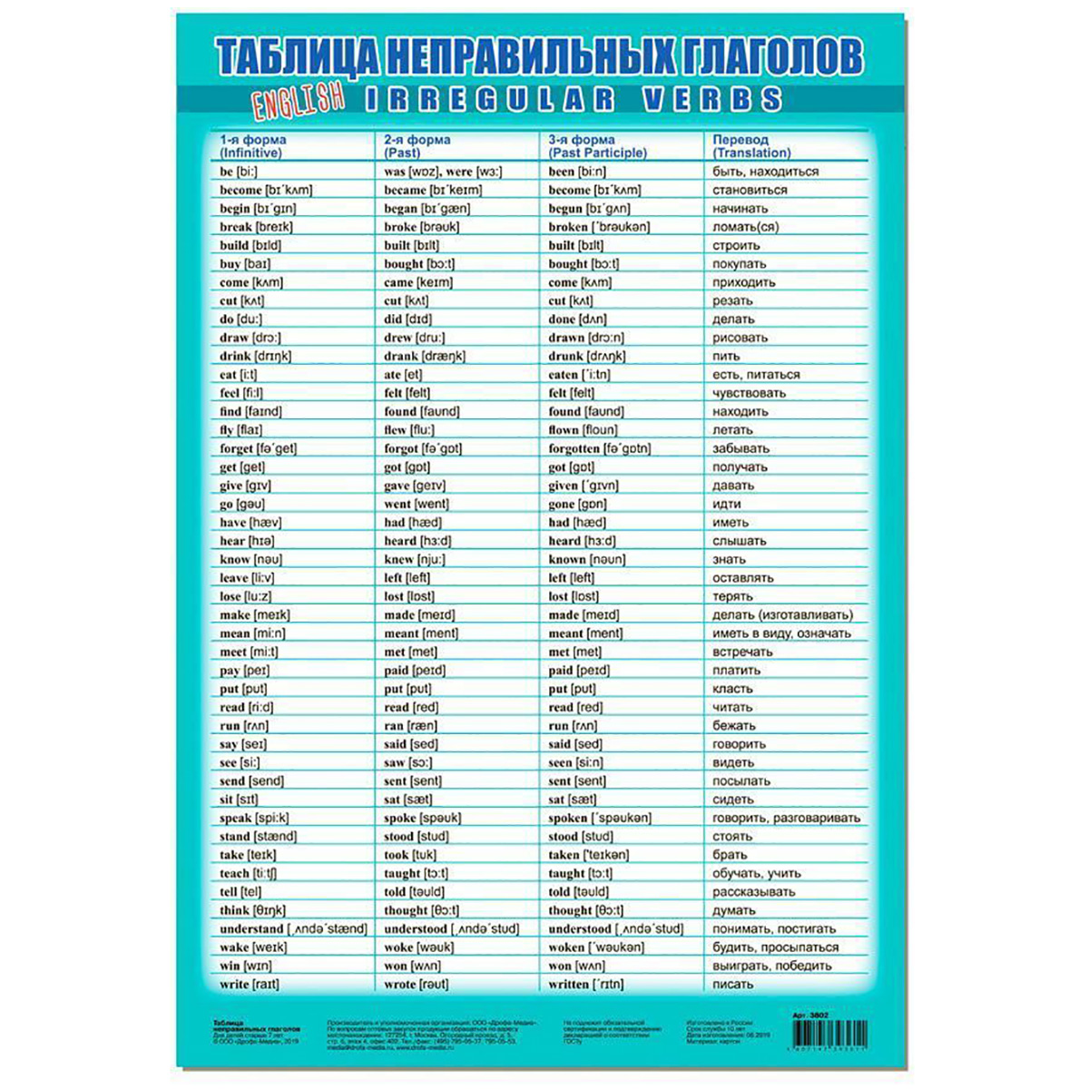 В таблице представлены 3 формы (Infinitive, Past и Past Participle) 45 наиболее часто употребляемых английских неправильных глаголов с транскрипцией и переводом. Плакат можно использовать в качестве наглядного и справочного материала на занятиях дома, в школе и в развивающем центре. Возраст: от 7 лет.