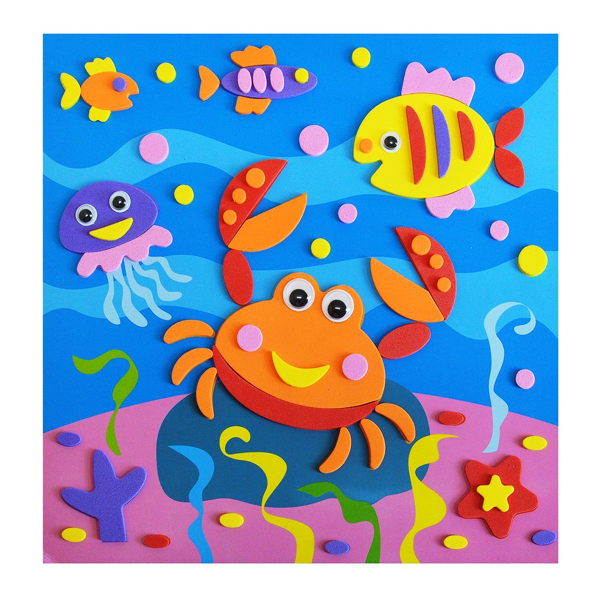 Аппликация – один из основных видов творчества для самых маленьких детей. Аппликация оказывает огромное влияние на развитие умственных и творческих способностей, мелкой моторики, внимательности и усидчивости. Для создания забавной мягкой картинки вам не понадобятся дополнительные материалы, клей или ножницы. Всё необходимое вы найдёте в нашем наборе. Чтобы наклеить деталь, нужно аккуратно снять её с защитной плёнки и приложить в нужное место на картинке. Яркие, простые иллюстрации прекрасно подходят для первого знакомства малыша с аппликацией. В наборе: - цветная основа со схемой размещения деталей, - детали из ЭВА на самоклеящейся основе, - пластиковые глазки, - цветная листовка-образец. Возраст: 3–7 лет. Размер аппликации: 20х20 см. Размер упаковки: 25х20х0,4 см.