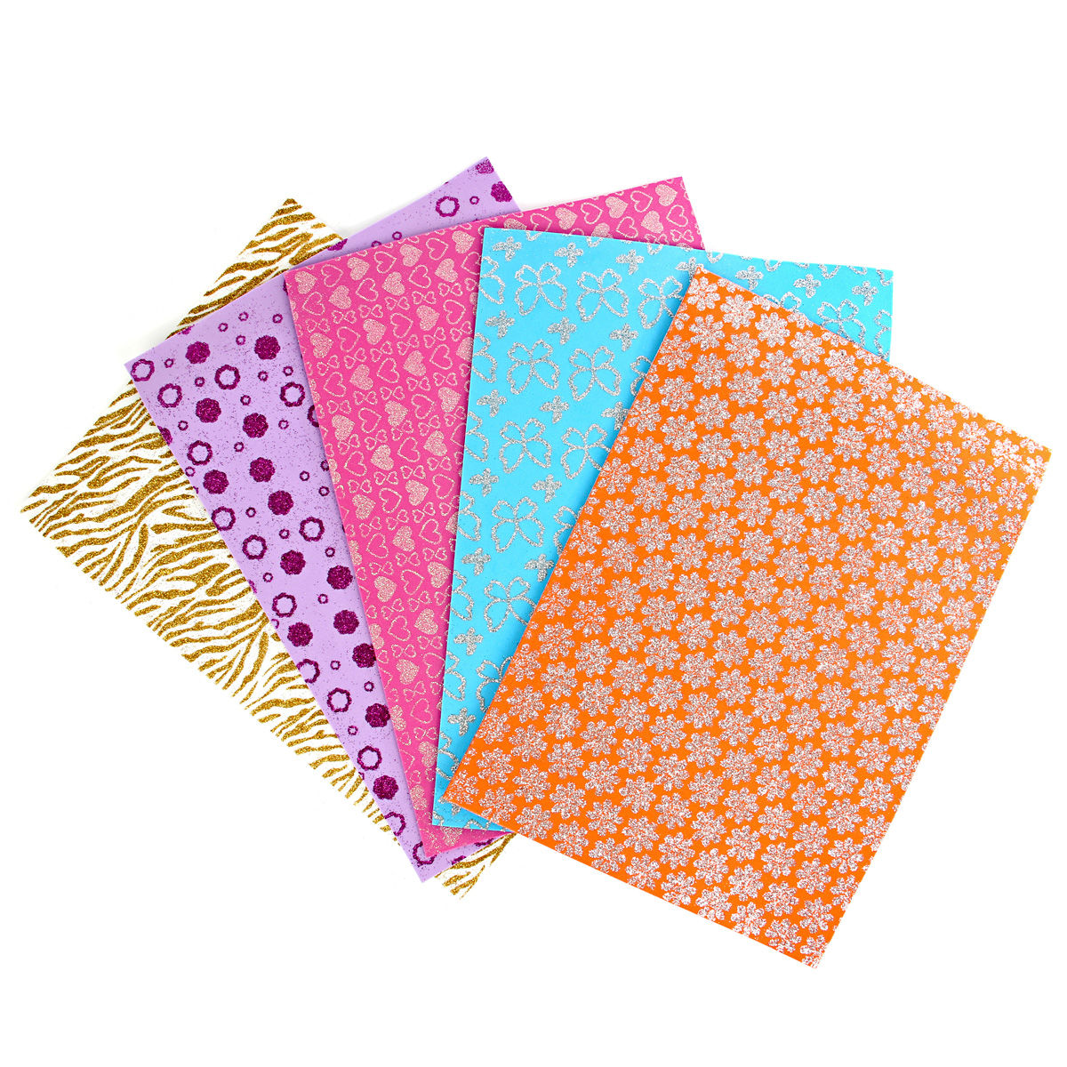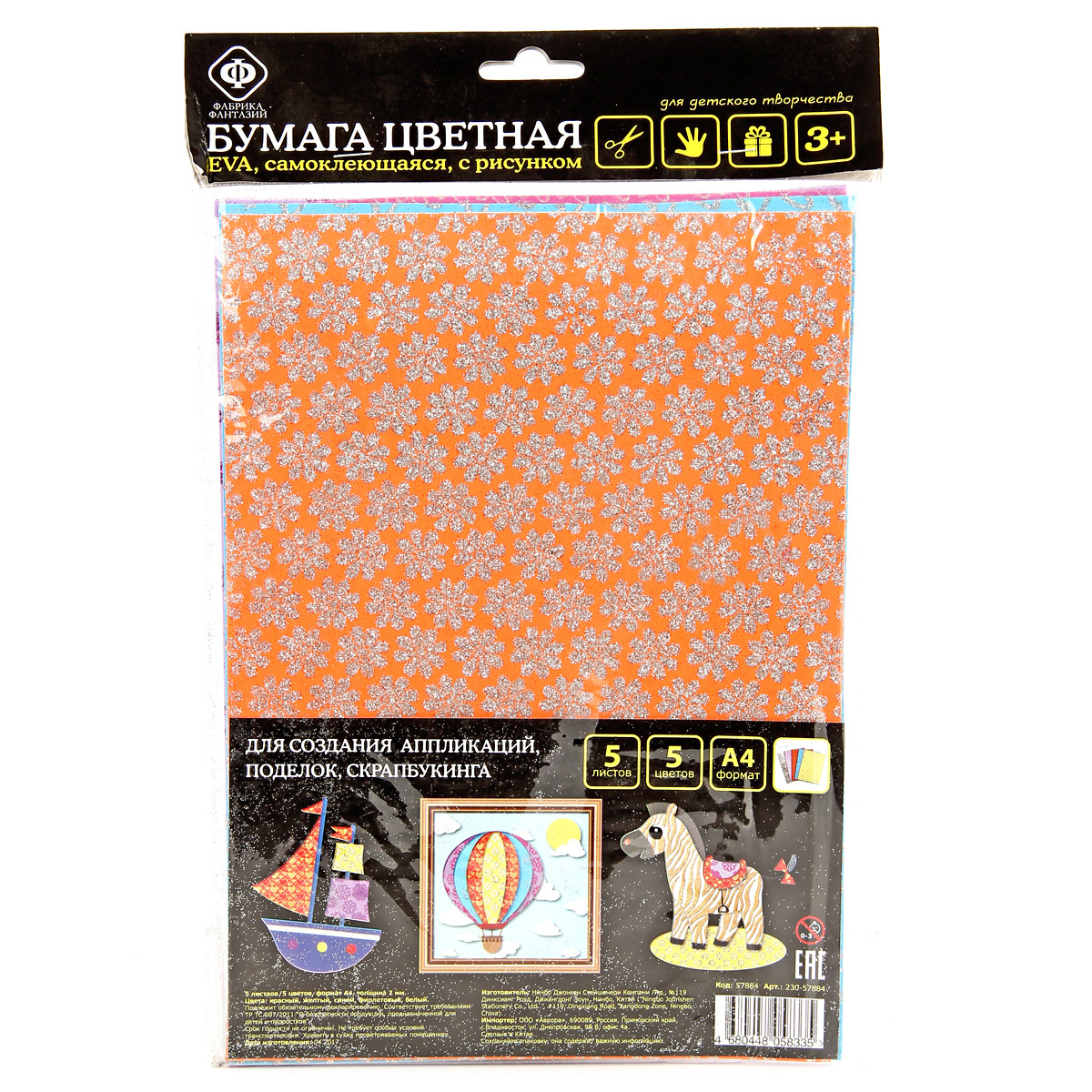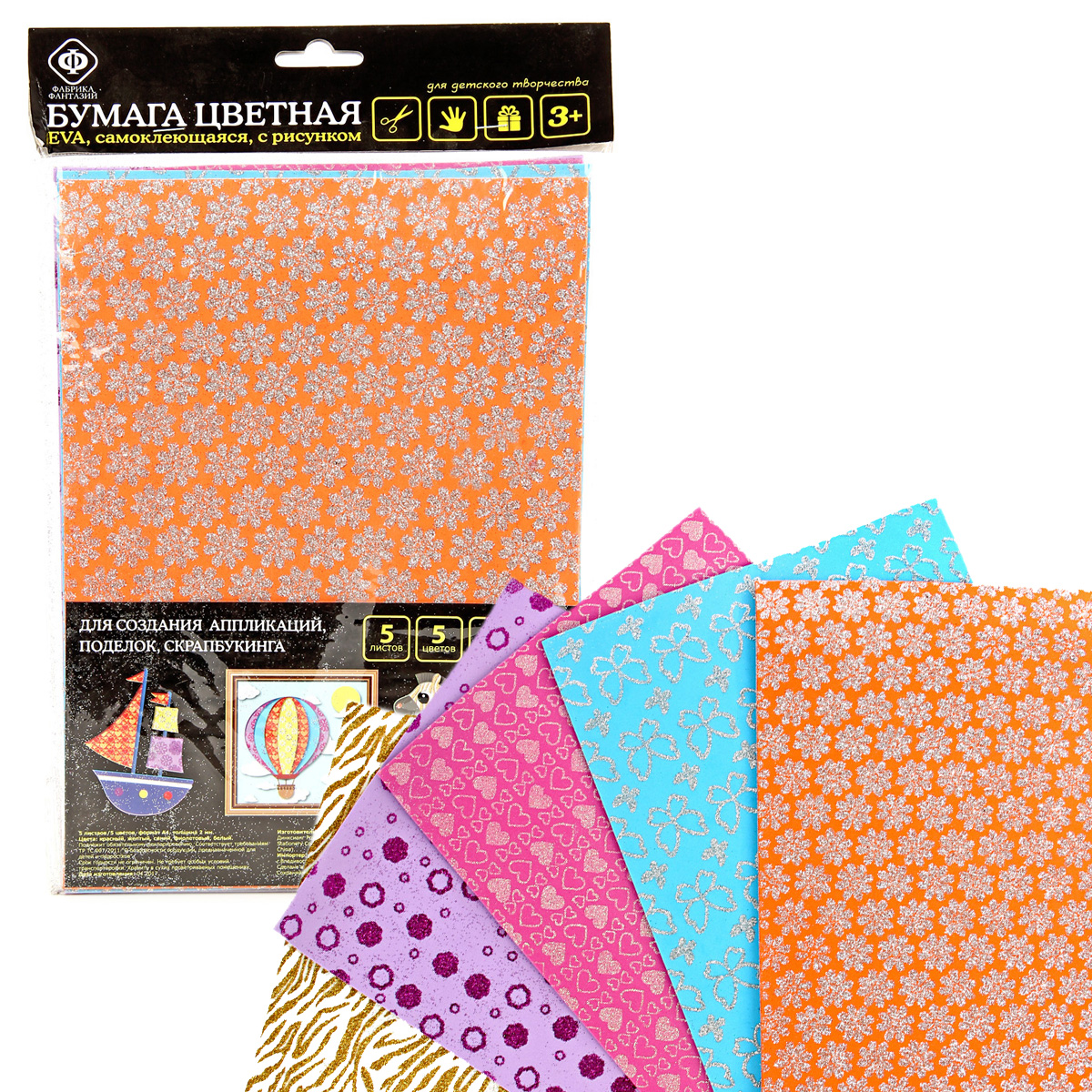 Бумага цветная самоклеящаяся с рисунком EVA, 5 л./5 цв., формат А4, толщина 2мм. Цвета: красный, желтый, синий, фиолетовый, белый.