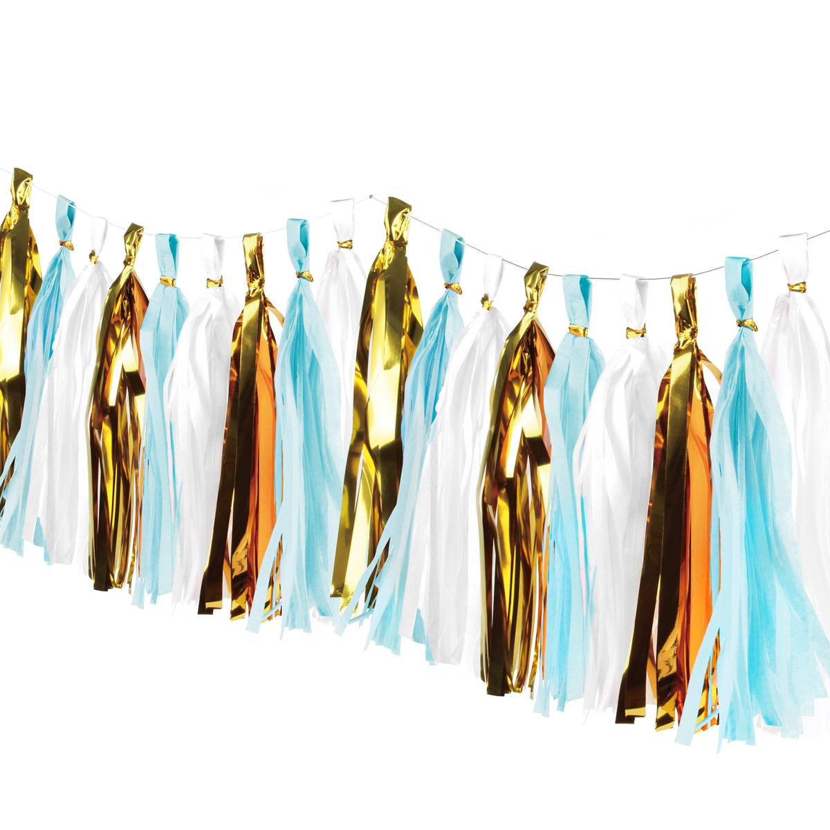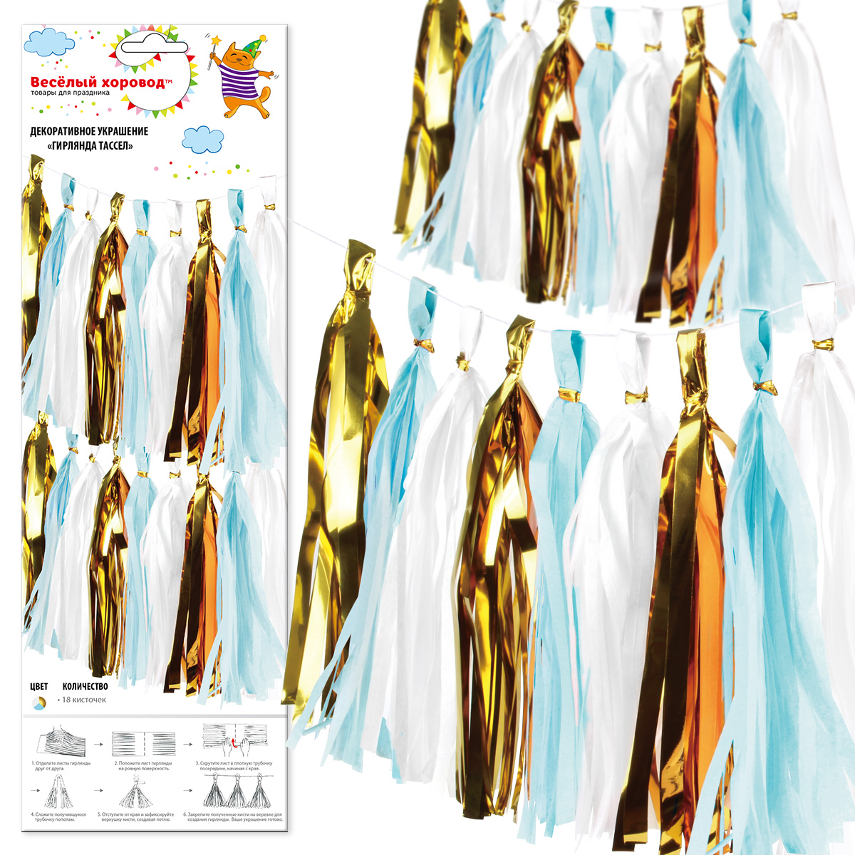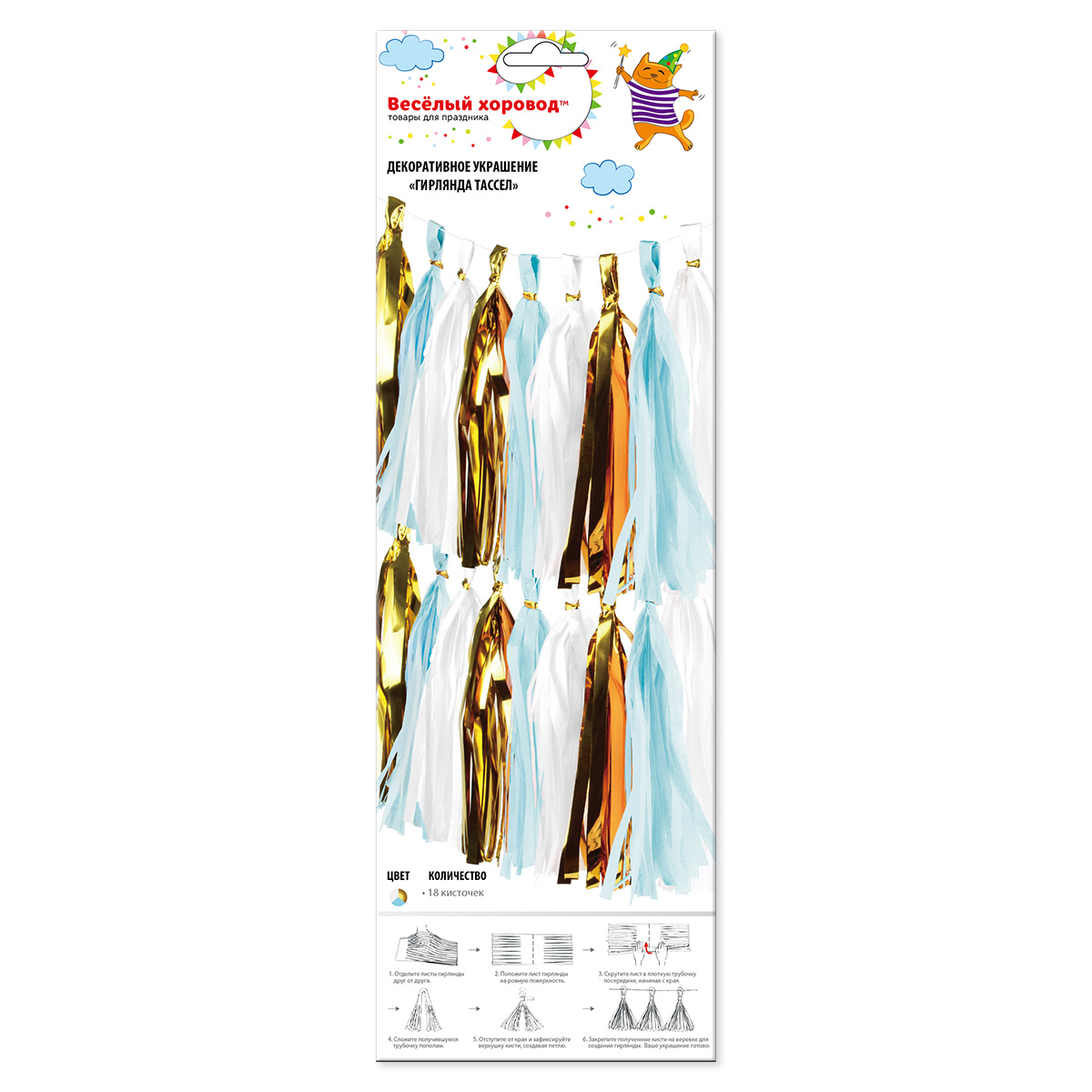 Гирлянда тассел - оригинальное украшение для праздничного декора помещения. В комплект входят 6 листов белого цвета, 6 листов голубого цвета, 6 листов из фольги золотого цвета, веревочка и зажимы для скрепления кисточек. Принципы сборки гирлянды тассел: - отделите листы гирлянды друг от друга; - положите лист гирлянды на ровную поверхность; - скрутите лист в плотную трубочку посередине, начиная с края; - сложите получившуюся трубочку пополам; - отступите от края и зафиксируйте верхушку кисти зажимом, создавая петлю; - закрепите полученные кисти на веревке для создания гирлянды, украшение готово (получится 18 кисточек). Размещая кисточки в разном порядке на веревочке, можно создавать интересные эффекты декора. При желании кисточки можно снять с веревки и прикрепить их к шарикам, что тоже будет выглядеть очень красиво. Разноцветные кисточки гирлянды тассел помогут создать праздничное настроение и стильно украсить помещение к любому торжеству. Набор изготовлен из бумаги, фольги и текстильного материала, упако