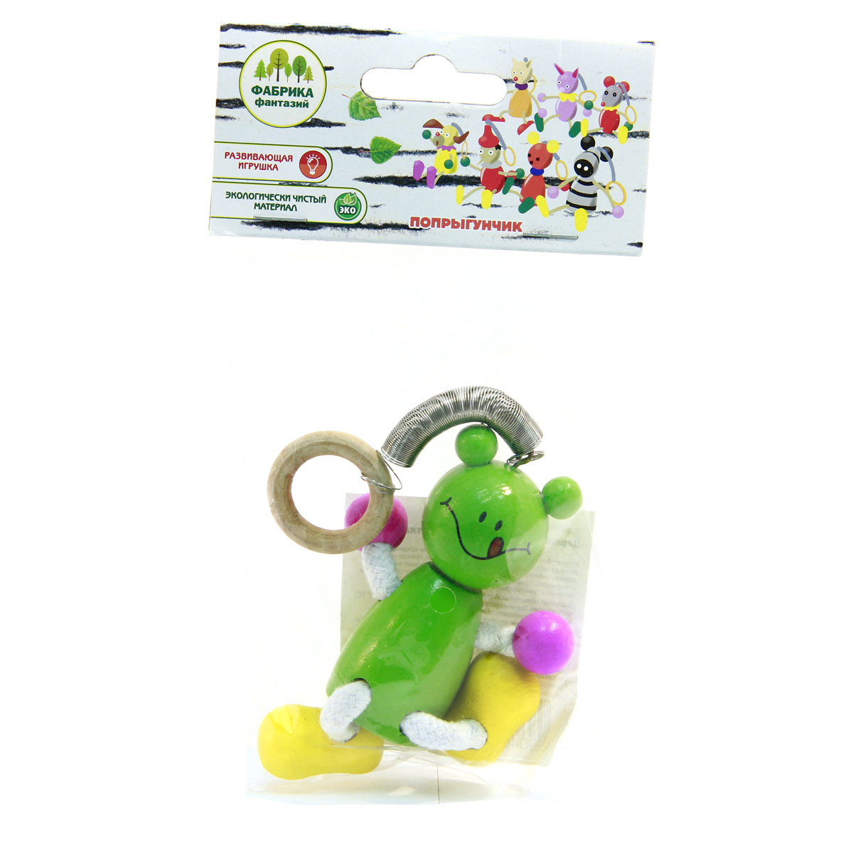 Попрыгунчик - забавная и очень интересная игрушка на пружинке. У попрыгунчика есть колечко, которое можно надеть на пальчик и потянуть игрушку вниз - попрыгунчик подпрыгнет вверх, принимая первоначальное положение. Все детали игрушки очень качественно обработаны, не имеют острых углов, сколов и зазубрин. Яркие цвета попрыгунчика обязательно привлекут внимание ребенка. Игрушка отлично развивает ловкость, сноровку, координацию движений и мелкую моторику ручек. Игрушка представлена в ассортименте. Игрушка изготовлена из экологически чистого дерева, есть элементы металла и текстиля, упакована в пакет с картонным хедером с отверстием. Размеры игрушки: 7*3*15,5 см. Размеры игрушки в упаковке: 10*3*16,5 см.