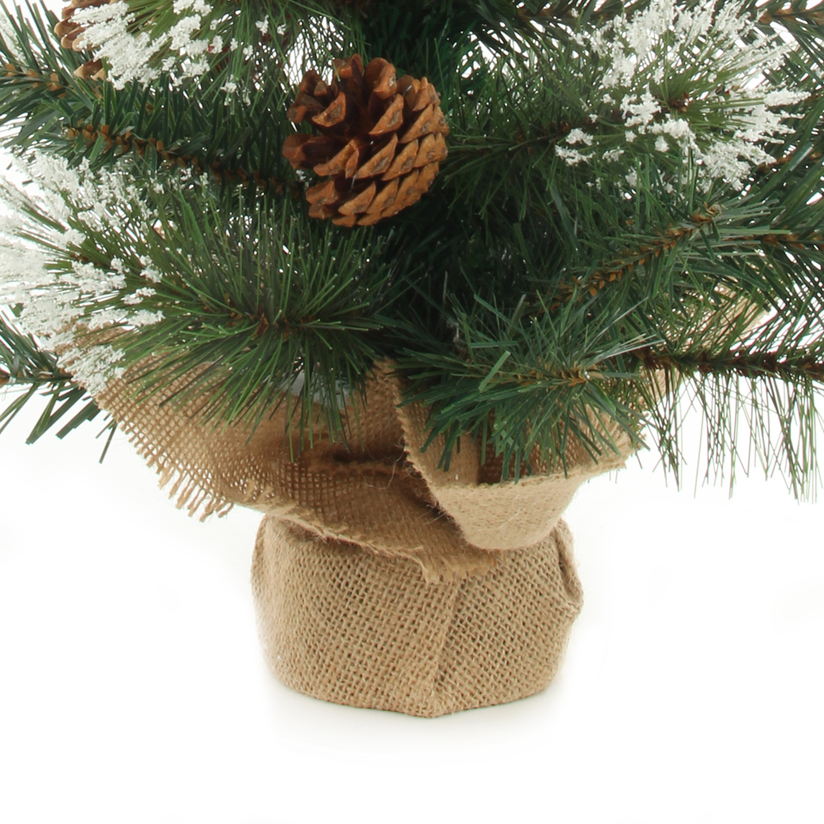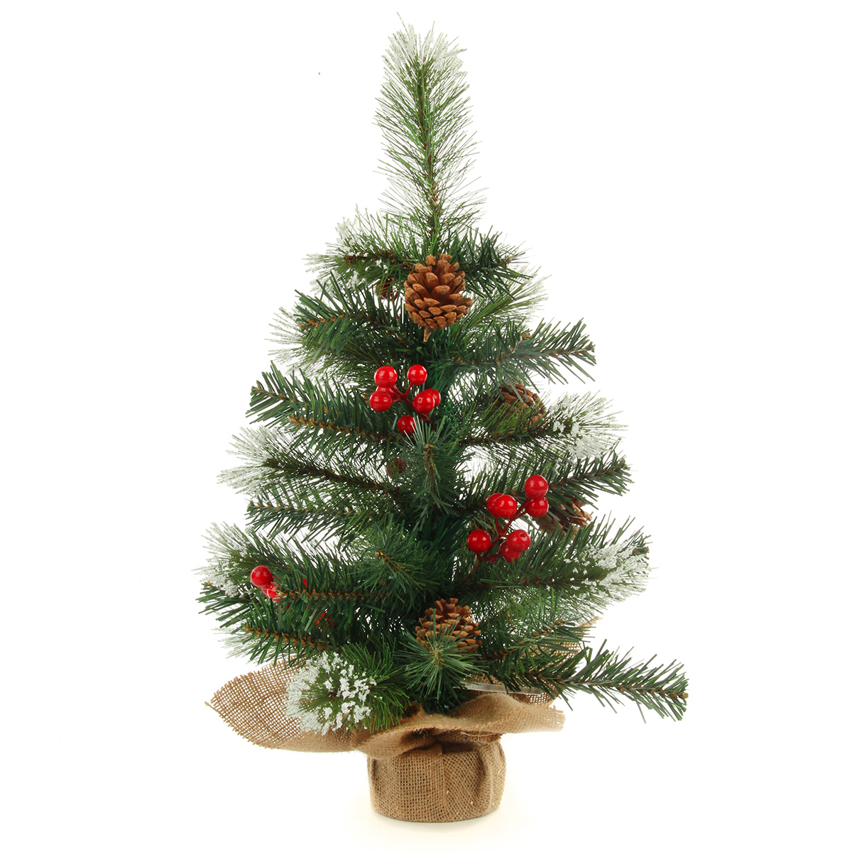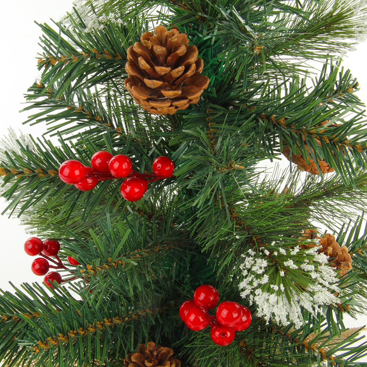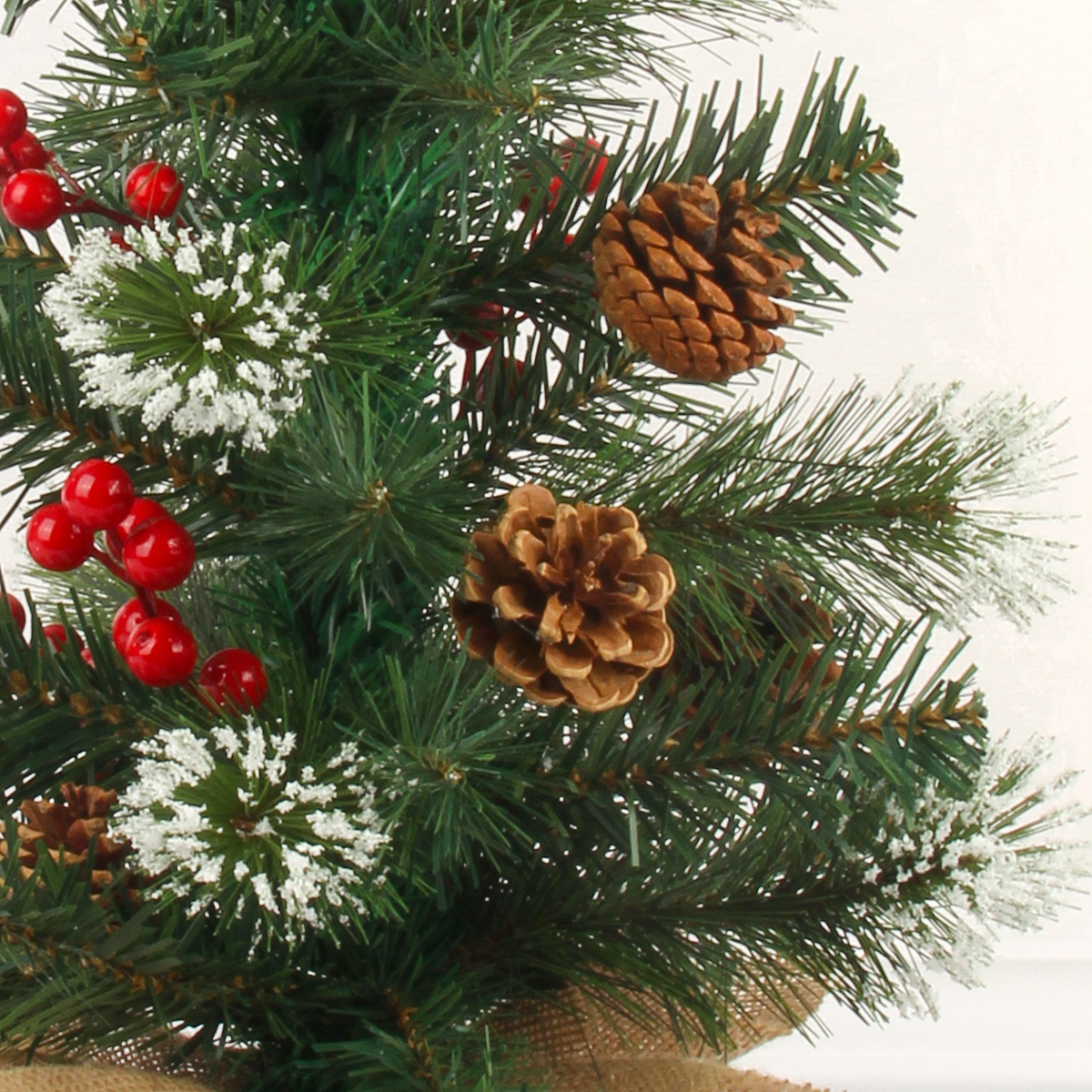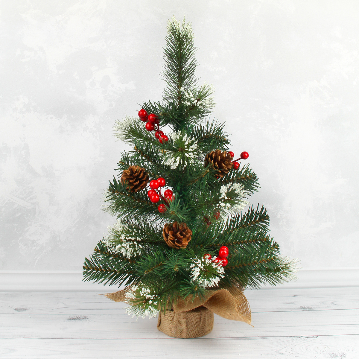 Искусственная елка для праздника декорирована настоящими шишками и украшениями в виде веточек ягод, есть пенопласт, имитирующий искусственный снег. Новогоднее украшение компактных размеров устойчиво стоит на подставке. Лапки рождественской елки гнутся в разные стороны.