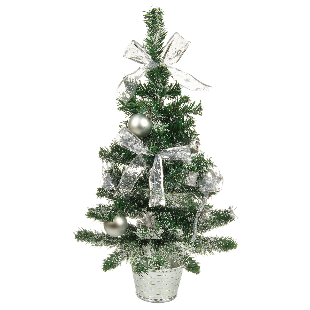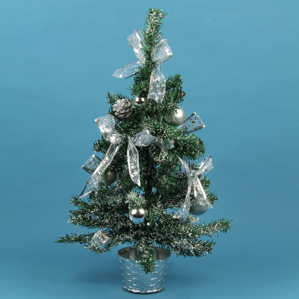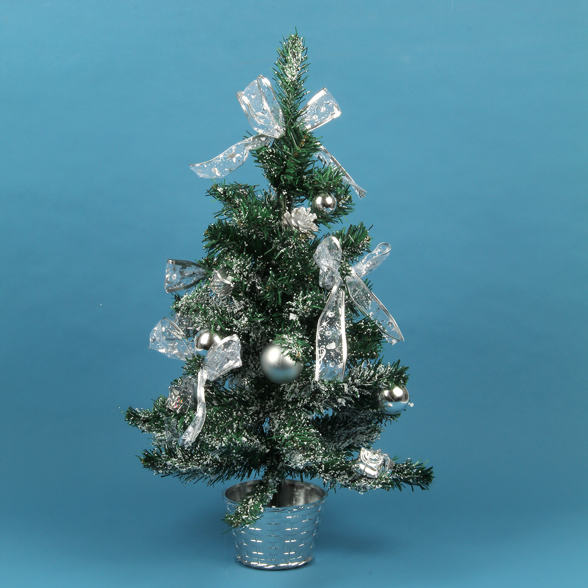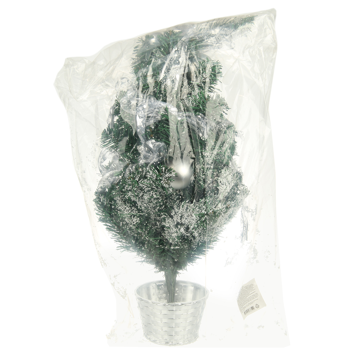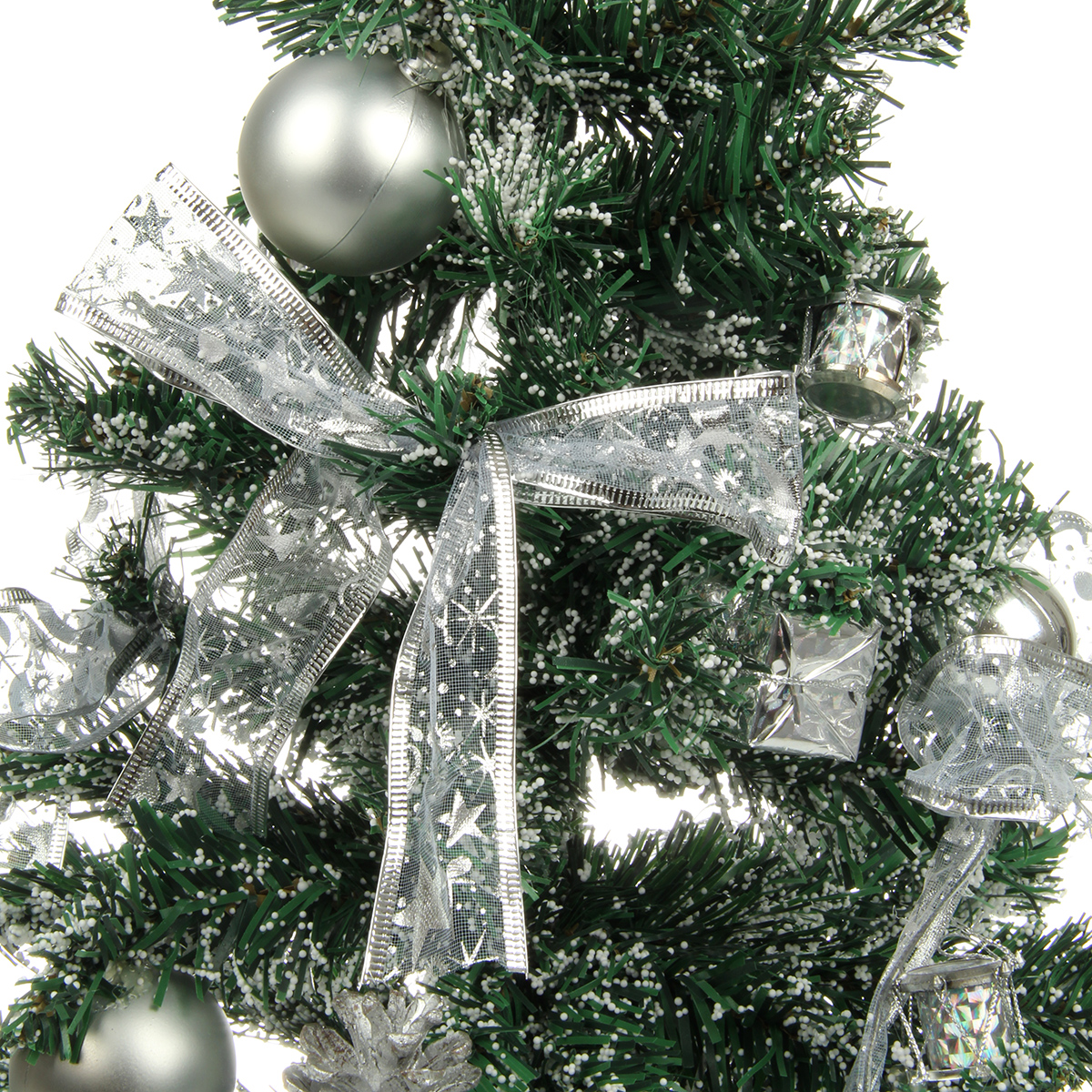 Новогодняя ель компактных размеров, красивая, декорирована в серебряной гамме бантиками, матовыми шарами и шарами с блестками, цветами, барабанами и ягодами. Устойчиво стоит в подставке.