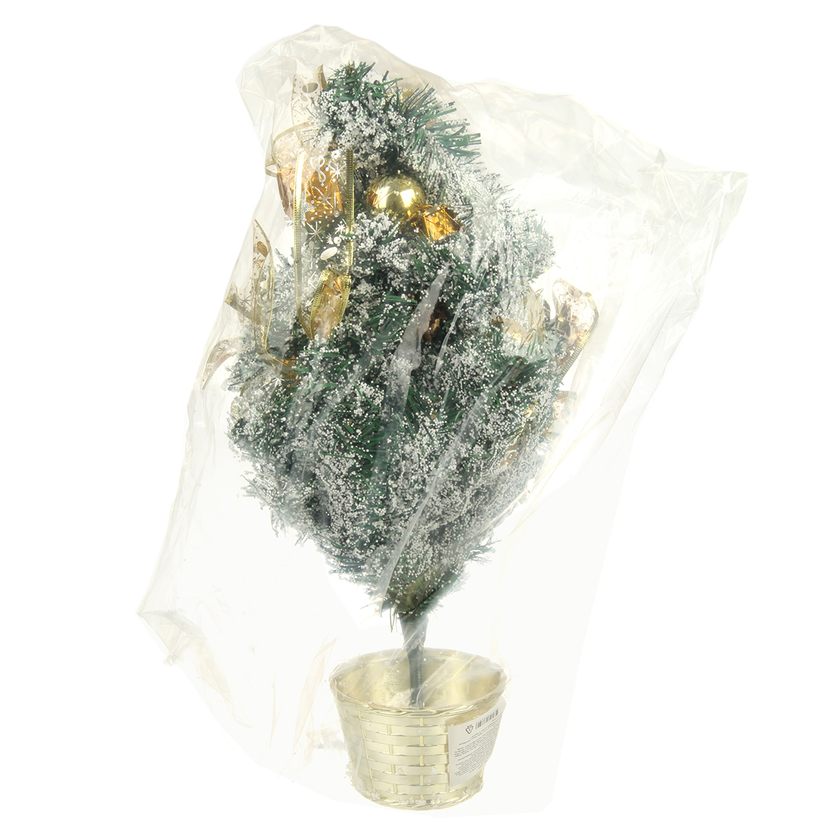 Новогодняя ель компактных размеров, красивая, декорирована в золотой гамме бантиками, шарами, бабочками, подарочками и ягодами. Устойчиво стоит в подставке.