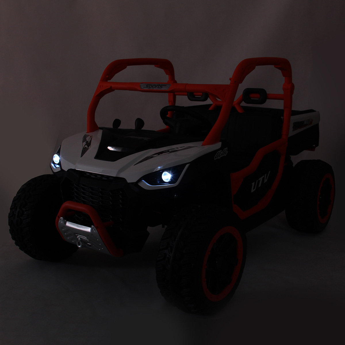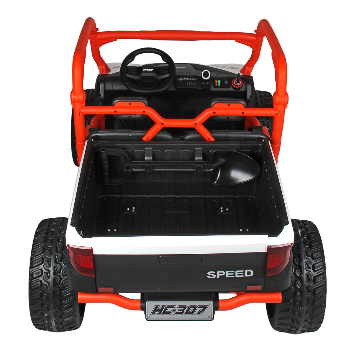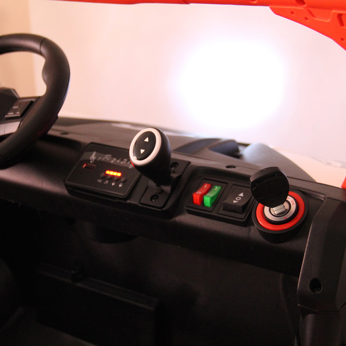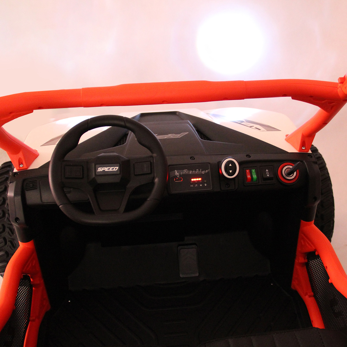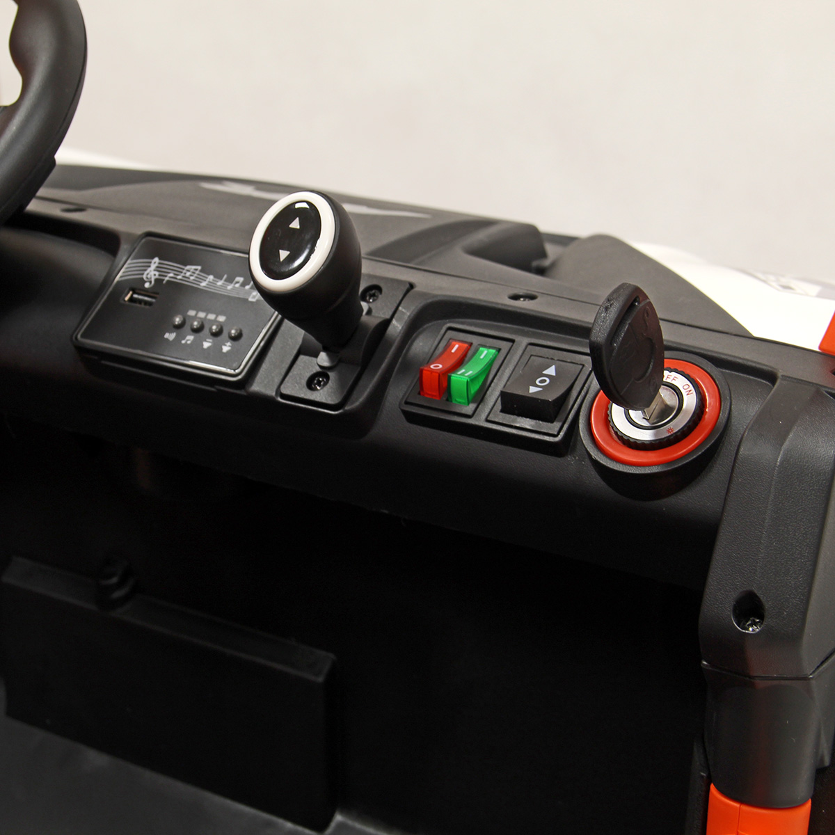 Электромобиль детский на пульте управления с широким функционалом, светом и звуком точно понравится юному автолюбителю. Изготовлен из прочных и долговечных материалов. Оформлен в реалистичном дизайне. В комплекте игрового набора детали для сборки электромобиля, пульт управления, зарядное устройство, лопата, 2 ключа зажигания, инструкции на русском и английском языках. Поворачиваем ключ зажигания, игрушечный транспорт издаст звук заводящегося двигателя. Есть подсветка передних фар и индикатора зарядки. Имеет USB разъем. Можно переключать режимы плейера. Проигрывает треки с внешнего источника или встроенные 4 трека. Телефона подключается через Bluetooth и с помощью провода. Регулируемая громкость. Кузов поднимается и опускается с помощью рычага под сиденьем. Есть отключение подсветки фар и переключение скорости. При нажатии на педаль автомобиль едет вперед или назад. Едет, пока жмем педаль. Управление рулём. Нажимаем на руле левую кнопку, проигрывает треки, правую звуки гудка. Имеет полный привод. Пульт управления подключается нажатием на круглую кнопку. Пуль управления осуществляет движение во все стороны. Поворачивают передние колеса. Блокировка колес. Двухместный салон. 2 ремня безопасности. Рамы поднимаются, запирающий механизм. Такая детская большая машина на аккумуляторе станет замечательным подарком детям на новый год, день рождения и на любой другой повод. Озвучка английская. Подходит для детей старше 3 лет. Работает от аккумулятора 24V7AH. Управление колесами и рулём за счет 5 моторов 75W. Зарядное устройство АС100 240V. Зарядное устройство, аккумуляторы и моторы в комплекте. Пульт работает от 2 батареек ААА, не входят в комплект. Изготовлено из EVA, экокожи, полимера и металла. Максимальная скорость 8 км в час. Время зарядки электромашины от 8 часов. Время работы 1 час. Частота радиоуправления 2.4 ГГц. Максимальная нагрузка 40 кг. Клиренс 14 см. Размеры электрокара 142х80х77 см. Размеры коробки 116х64х39 см.