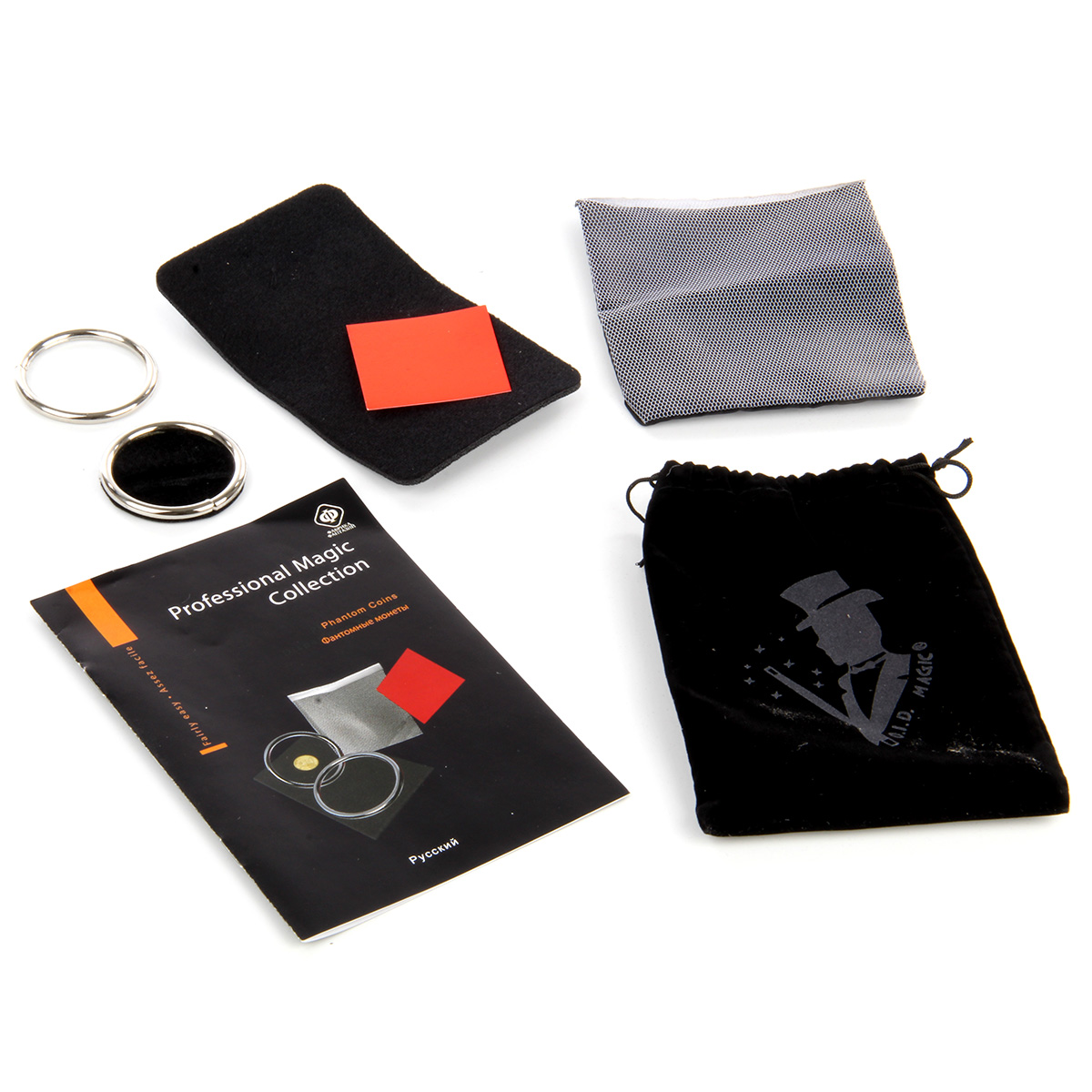 "Описание: Этот набор позволит Вам выполнить четыре сенсационных фокуса. Монета исчезнет из прозрачной сумки, а после появится. Использование двух металлических колец, позволит монете снова исчезнуть, и вновь появиться под стаканом.Состав набора: 2 кольца, бархатный коврик, мешочек, красный бумажный квадрат, бархатный мешочек, диск, инструкцияРазмер упаковки: 15,7х5х15,7 см" Видео: