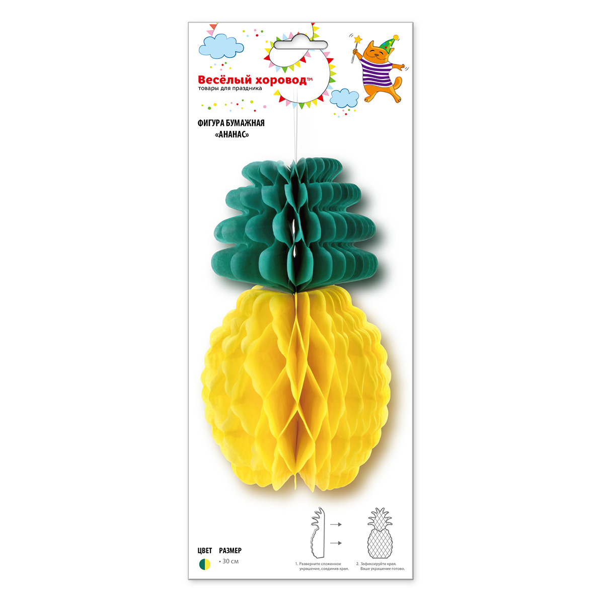 Бумажное украшение в виде фигурки ананаса - очень красивый, яркий и модный элемент для декора помещения. Легко раскладывается и складывается, поставляется в сложенном виде. В комплект входят украшение-ананас и скрепки. Принципы сборки украшения: - разверните сложенное украшение, соединив края; - зафиксируйте края с помощью скрепок. На ананасе есть веревочка-петелька, за которую удобно подвесить украшение. С помощью бумажных фигурок можно украсить не только интерьер, но и арки, шатры, праздничные столы. Фигурка-ананас изготовлена из картона, бумаги и текстильного материала, упакована в пакет. Высота разложенной фигурки: 30 см. Размеры украшения в упаковке: 15*0,5*34 см.