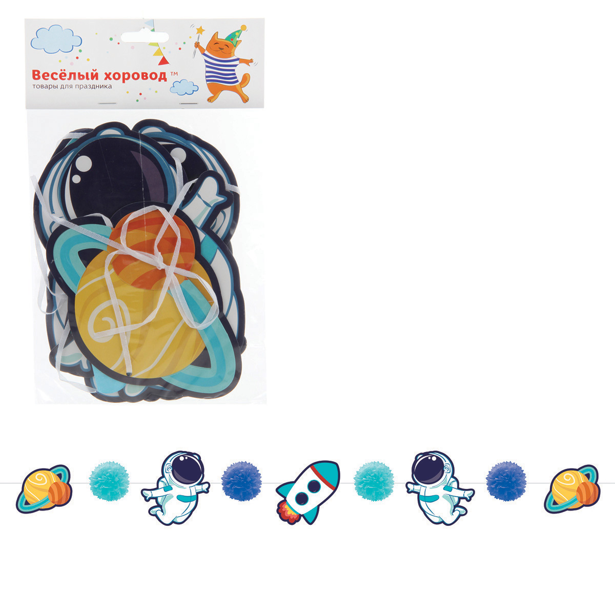 Серия товаров для праздника "Космос" - это то, что необходимо для хорошего настроения и весёлой атмосферы праздника! Очень красивая и яркая гирлянда "Космос"! Такая гирлянда прекрасно украсит банкетный зал или домашний интерьер! Элементы гирлянды крепятся между собой с помощью красивой веревочки. Вуаля, незаменимый атрибут для празднования любого мероприятия готов! Гирлянда упакована в пакет с картонным хедером с отверстием. Длина гирлянды: 2,5 м. В нашей серии собраны самые необходимые предметы сервировки стола и украшения помещения в единой тематике: тарелочки, стаканчики, колпаки, салфетки, набор свечей, гирлянда, украшения для праздника. С серией "Космос" потрясающий праздник вам будет обеспечен, а оформление стола и украшение помещения станет таким же лёгким и удобным, как и его уборка.