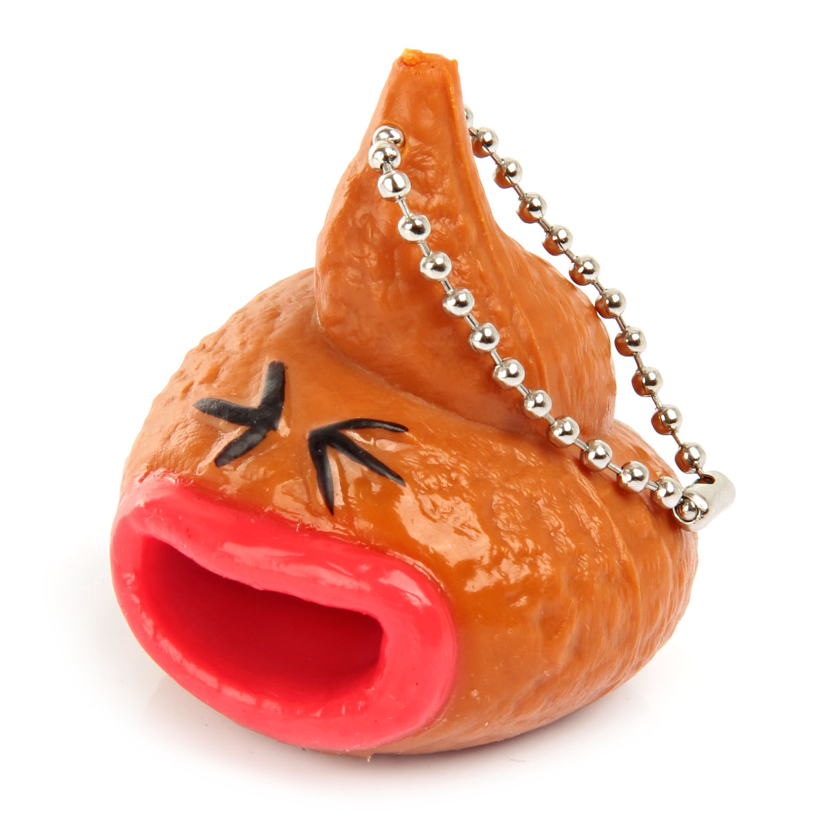 Забавная игрушка-антистресс, показывающая язык и издающая смешной звук при сжатии. Имеется цепочка для подвешивания.