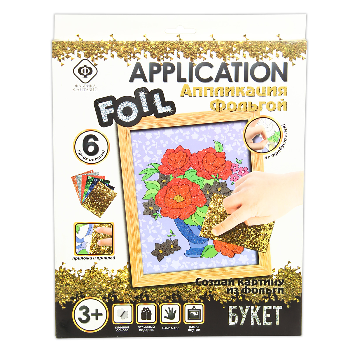 Картина из фольги "Букет" . Состав: картонная рамка и картонная основа с клейким слоем, цветная фольга 6 цв, 12 шт: красный, зеленый, желтый, синий, серебряный, золотой. Развивает мелкую моторику рук и фантазию ребенка. Рекомендован для детей в возрасте от 3 лет. Картонная коробка , размер 24х29х1,5 см. Инструкция на упаковке.