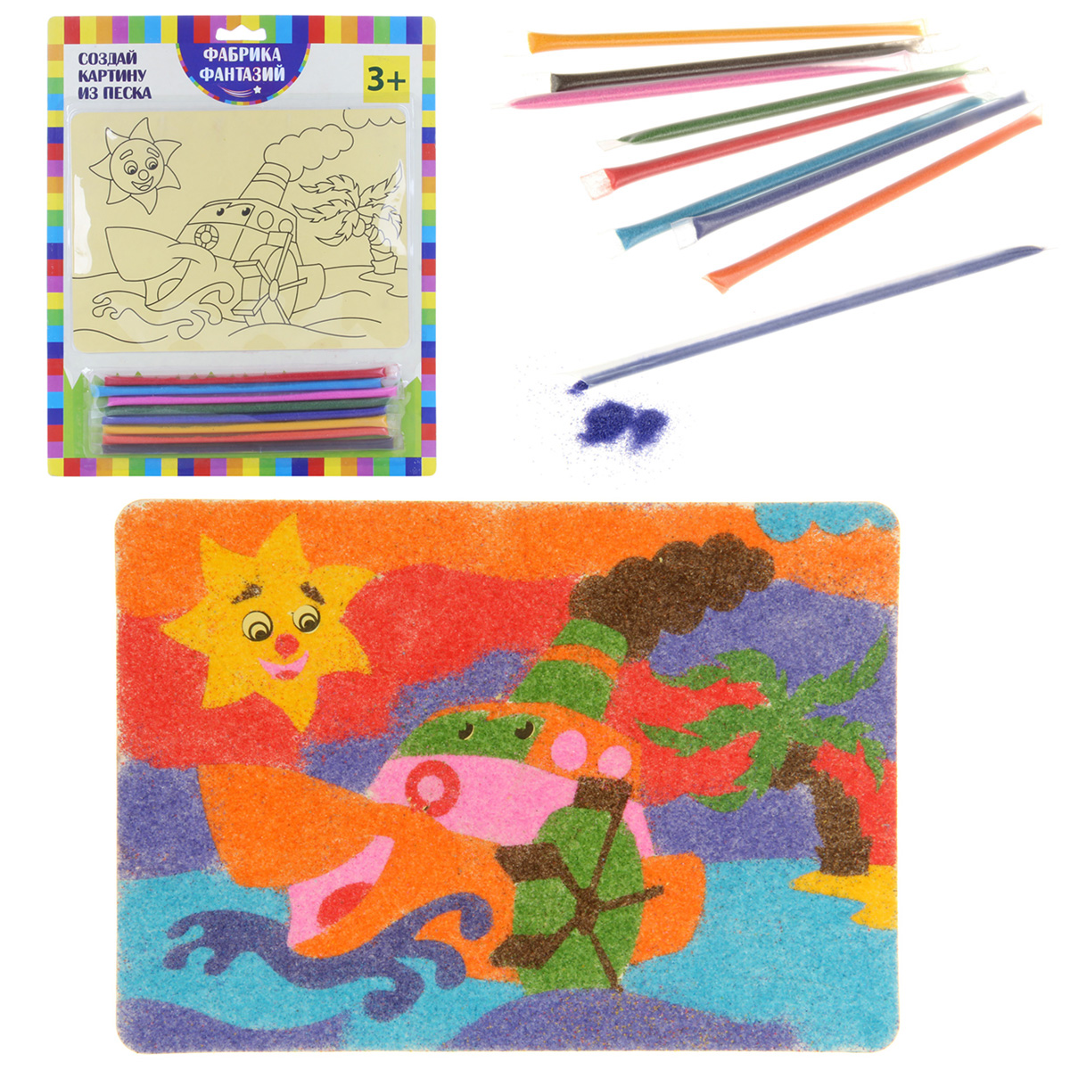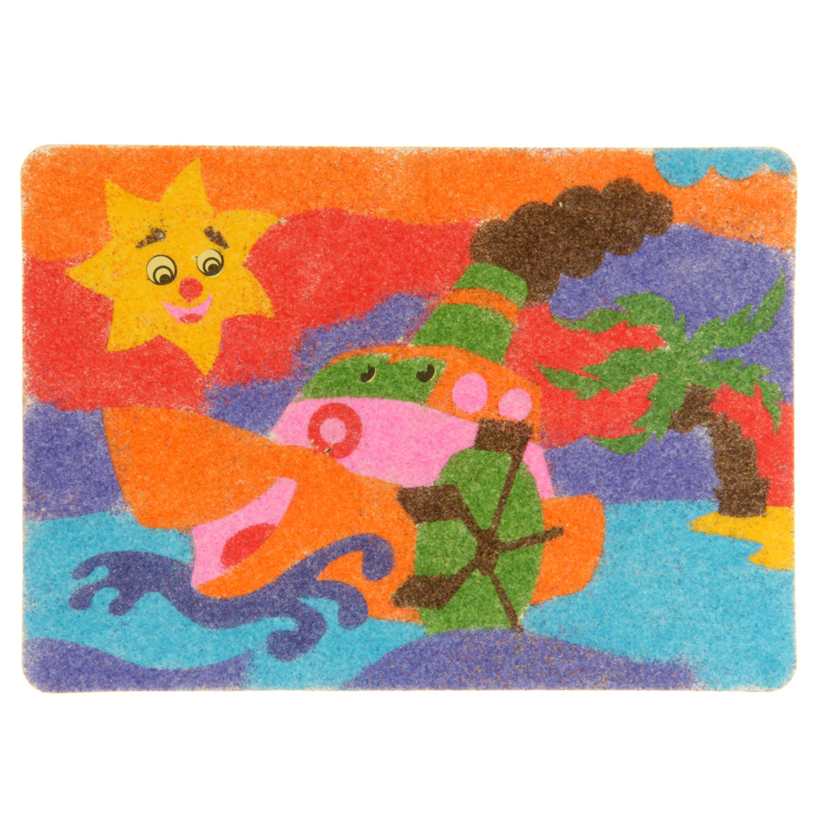 Набор для творчества поможет создать яркую и красочную картину из песка. Очень простой принцип работы, все необходимые элементы в одном наборе. В комплект входят трафарет и трубочки с песком (8 цветов). Принцип работы: - снимите верхний слой бумаги с одной из деталей трафарета. Нижняя часть трафарета липкая; - отрежьте конец пластиковой трубки с песком; - аккуратно засыпьте песком липкую часть трафарета. Песок разного цвета можно смешивать для получения разных оттенков. В 1 трубочке 5 грамм песка. Материалы: бумага, песок. Размеры трафарета: 21*15 см. Размеры в упаковке: 25*1*28 см.
