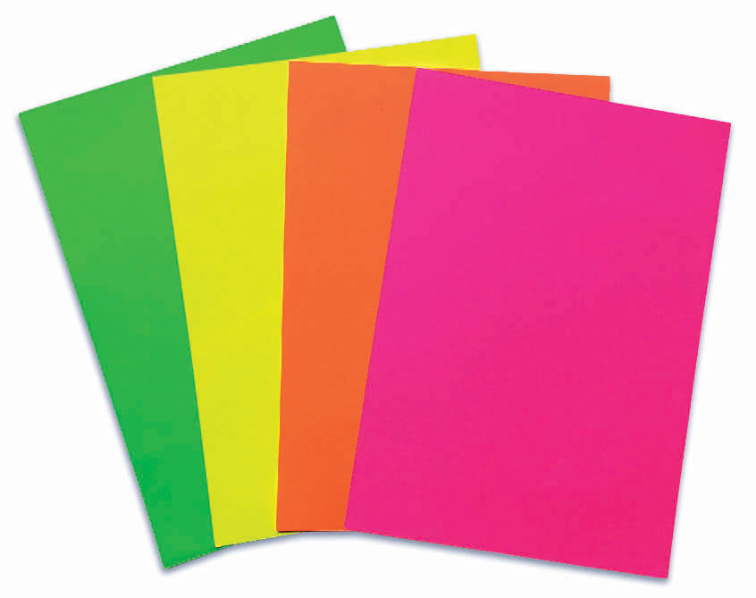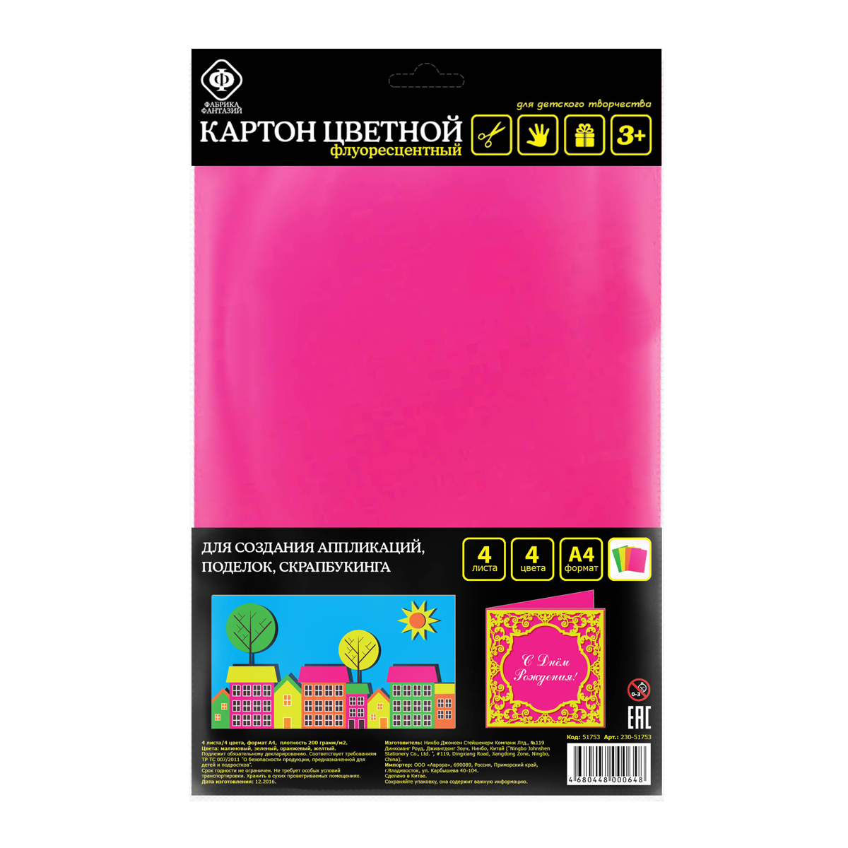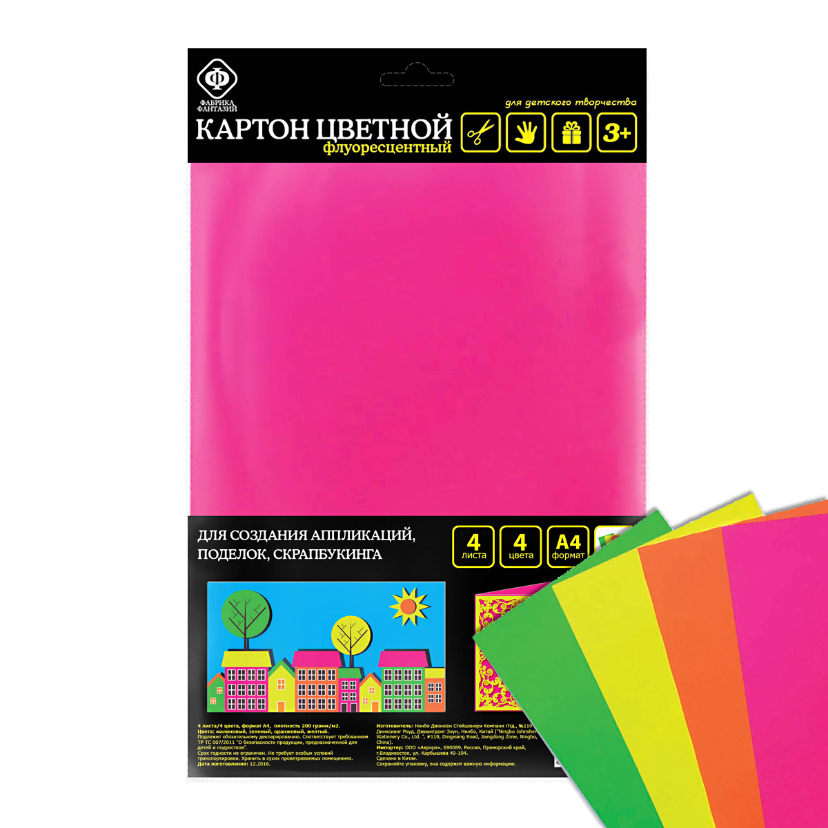Картон флуоресцентный, 4 л./4 цв., формат А4, 200 грамм/ м2. Цвета: малиновый, зеленый, оранжевый, желтый.