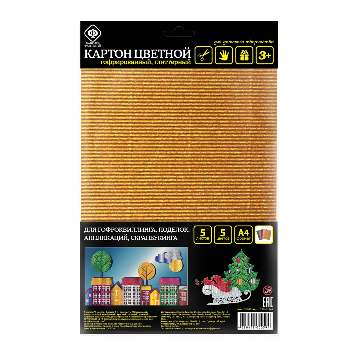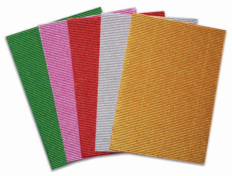 Гофрокартон глиттерный, 5 л./5 цв., формат А4, плотность 280 грамм/ м2. Цвета: золотой, серебряный, красный, розовый, зеленый.