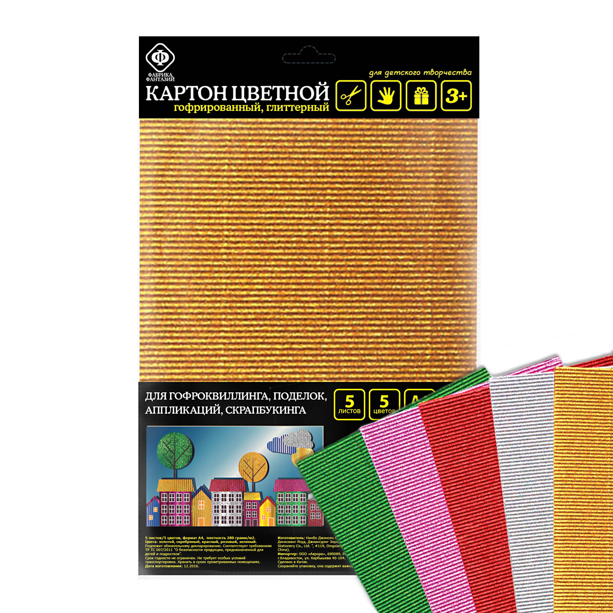 Картон цветной, гофрированный, глиттерный, 5 л./5 цв., А4