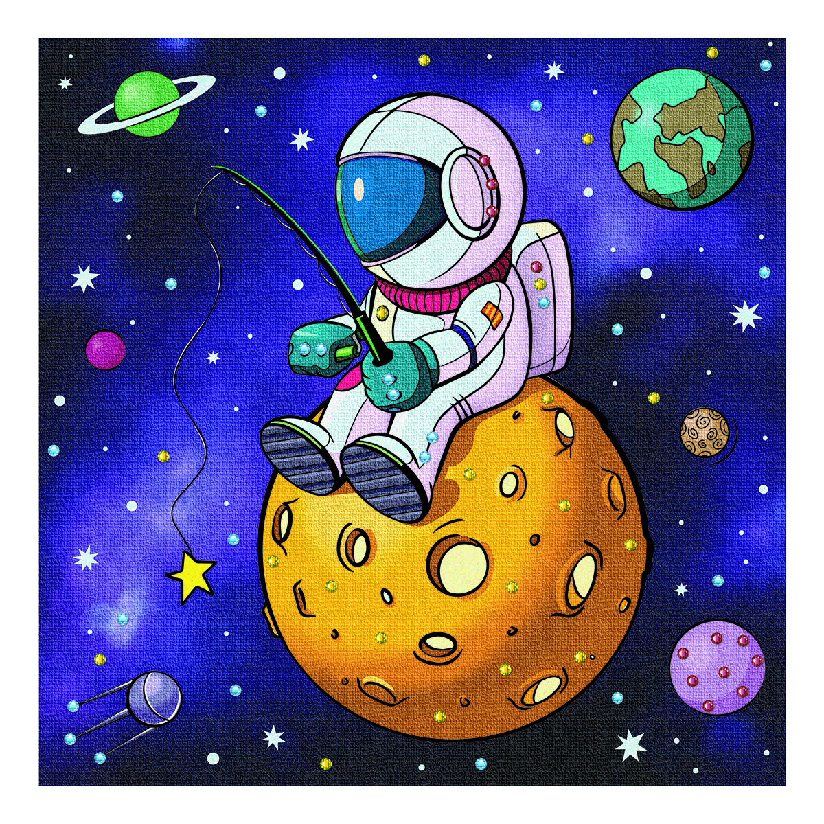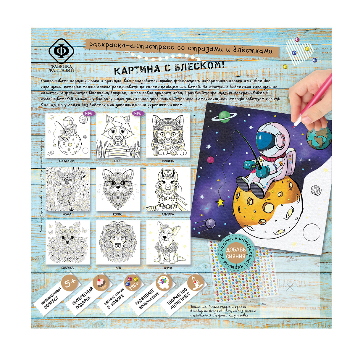 В комплекте: холст с нанесенным контуром и блестками, цветные самоклеющиеся стразы на листе