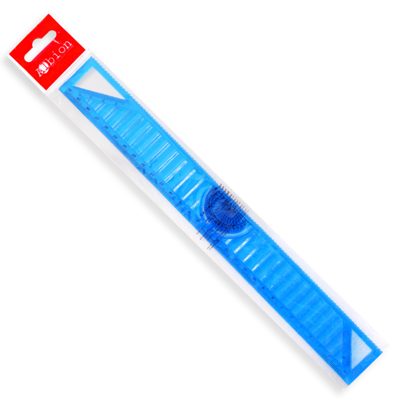 Линейка 30см из гнущегося пластика с мини транспортиром и треугольниками синяя 1 шт/пб