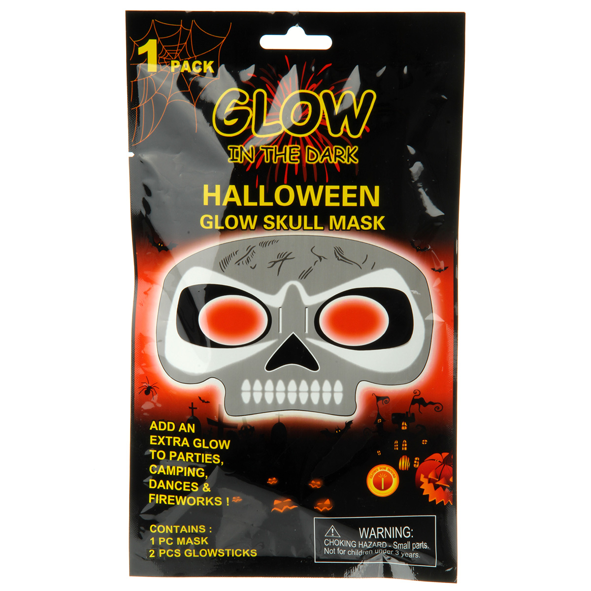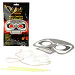 Маска хэллоуиновская светящаяся в форме черепа. Такой аксессуар придаст законченный вид вашему образу и станет незаменимым атрибутом для тематических вечеринок и розыгрышей. В комплект входит маска, 2 светящиеся палочки. Благодаря резинке эту маску сможет носить любой. Размеры упаковки: 14*1*25 см. Размеры карнавальной маски: 18*17*11 см. Размеры светящейся палочки: 15,5*0,5 см. Изготовлено из безопасного полимерного материала.