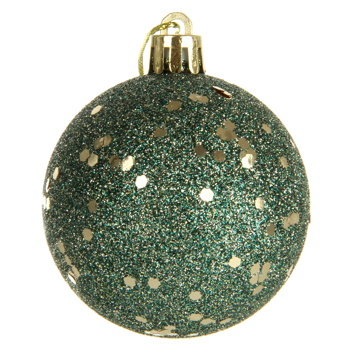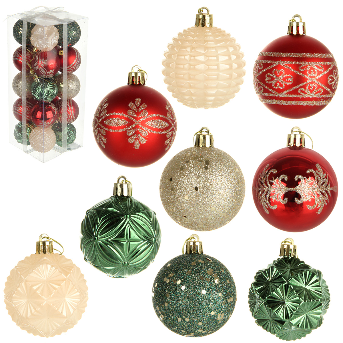 В наборе 20 новогодних шариков для декора. 4 шара изумрудного цвета с фактурной поверхностью, 6 красных матовых шаров с узорами, 2 красных глянцевых шара с узорами, 4 кремовых шара с фактурной поверхностью, 2 серебряных шара, украшенных глиттером, 2 изумрудных шара, украшенных глиттером.