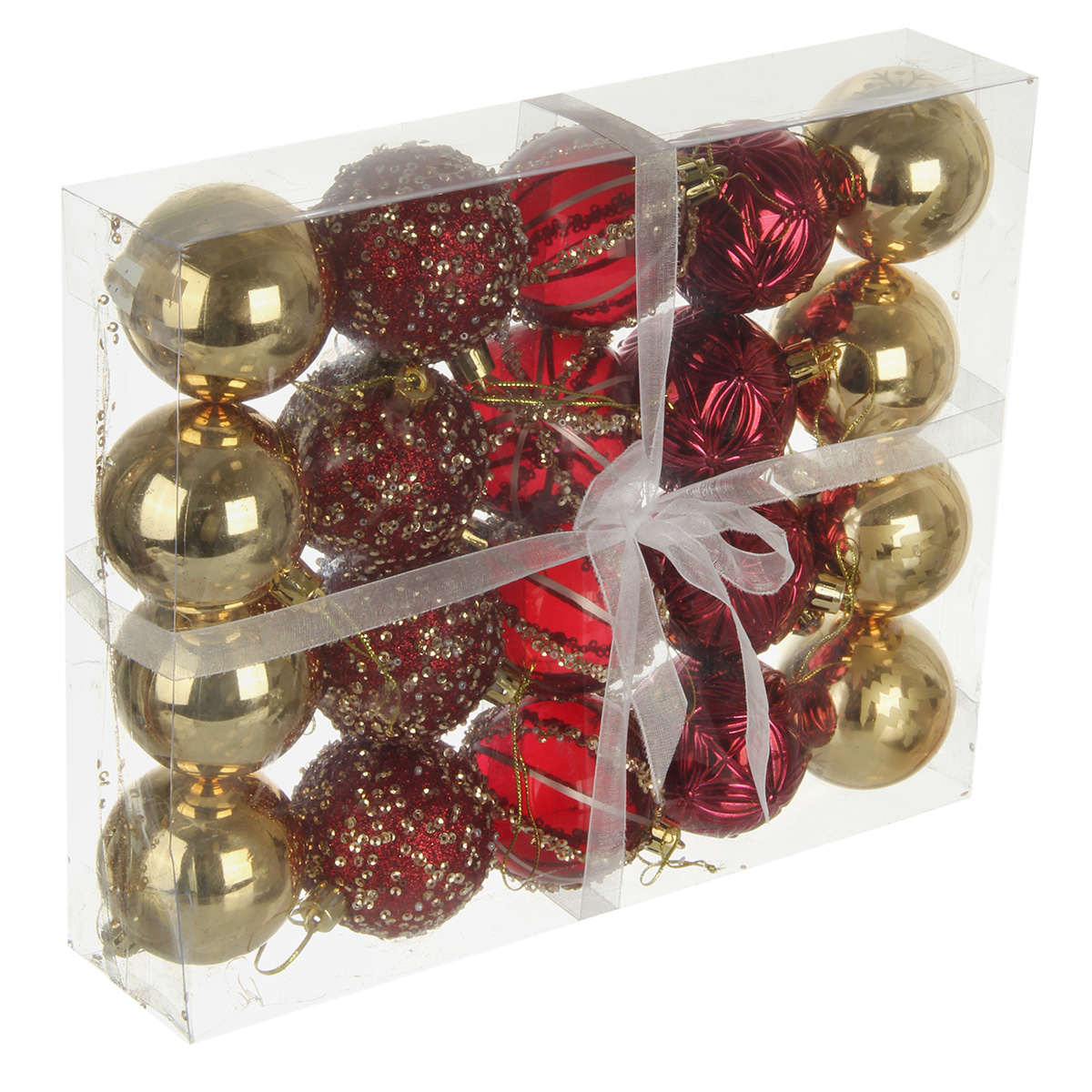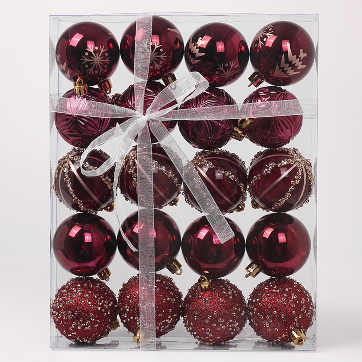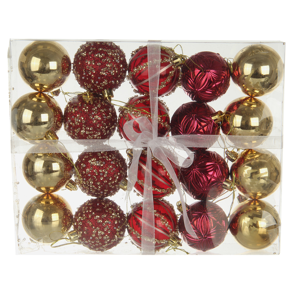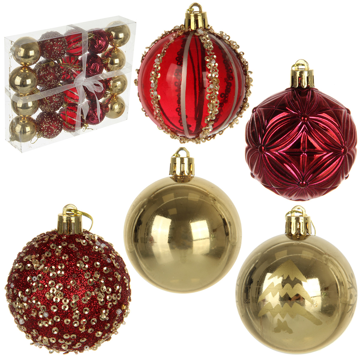 В наборе 20 новогодних шариков для декора. 8 глянцевых шаров золотого цвета, 4 шара цвета бордо с фактурной поверхностью, 4 прозрачных шара цвета бордо, 4 шара цвета бордо, украшенных блестками, пайетками и бисером.