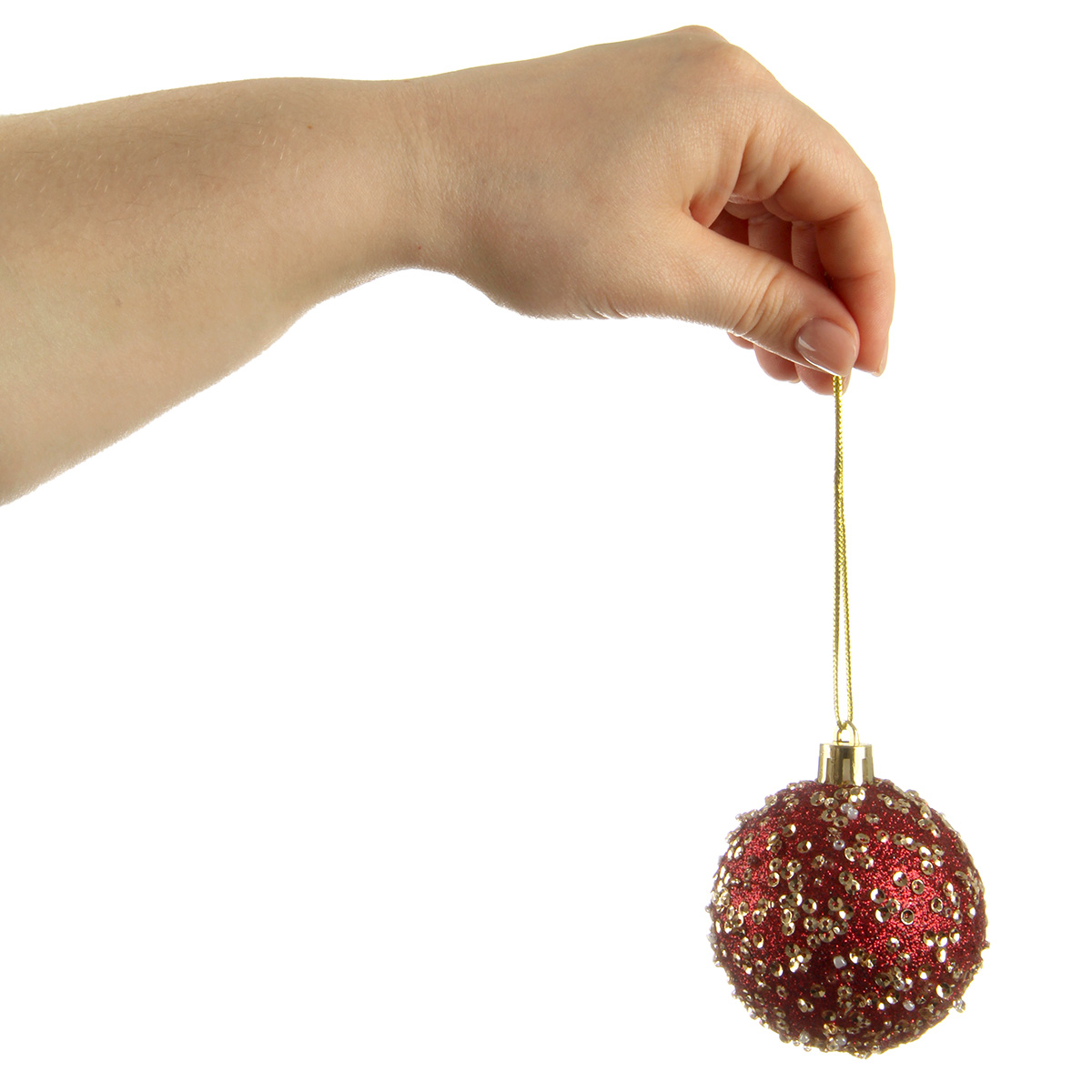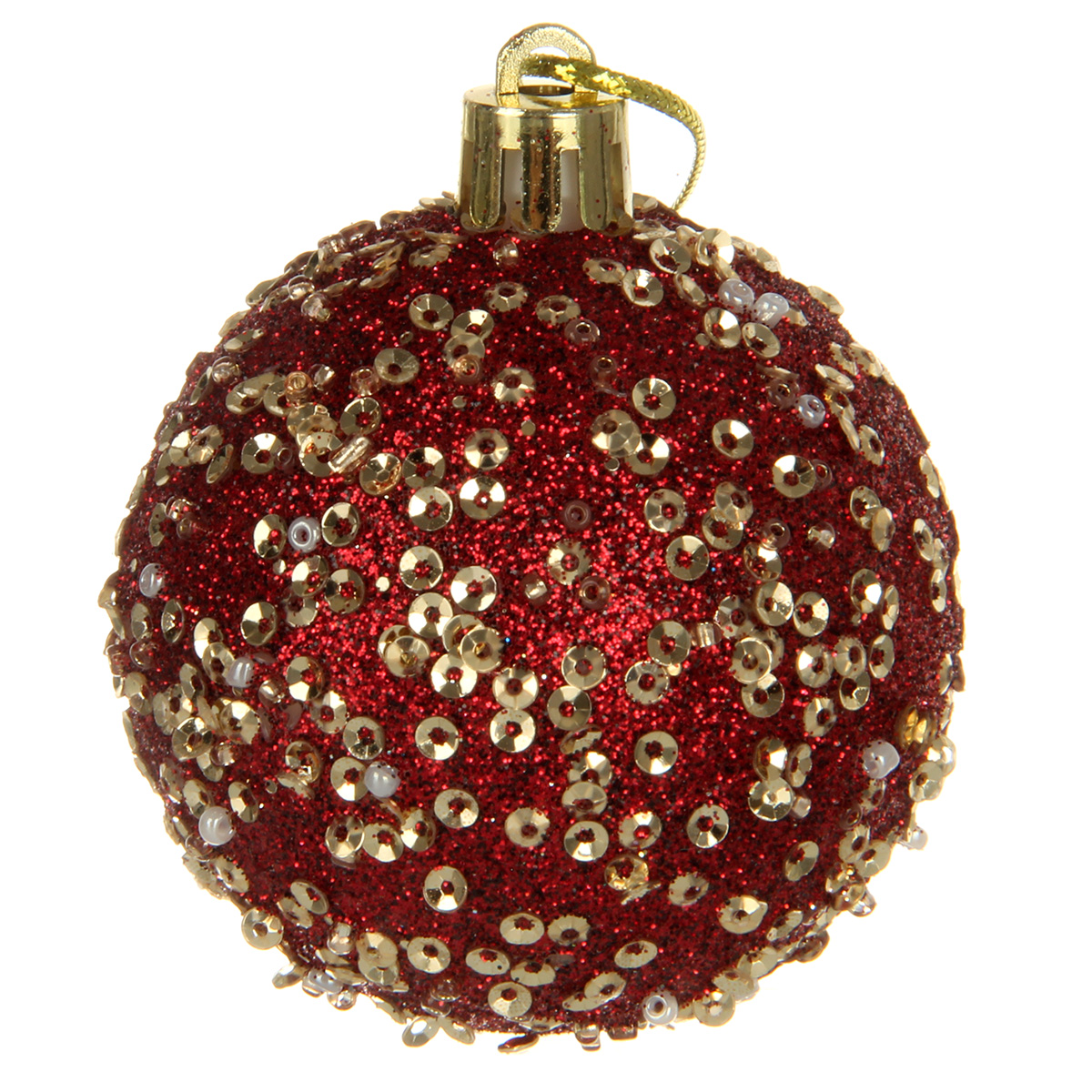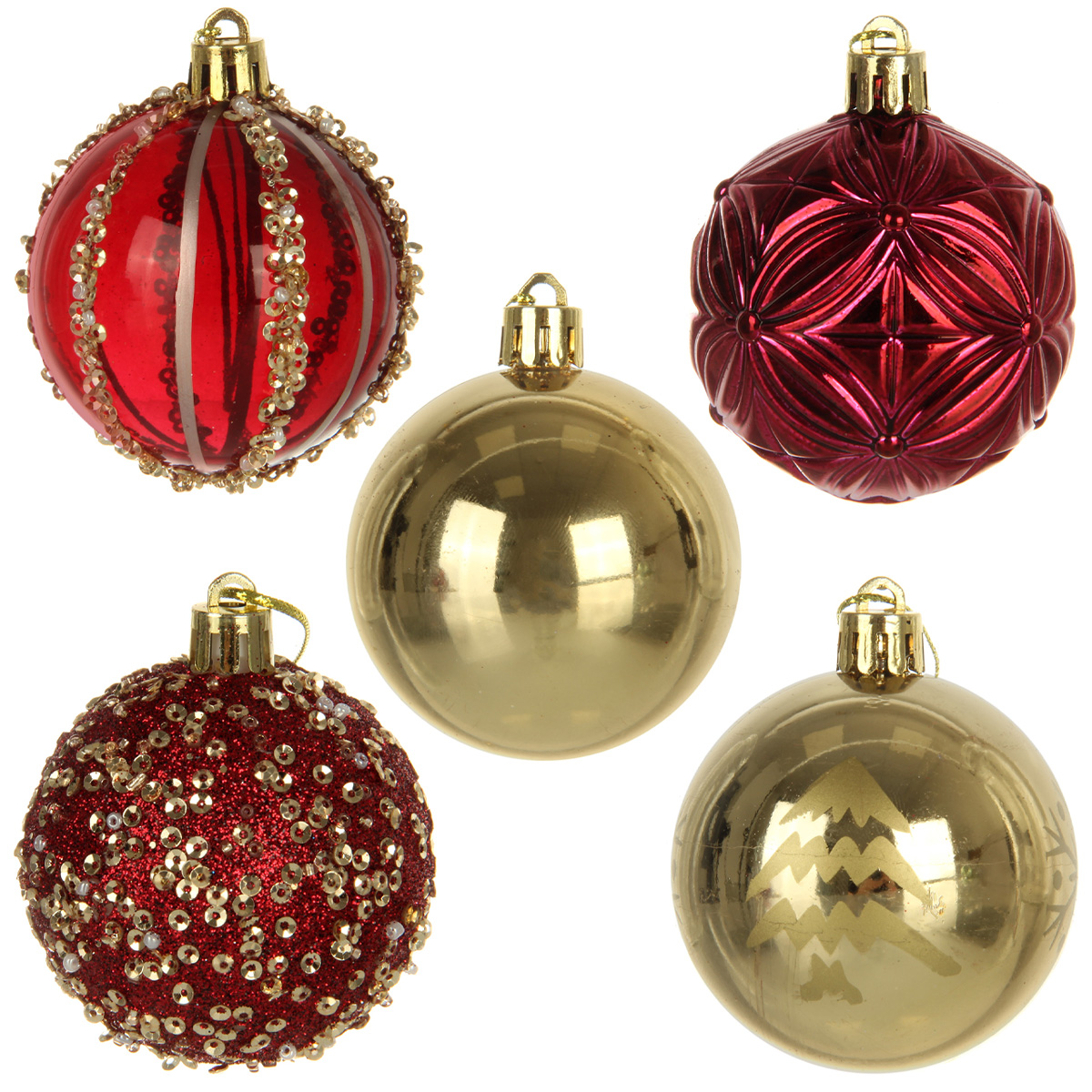 В наборе 20 новогодних шариков для декора. 8 глянцевых шаров золотого цвета, 4 шара цвета бордо с фактурной поверхностью, 4 прозрачных шара цвета бордо, 4 шара цвета бордо, украшенных блестками, пайетками и бисером.