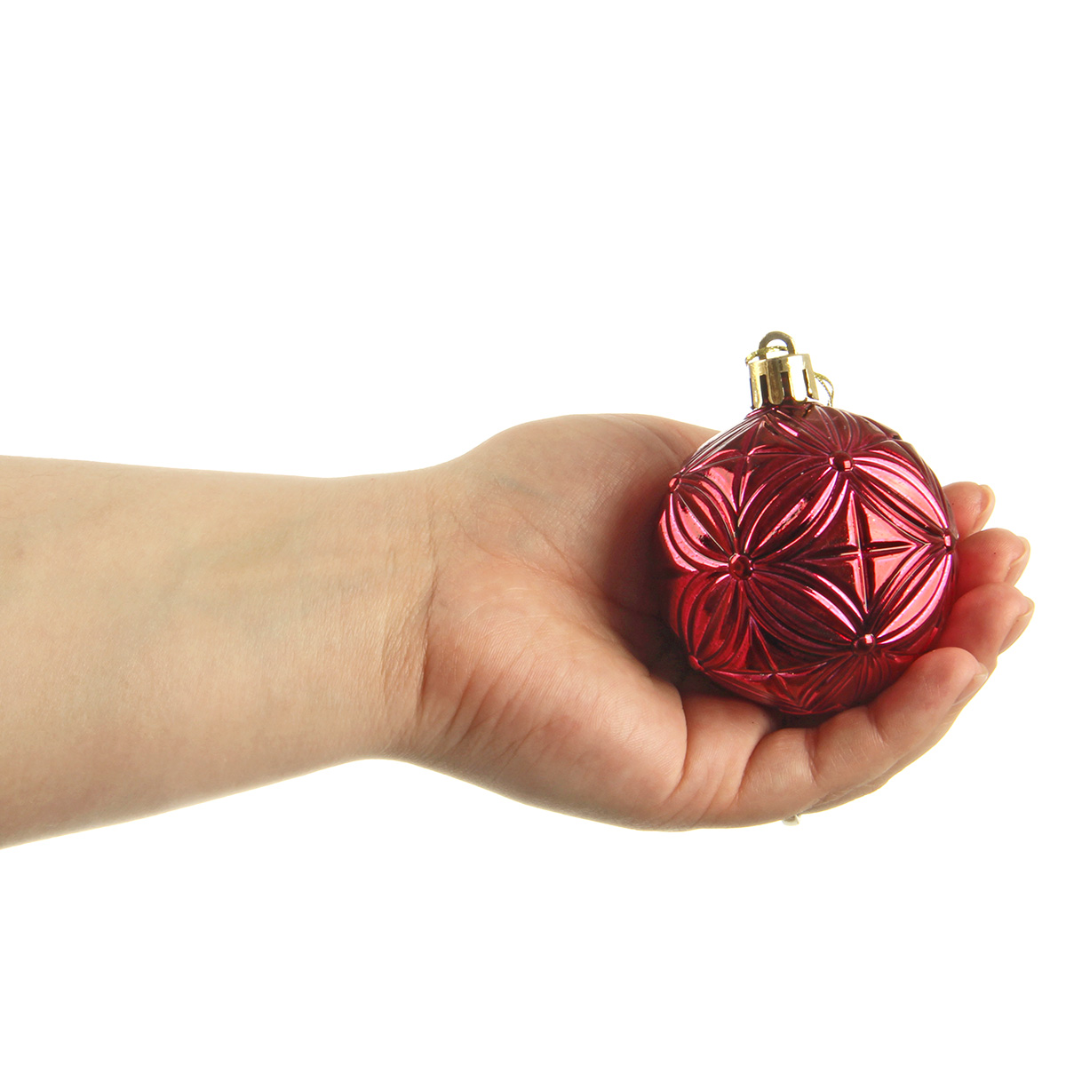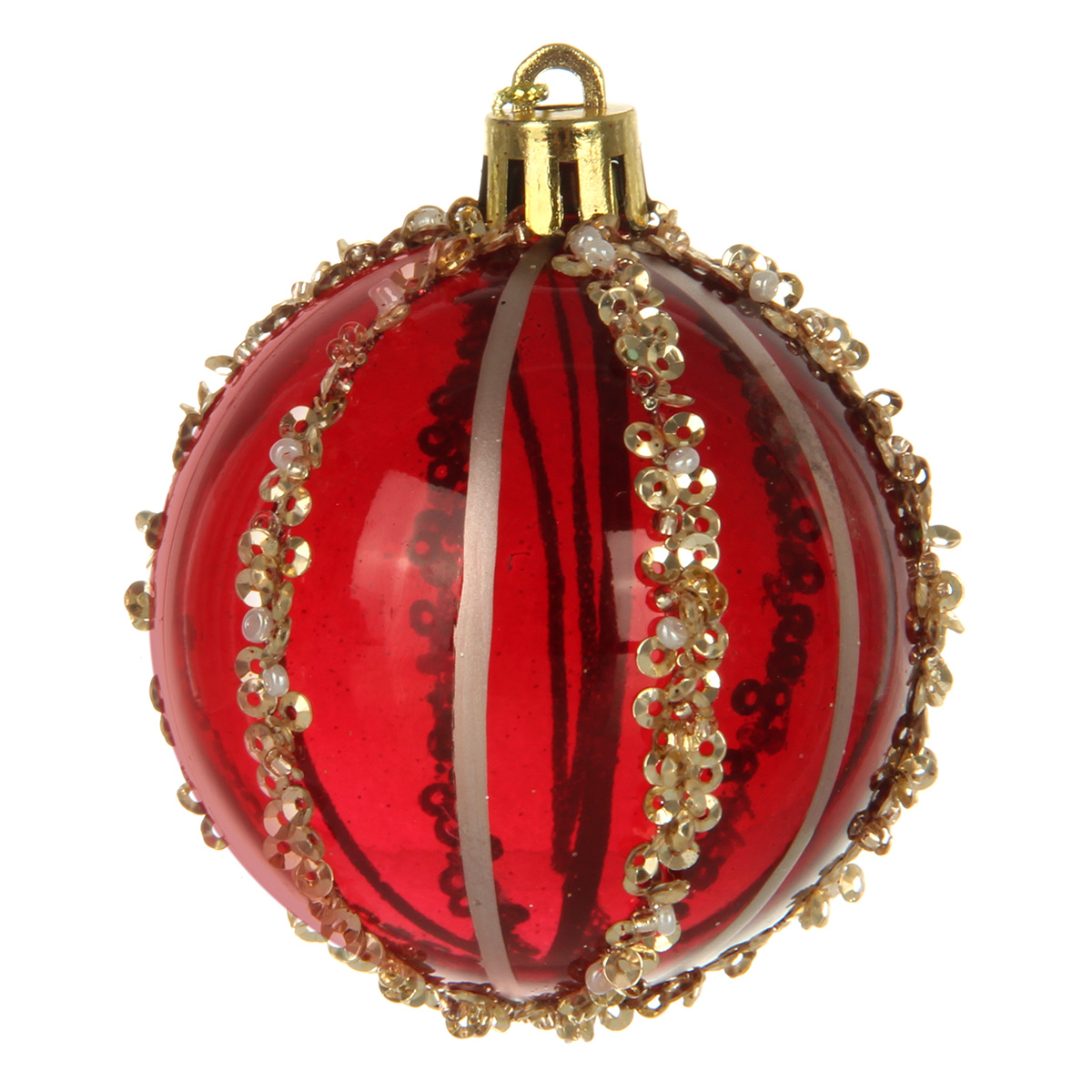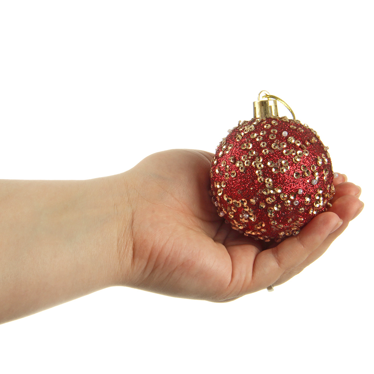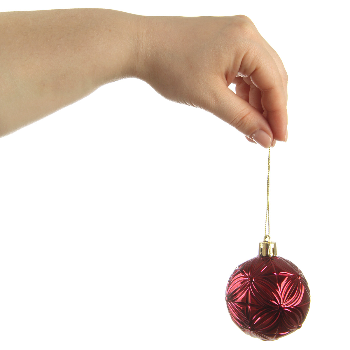 В наборе 20 новогодних шариков для декора. 8 глянцевых шаров золотого цвета, 4 шара цвета бордо с фактурной поверхностью, 4 прозрачных шара цвета бордо, 4 шара цвета бордо, украшенных блестками, пайетками и бисером.