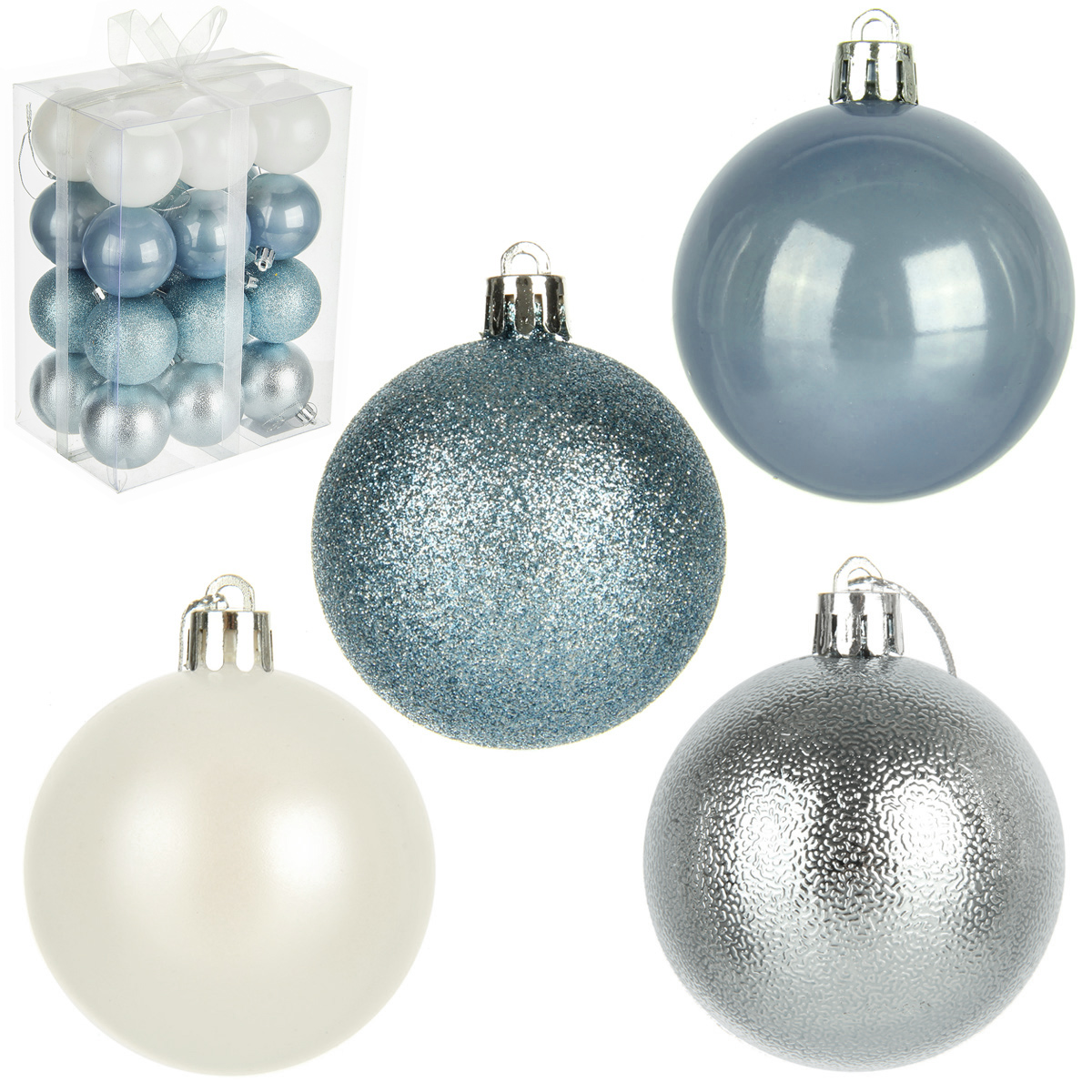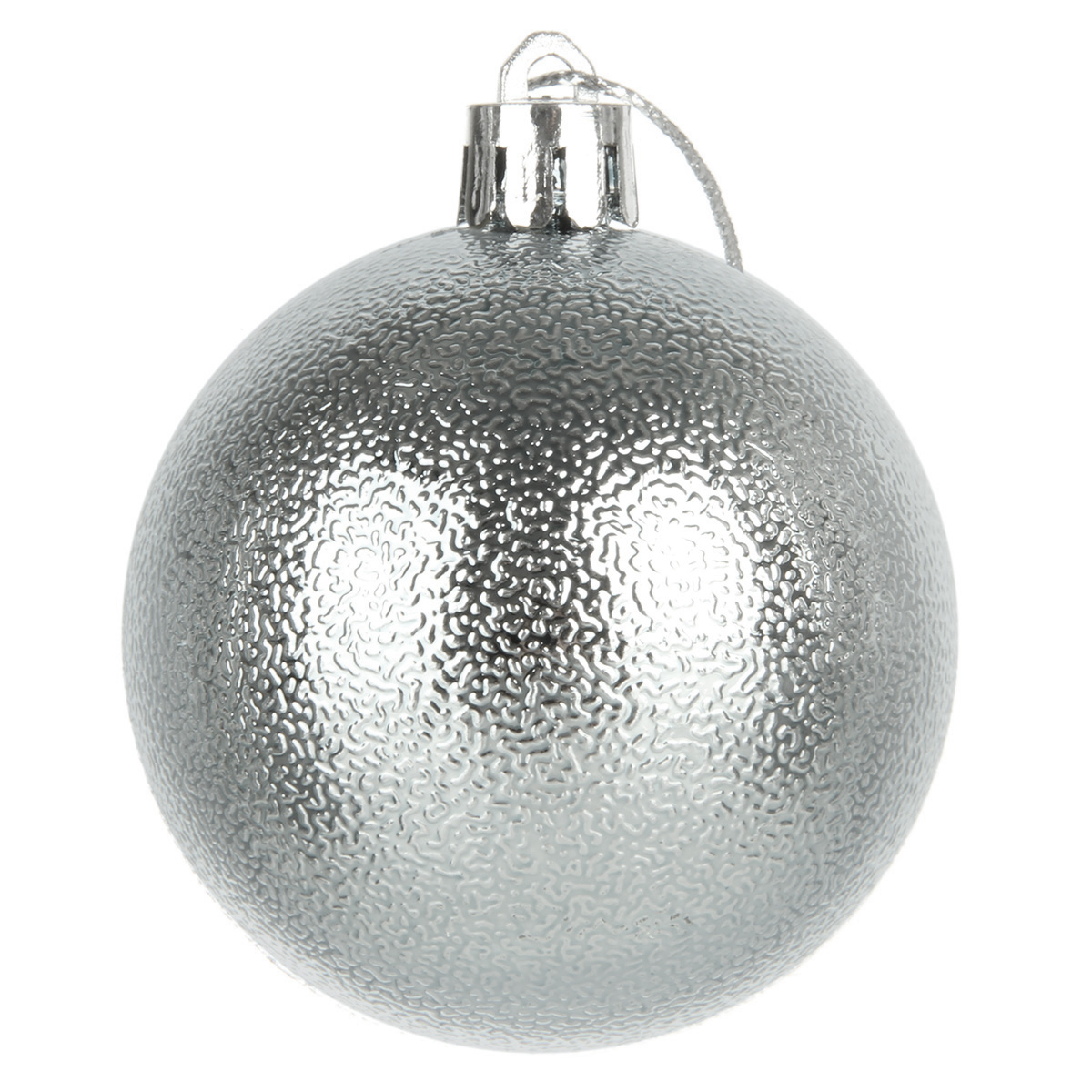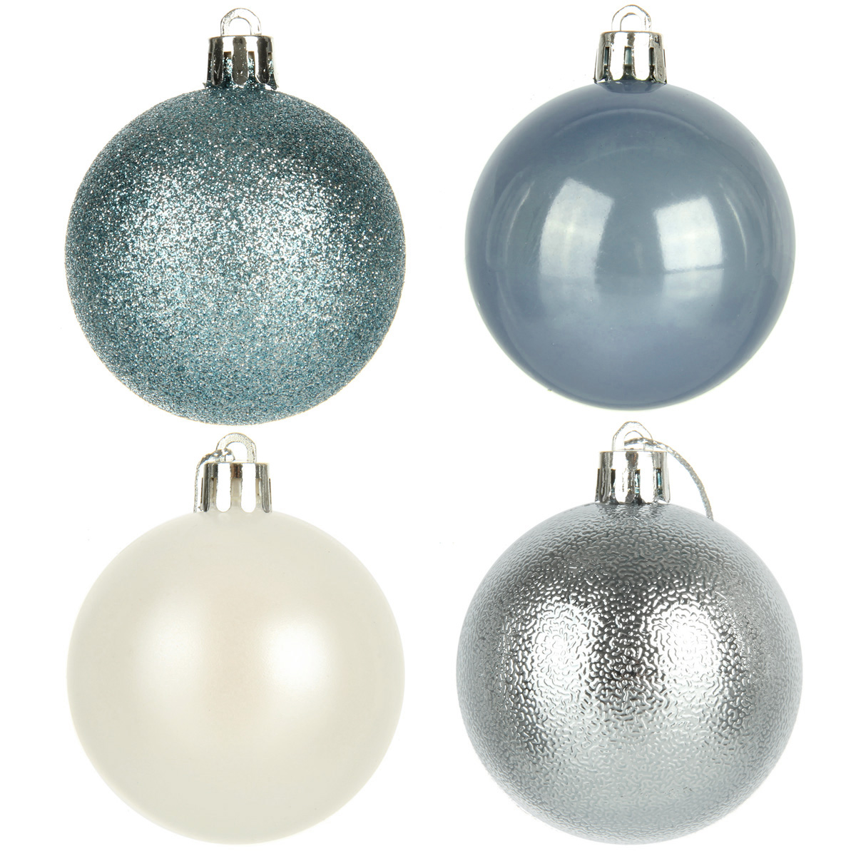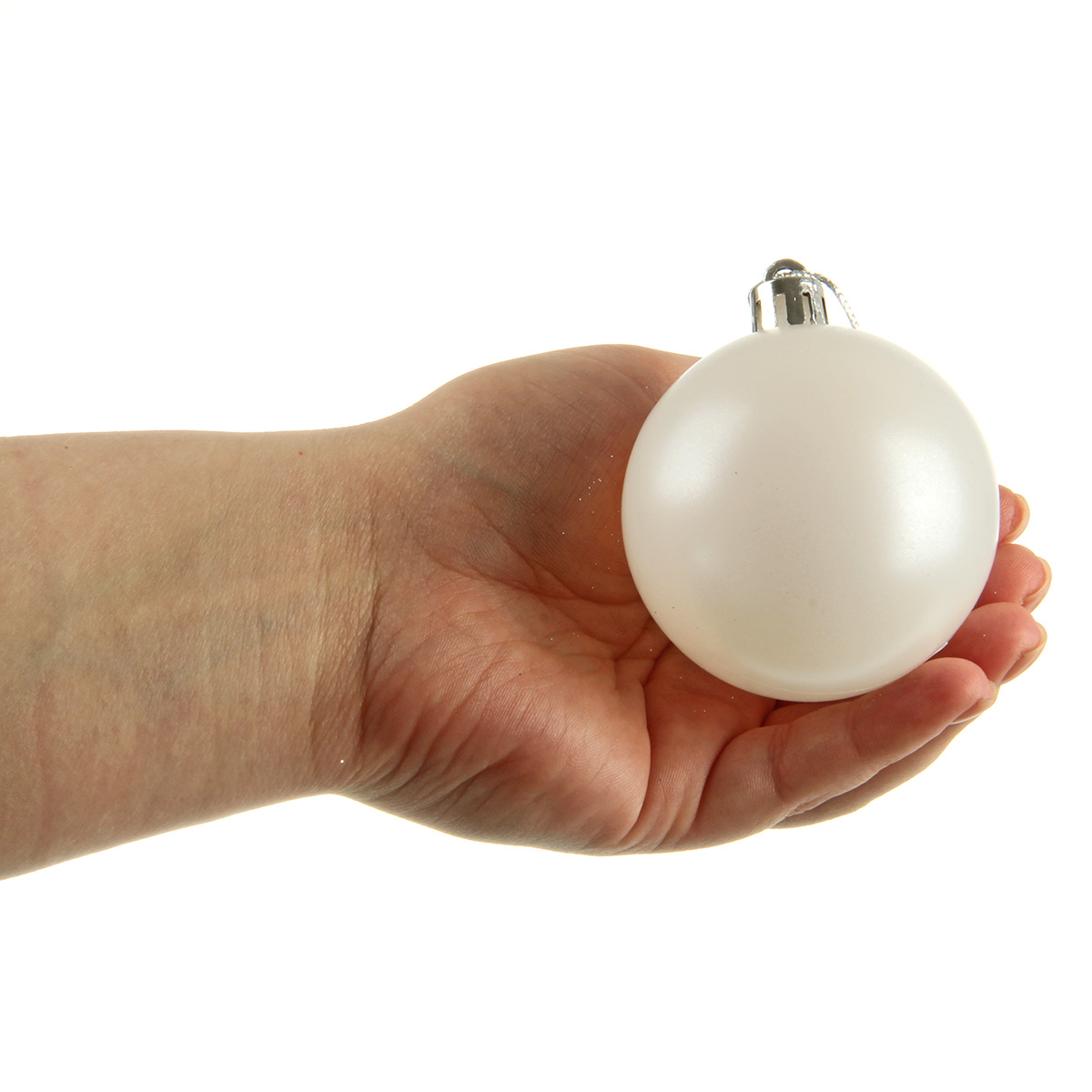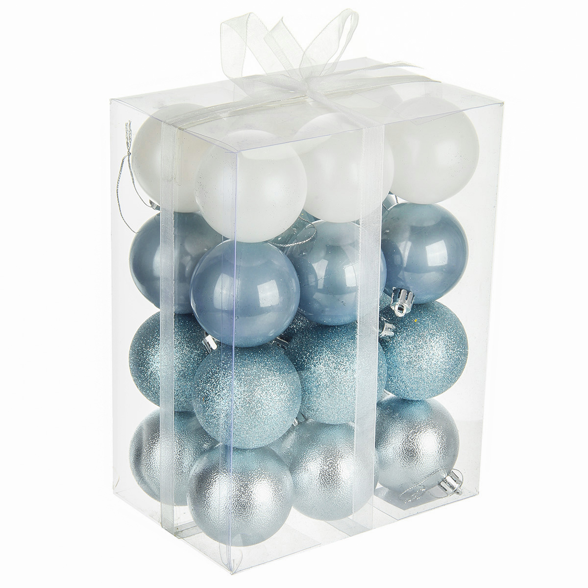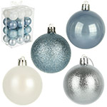 В наборе 24 новогодних шара для декора. 6 белых матовых, 6 глянцевых перламутровых, 6 перламутровых с глиттером, 6 серебряных с фактурной поверхностью.