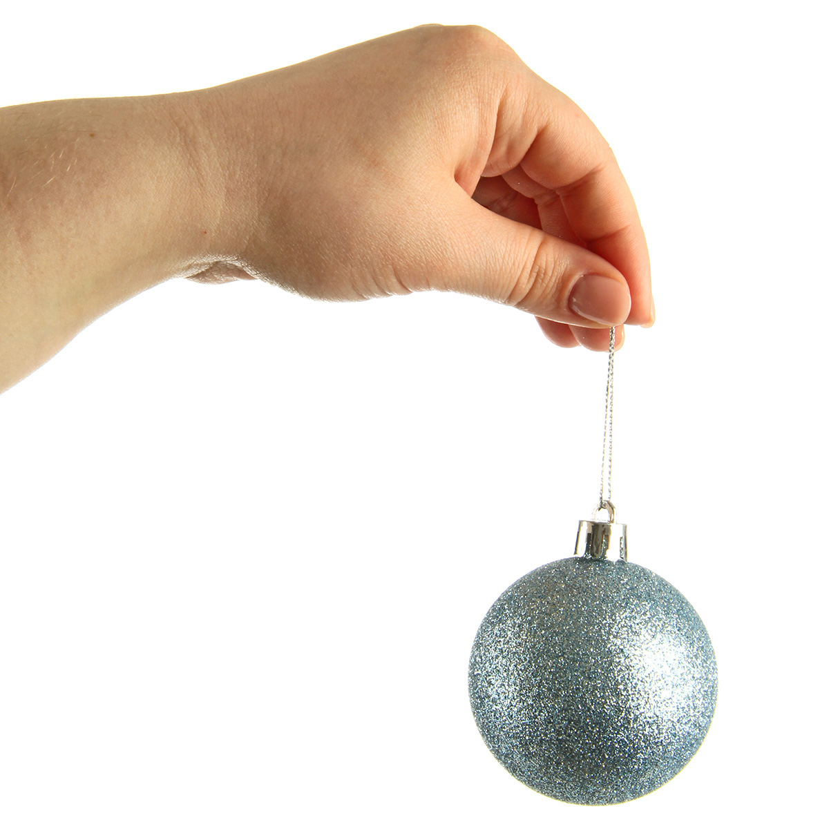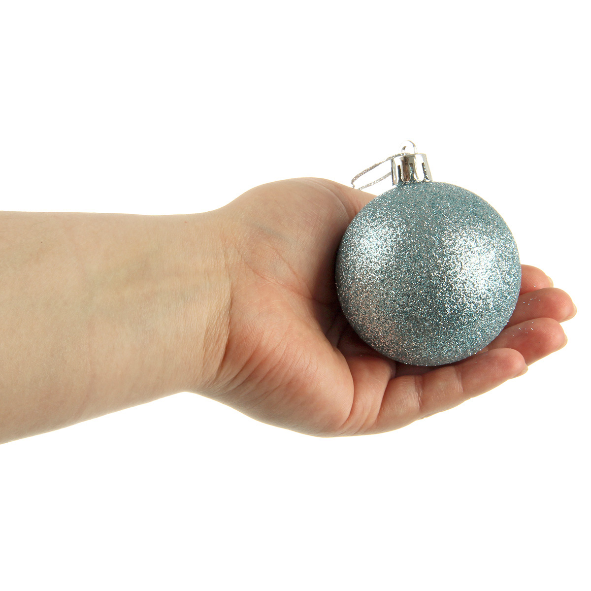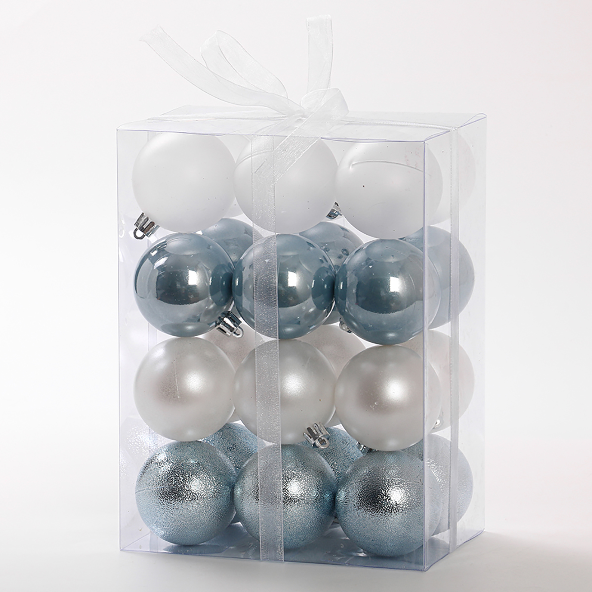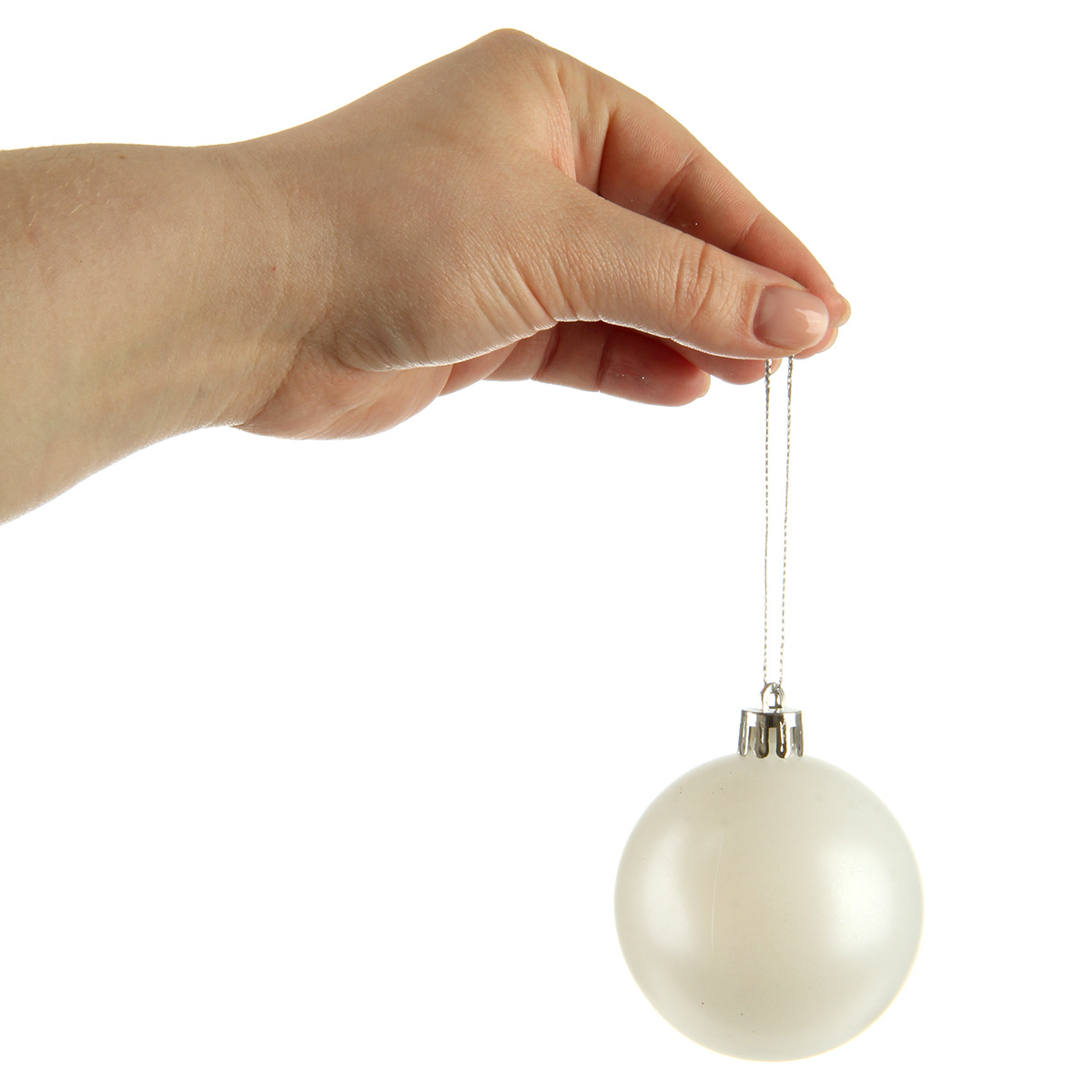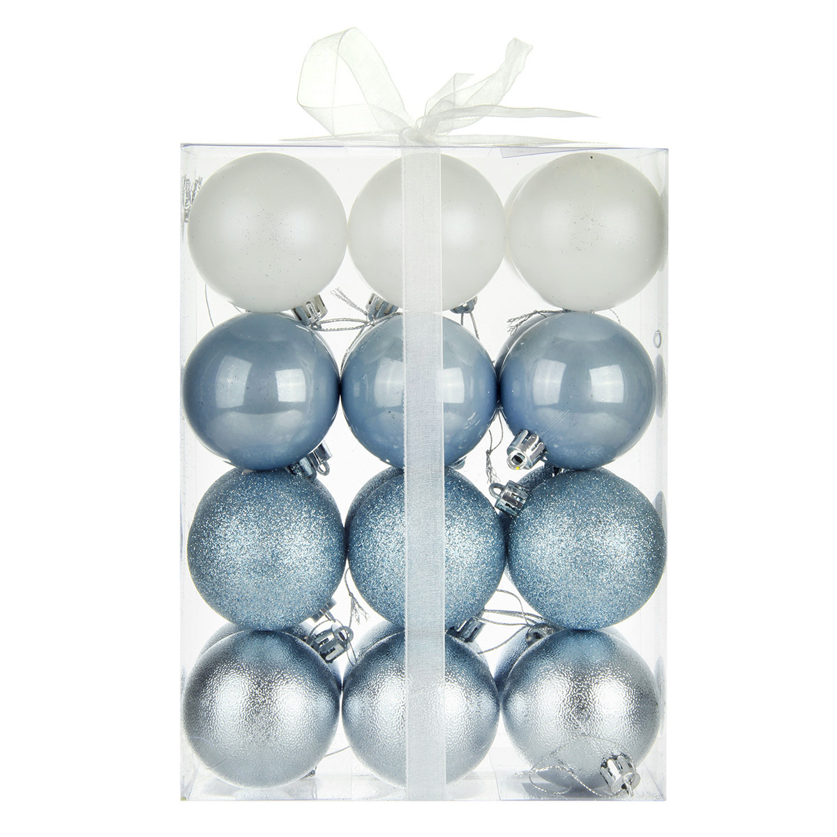 В наборе 24 новогодних шара для декора. 6 белых матовых, 6 глянцевых перламутровых, 6 перламутровых с глиттером, 6 серебряных с фактурной поверхностью.