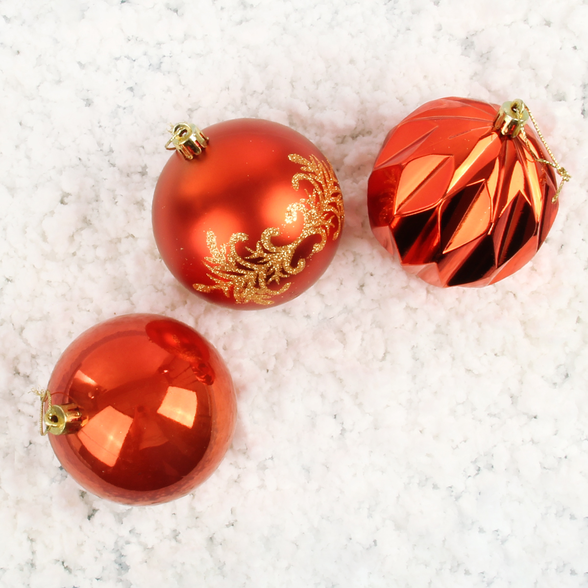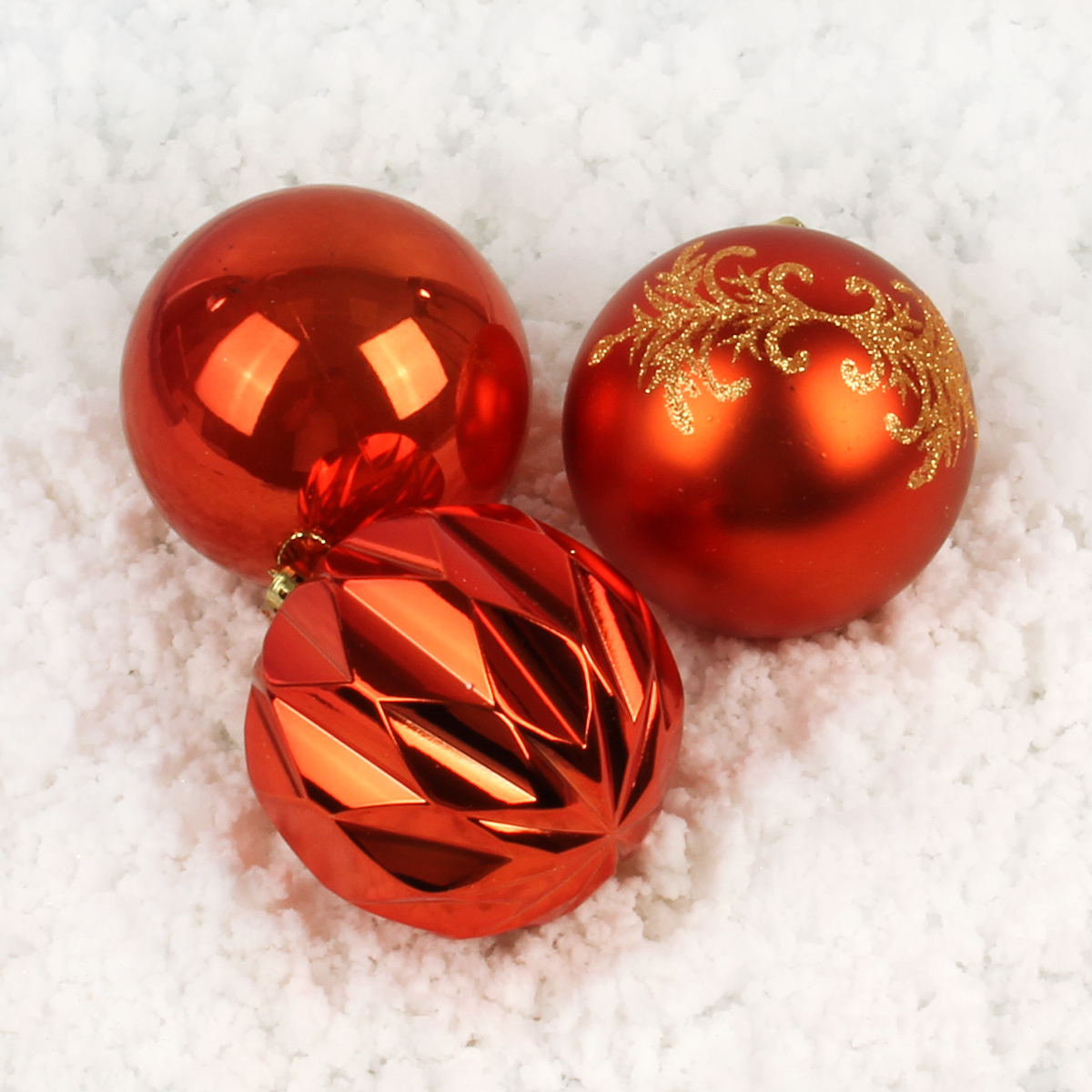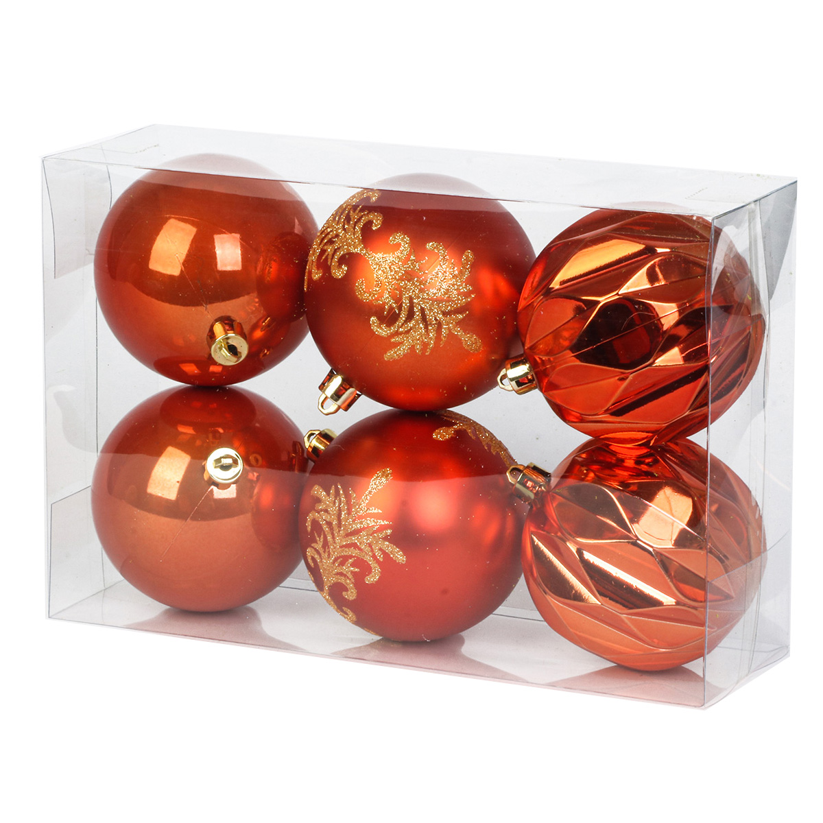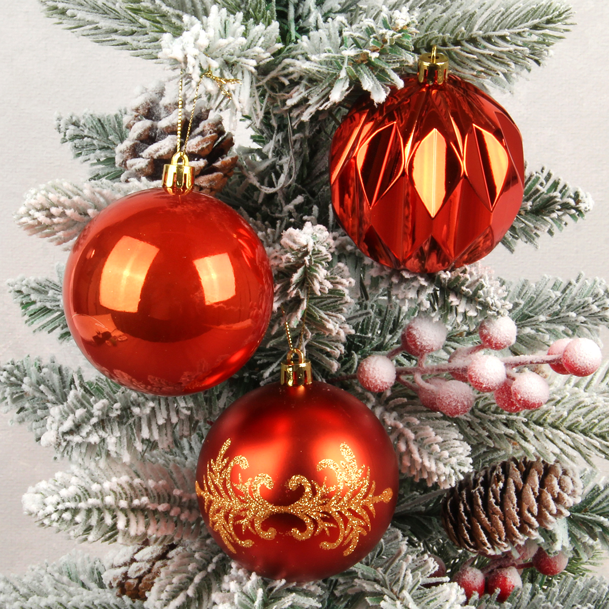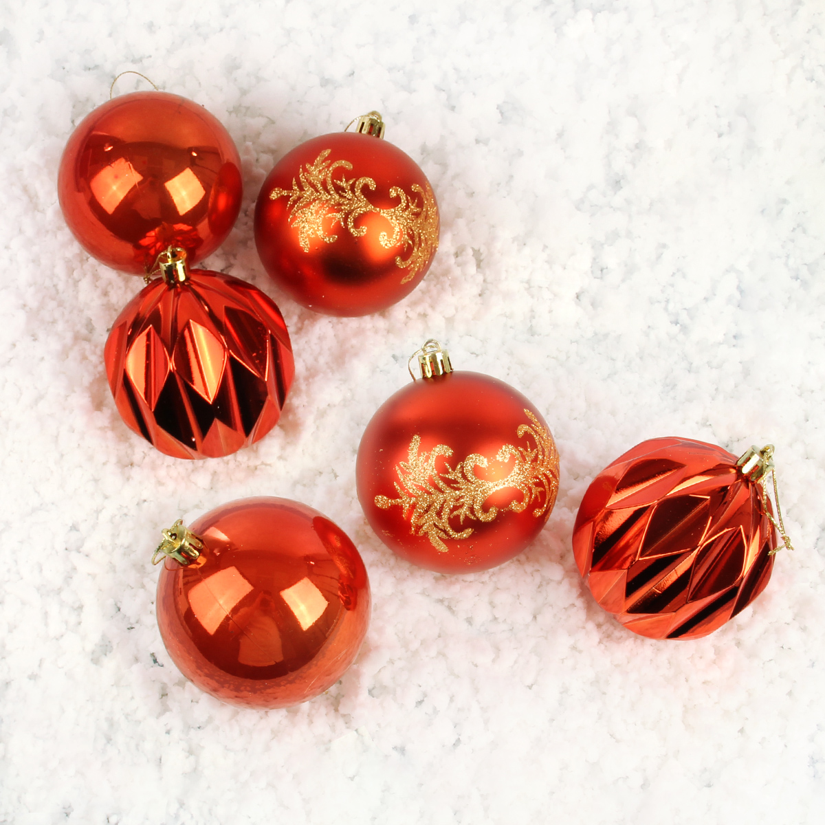 В наборе 6 шариков красного цвета, 2 глянцевых, 2 узорчатых и 2 матовых. Крепление веревочка подвеска.