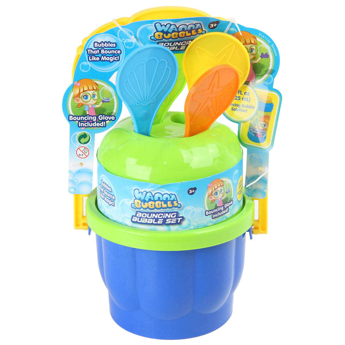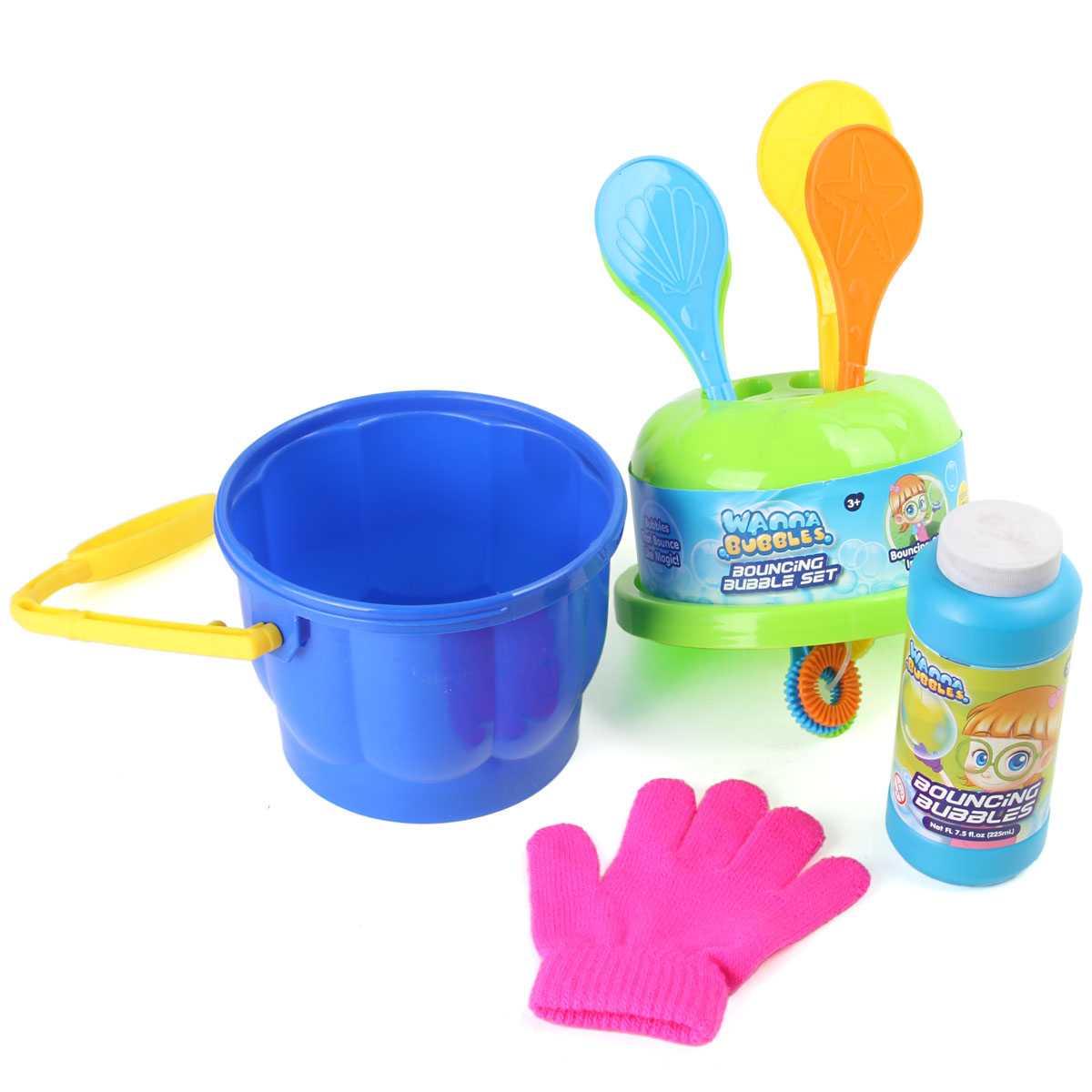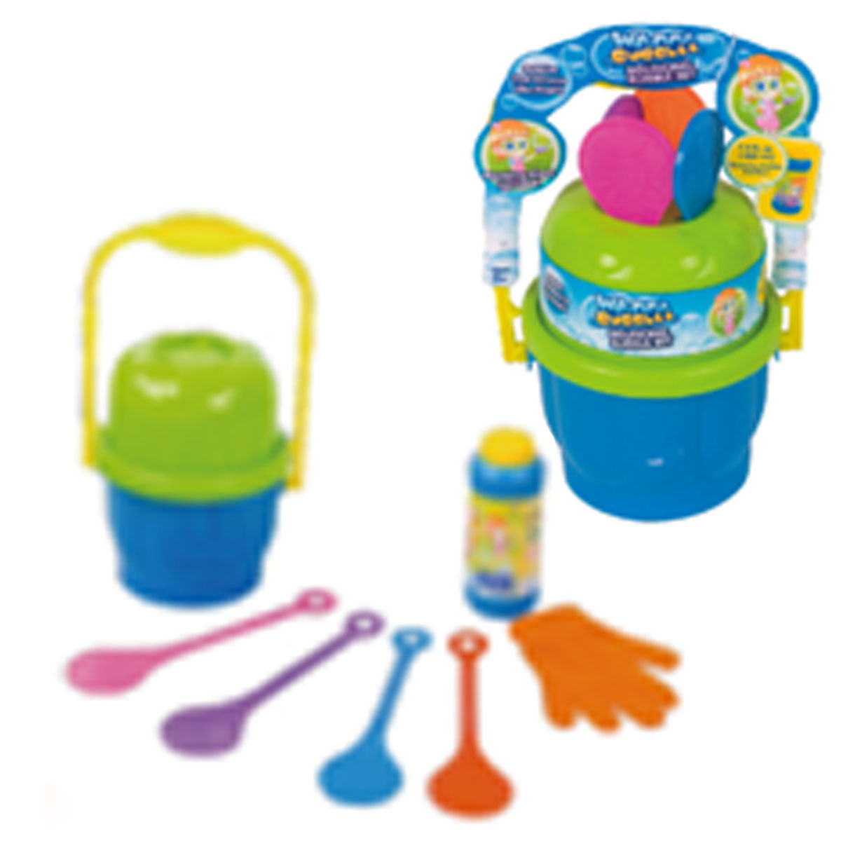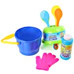Комплект для выдувания мыльных пузырей с ведерком. В комплекте: бутылочка с раствором 225 мл, рукавица, четыре лопаточки и ведерко. Размер: 19*15*17 см.