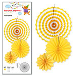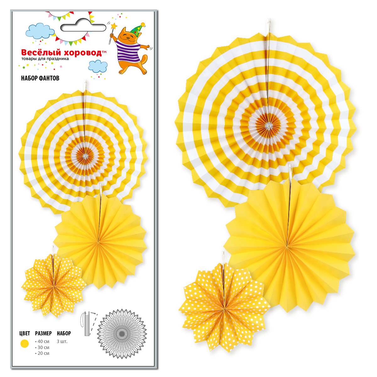 Фанты - это круглые "веера"-розетки, красиво сочетающиеся с гирляндами тассел и шарами. Идеально подходят для украшения помещения к праздничным мероприятиям. В наборе 3 фанта диаметром 40, 30, 20 см, цвет - желтый, сделаны из плотной бумаги. Можно складывать и хранить в плоском виде, фанты раскладываются по принципу веера. Набор изготовлен из картона, бумаги и текстильного материала. Упакован в пакет. Размеры набора в упаковке: 10*2*25 см.