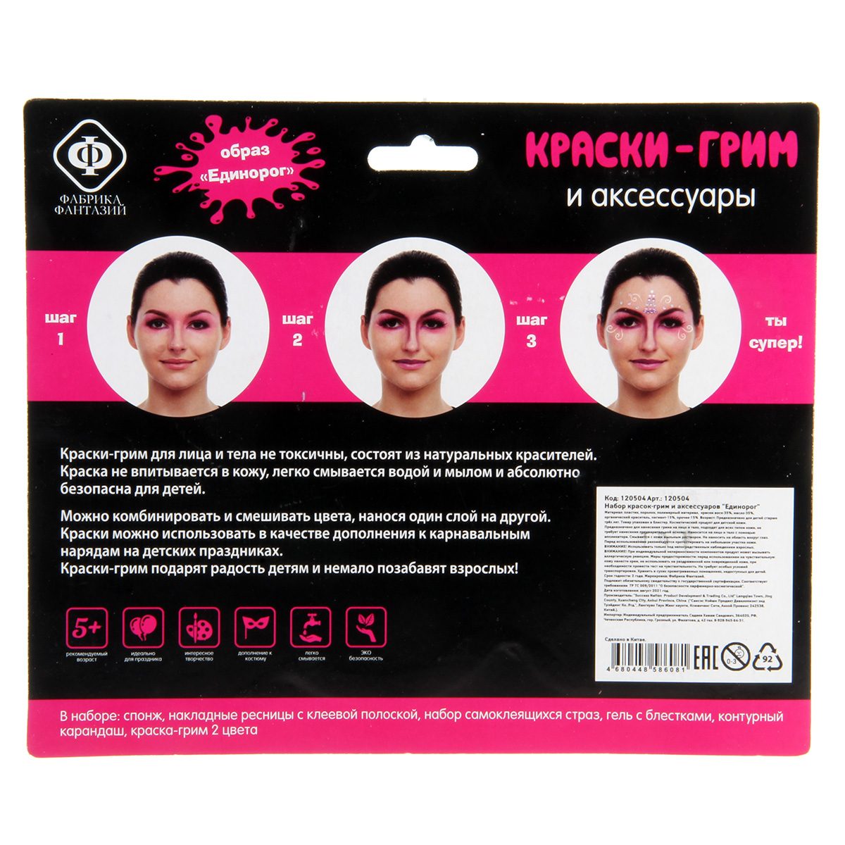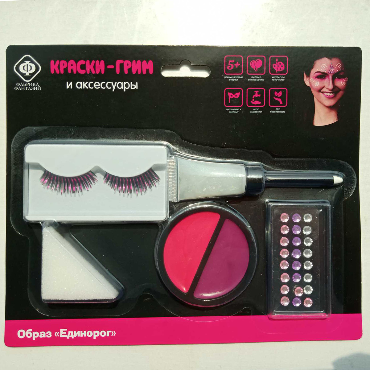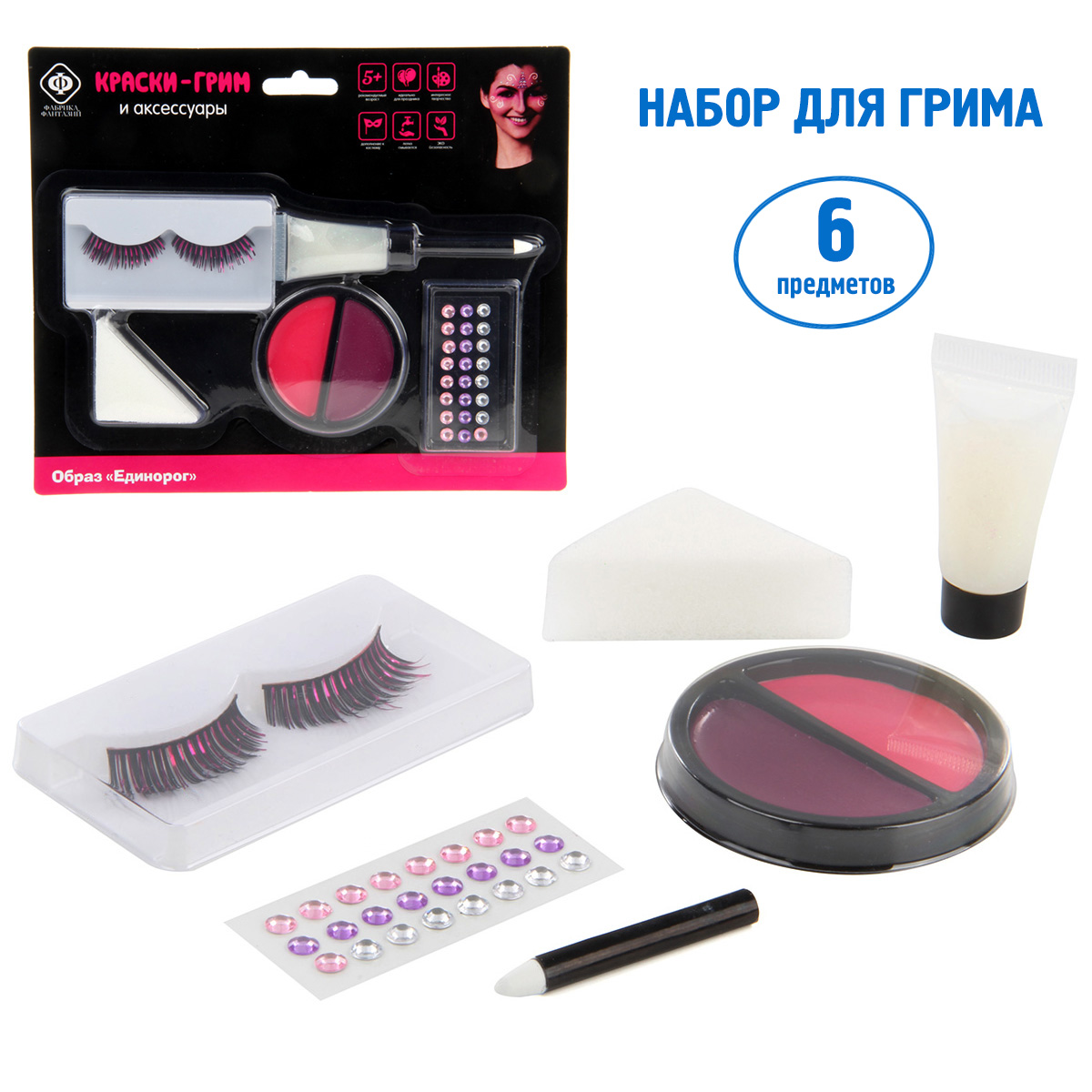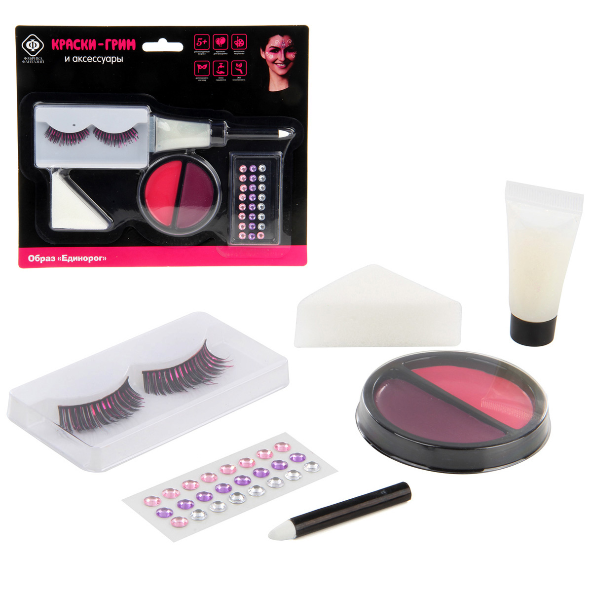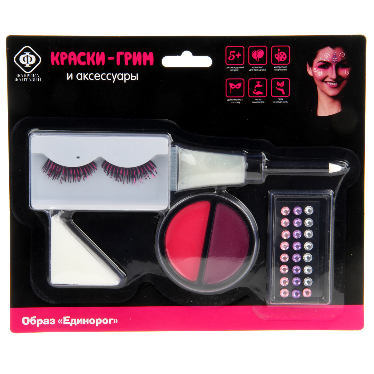 Краски-грим для лица и тела помогут создать любой образ, какой захочет ребенок! Рисунки, сделанные этими красками, идеально дополнят костюмы и наряды для маскарадов, карнавалов и детских праздников! В комплект входит карандаш, накладные ресницы, пузырёк блёсток, поролон, банка красок, стразы. Функционал игрушки: -краски и карандаш легко наносятся на кожу и легко смываются; -накладные ресницы и стразы клеятся к коже. Размеры упаковки: 24*2*20 см. Размеры красок: 7*1*7 см. Размеры коробки с ресницами: 9*1*5 см. Размеры пузырька: 3*2*6 см. Изготовлено из полимерного материала.