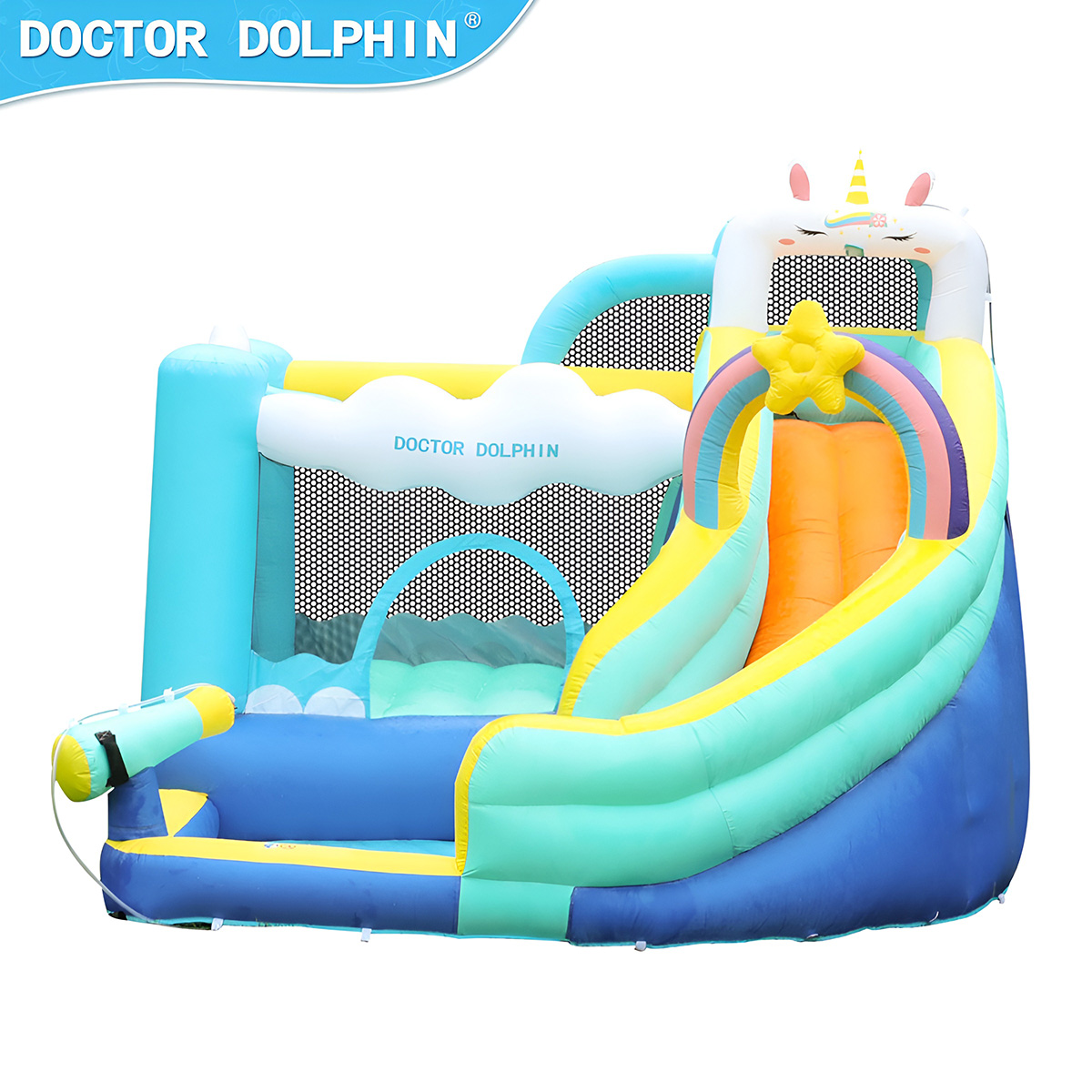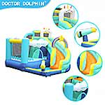 Надувной замок для детей с горкой, это спортивный комплекс 5 в 1 со множеством игровых площадок, надувается за 1 минуту. Надувная пушка с разбрызгивателем воды, можно охладиться в жаркую погоду. Баскетбольное кольцо для мячика, скалодром, горка и бассейн, в бассейн можно насыпать шарики, получится сухой бассейн.