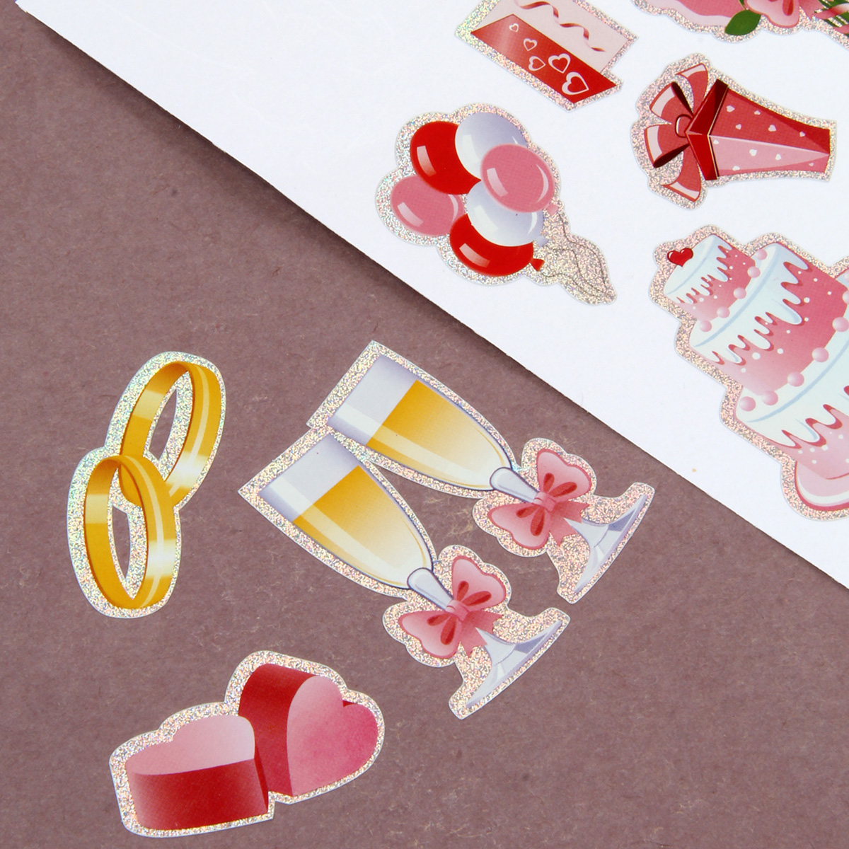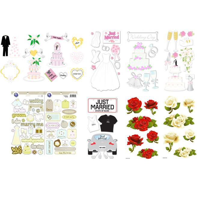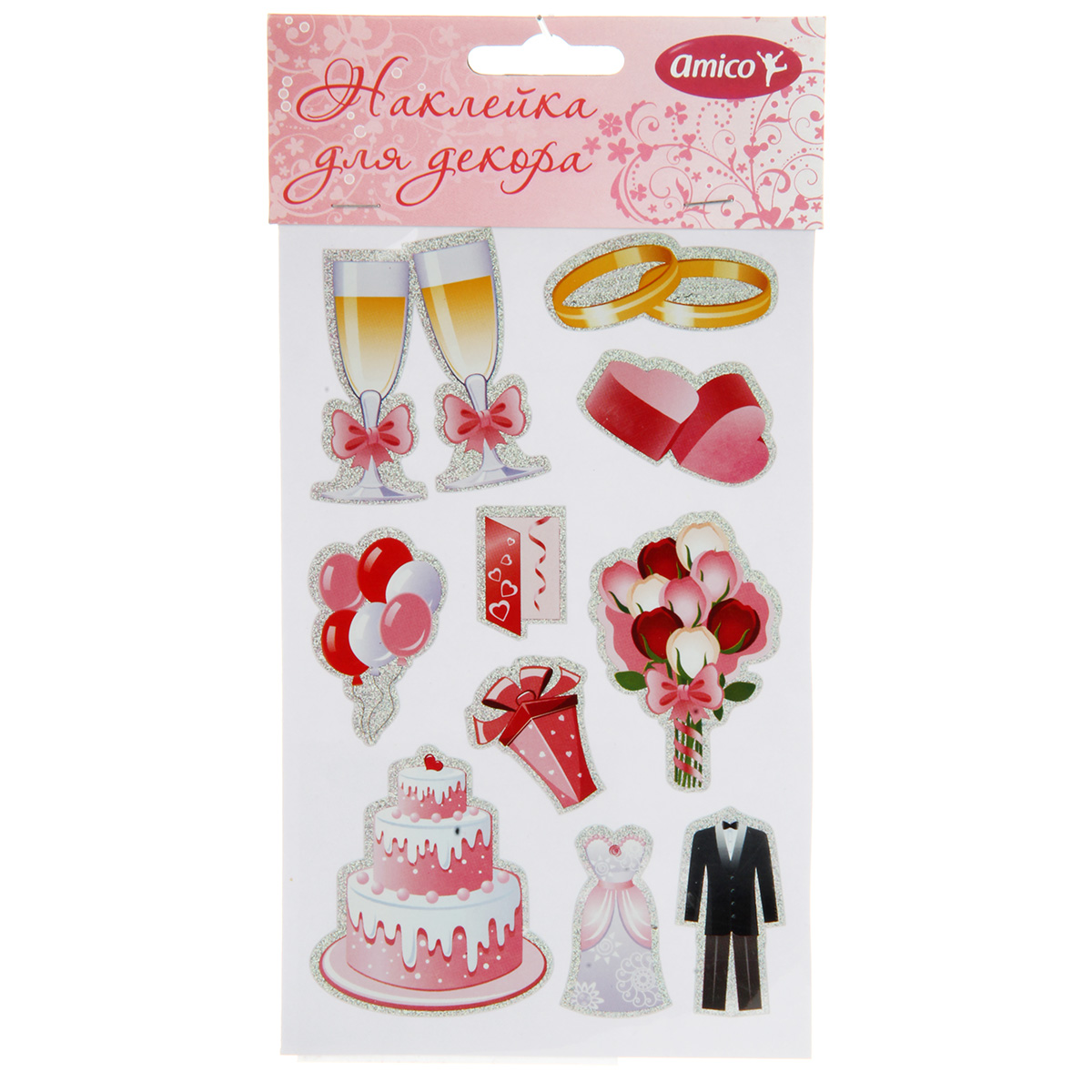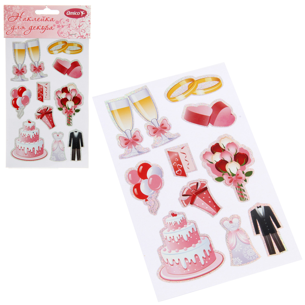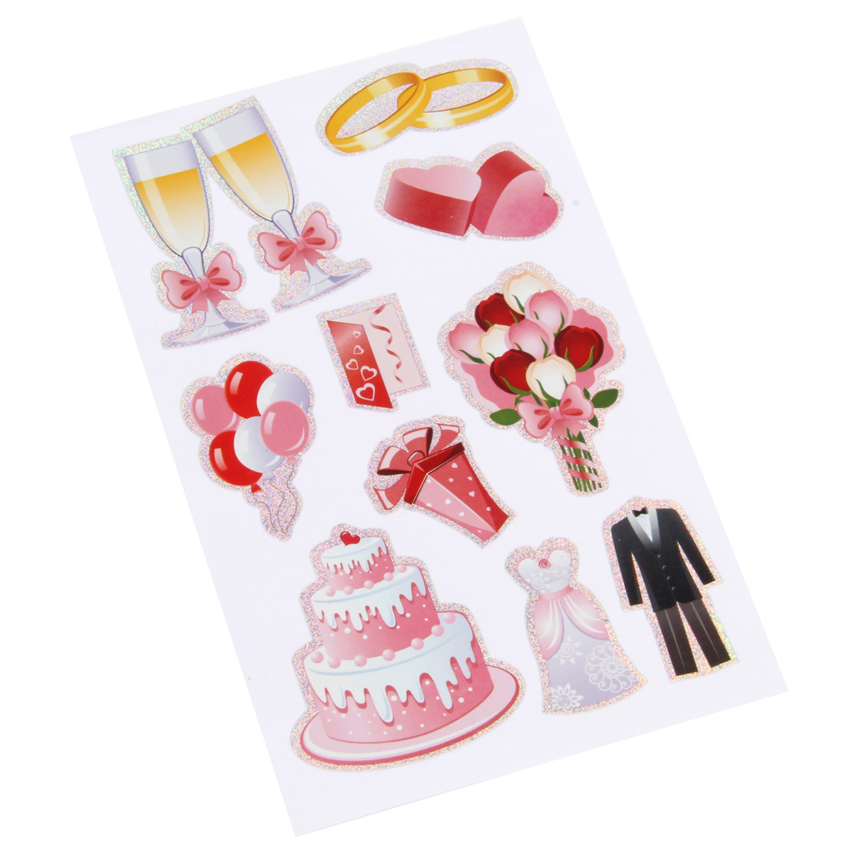 Набор наклеек для оформления - полезный помощник при декорировании разных предметов ко Дню свадьбы: открыток, конвертов, подарков. Простота и удобство использования, клейкий слой, лазерные наклейки. Создавайте интересные композиции с таким набором наклеек, получится оригинальное произведение. Материал: полимерный Размеры листа с наклейками: 10*16 см. Размеры в упаковке: 11*20 см.