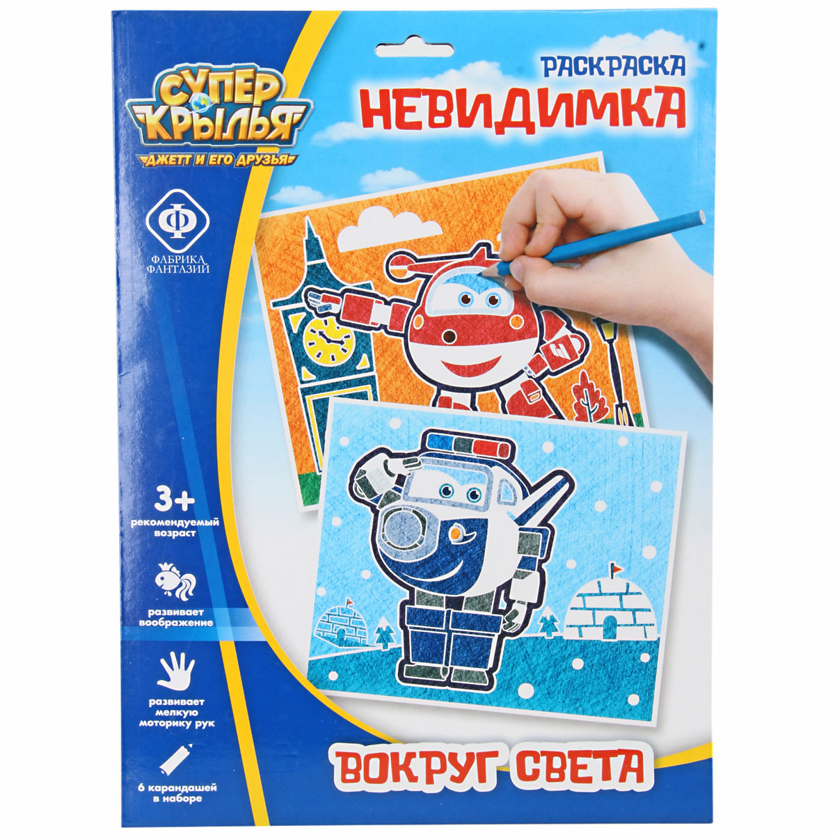 Раскраска-невидимка – это необычный и оригинальный вид творчества. Невидимый рисунок начнет проявляться, как только вы возьмете в руки карандаш и заштрихуете поверхность глянцевого листа. Используйте разного цвета карандаши и в результате вы получите яркое, красочное панно, завораживающее как калейдоскоп. Благодаря рисованию, у ребенка развивается творческое мышление и ощущение цвета и формы. А любимые персонажи "Super Wings" сделают процесс еще увлекательнее. Состав набора: 2 картины с невидимым рисунком 21х25см, 6 разноцветных карандашей. Размер упаковки: 23х1х32см