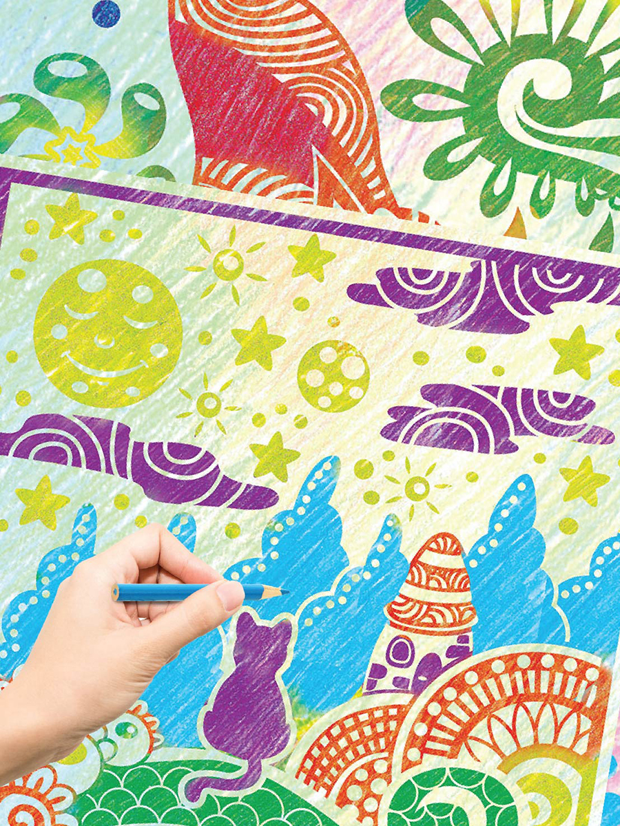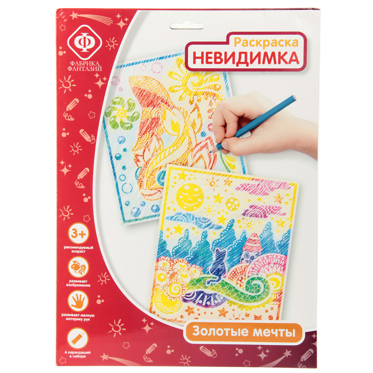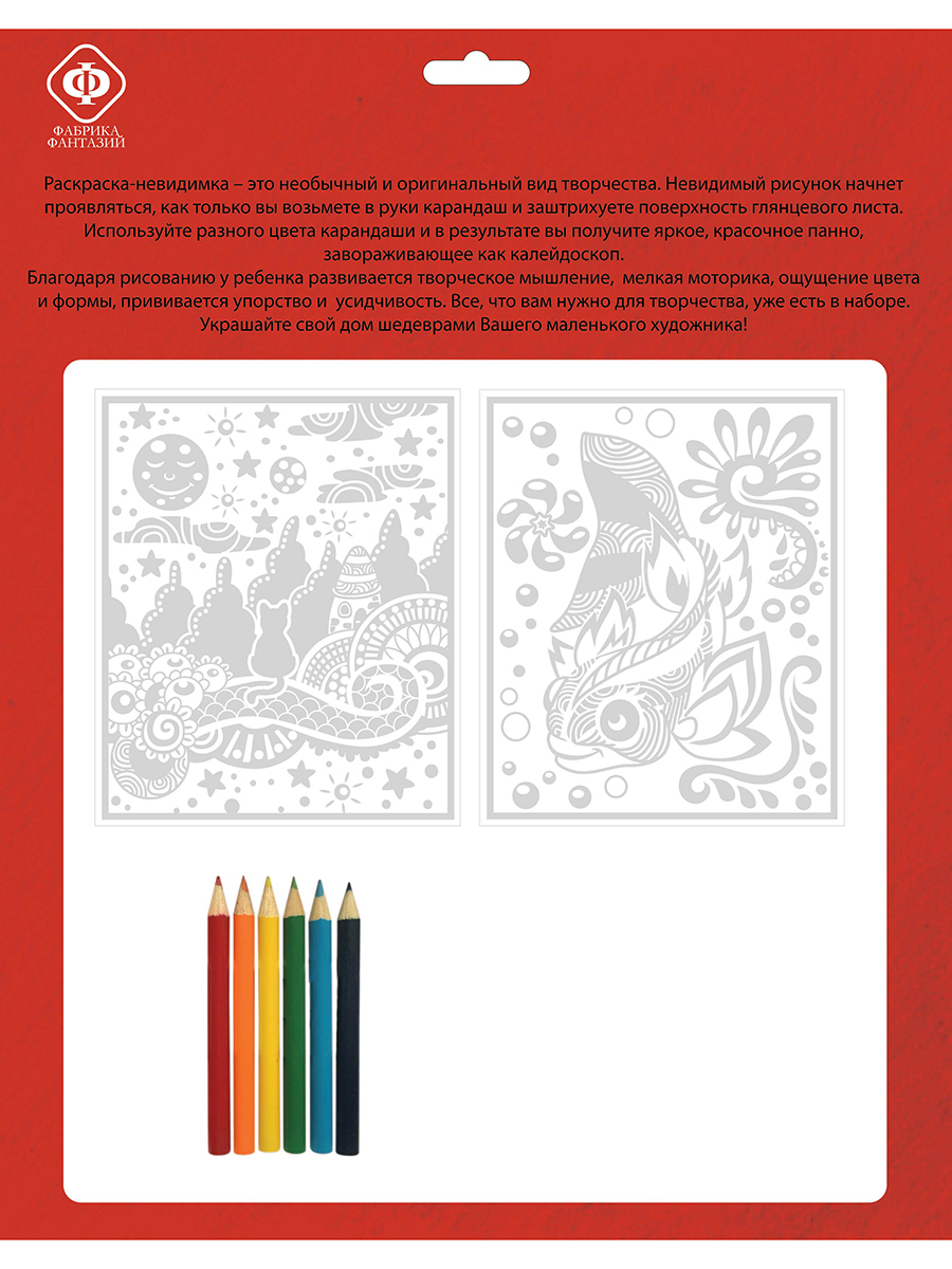 "Описание: Раскраска-невидимка – это необычный и оригинальный вид творчества. Невидимый рисунок начнет проявляться, как только вы возьмете в руки карандаш и заштрихуете поверхность глянцевого листа. Используйте разного цвета карандаши и в результате вы получите яркое, красочное панно, завораживающее как калейдоскоп. Благодаря рисованию, у ребенка развивается творческое мышление и ощущение цвета и формы. Состав набора: 2 картины с невидимым рисунком 21х29 см, 6 разноцветных карандашей. Размер упаковки: 24х30х1см"
