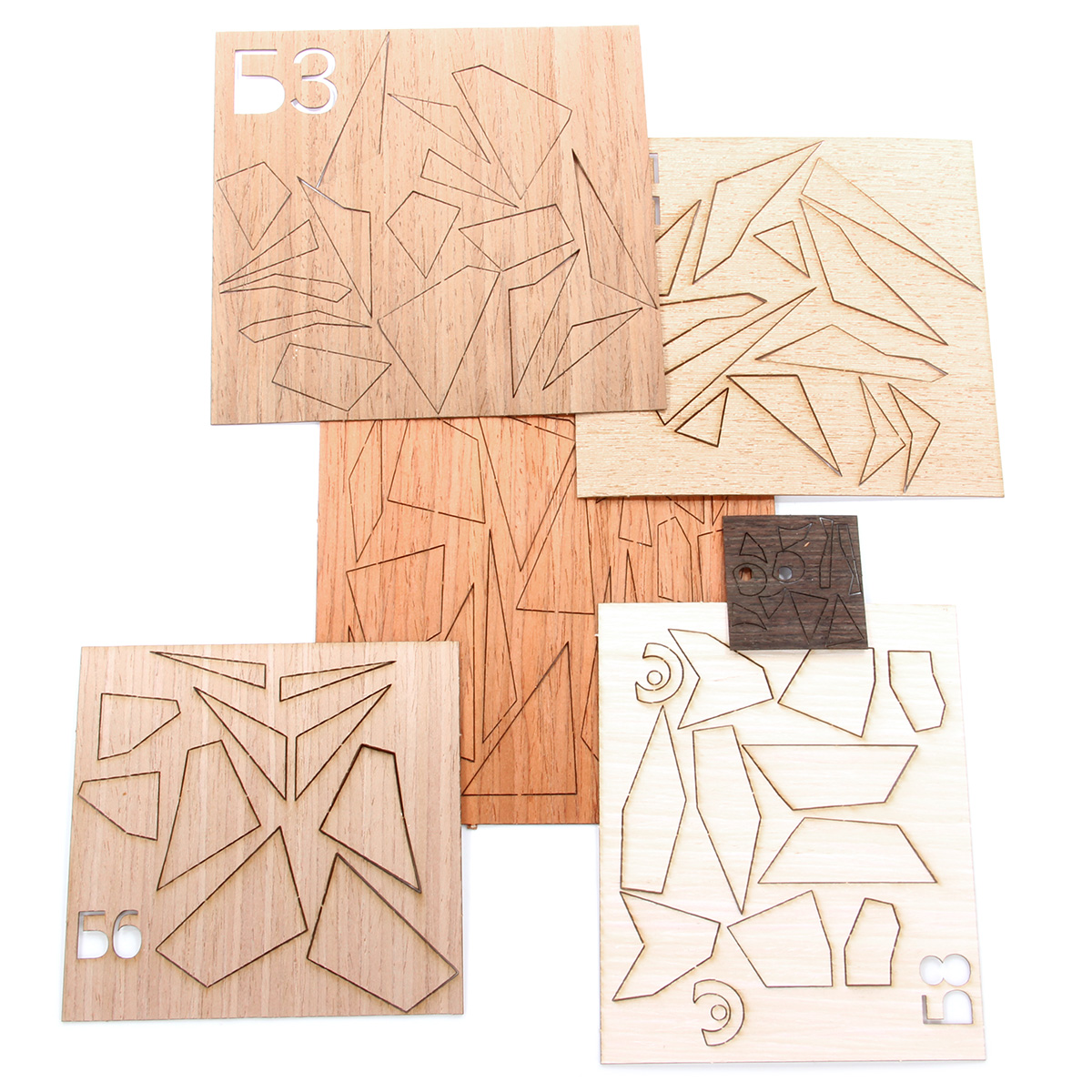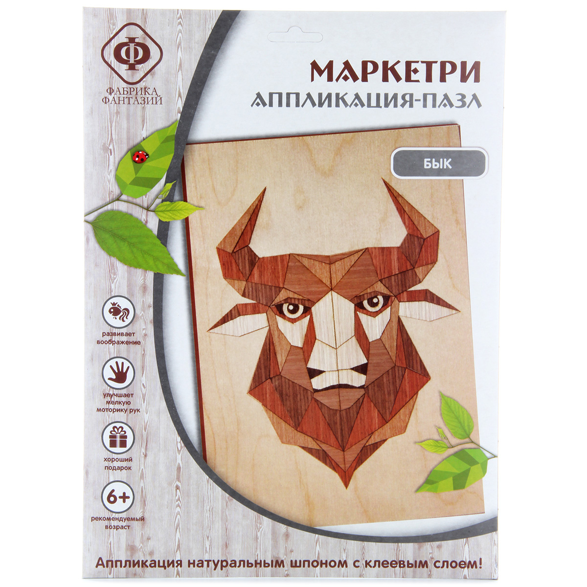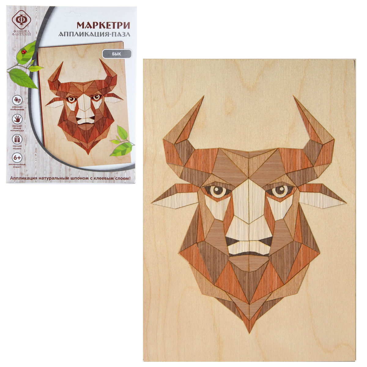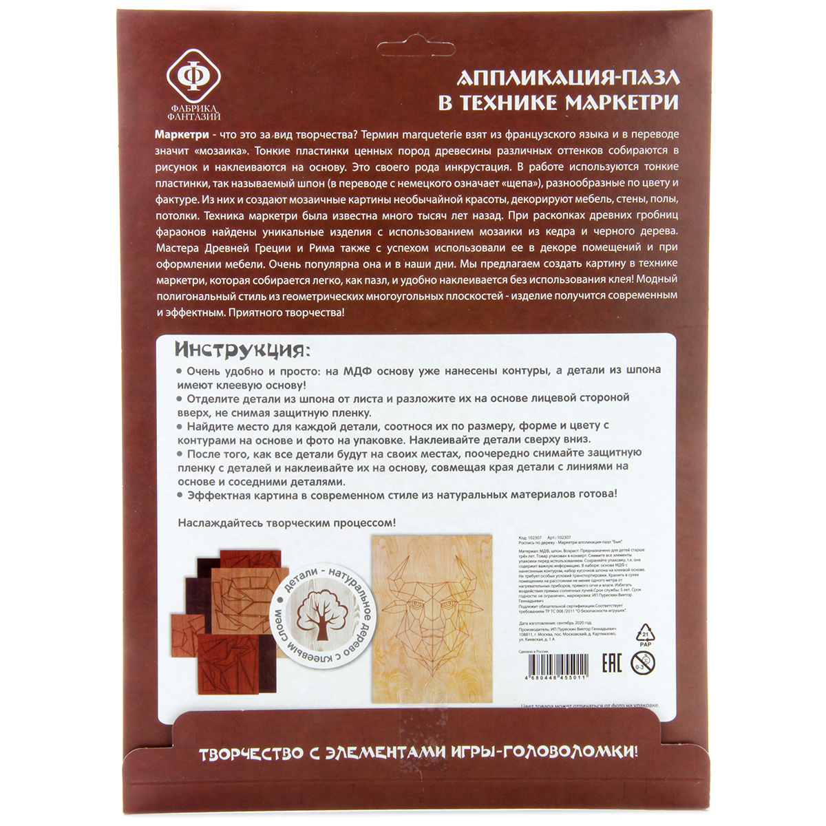 В состав набора входит: основа из МДФ А4 с нанесенным контуром, набор элементов из шпона на клеевой основе, инструкция на упаковке.