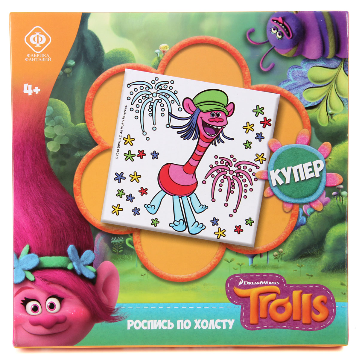 Акриловая живопись специально разработана для начинающего художника. Благодаря контурному рисунку и крупным деталям, малыш легко справиться с картиной. Развивайтесь и творите, смешивая цвета и получая новые оттенки. А любимые персонажи «Trolls» сделают процесс еще интереснее. Роспись по холсту - увлекательное занятие, способствующее развитию вкуса, воображения и творческих способностей. Все, что нужно для творчества, уже есть в наборе, а готовый шедевр непременно станет украшением интерьера и прекрасным подарком. Состав набора: Холст на подрамнике 20х20 см, краски 6 цветов, кисть. Размер упаковки: 20х20х2см