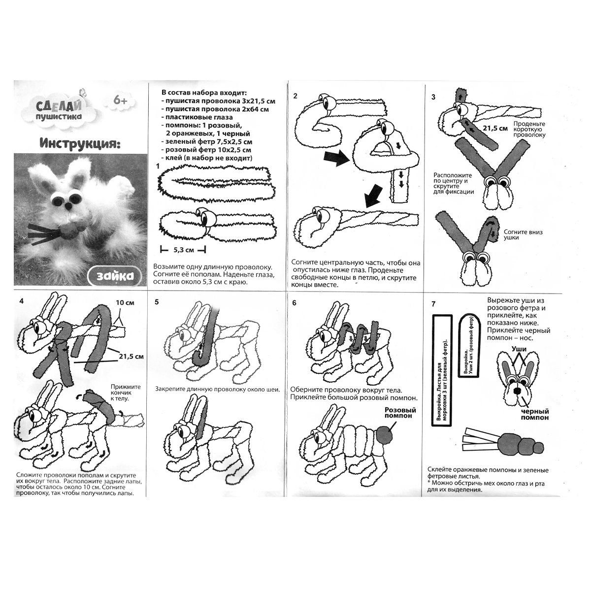Набор для создания объемной, мягкой и пушистой игрушки. Увлекательное занятие способствует развитию пространственного мышления и воображения. Пушистую проволоку так приятно трогать, что ребенок обязательно закончит поделку! В наборе: инструкция, пушистая проволока, кусочки фетра, глаза и помпоны. Картонная коробка, размер: 18х18х4см