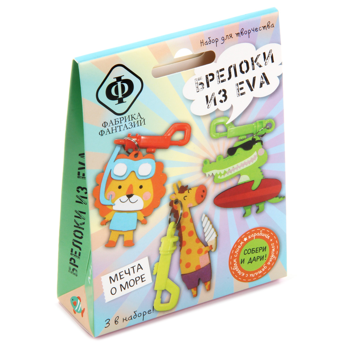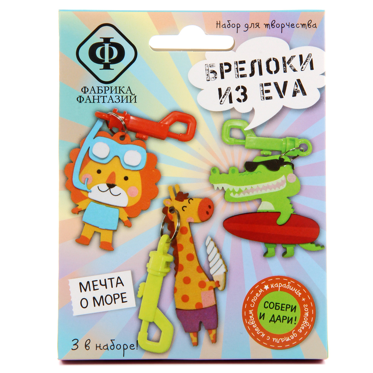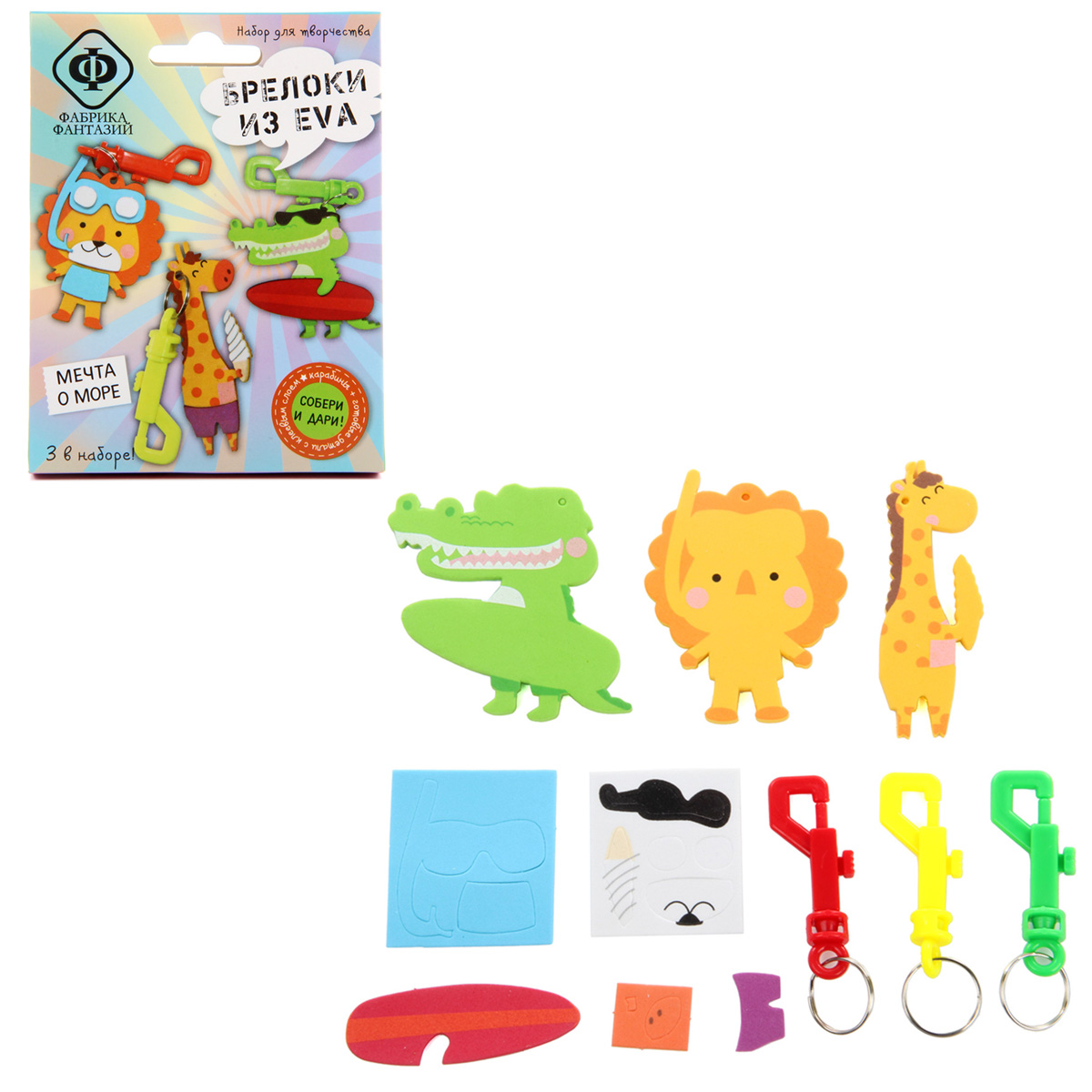 Набор для творчества "Брелоки из EVA". EVA foam, или фоамиран, или по-просту "пенка" - это прекрасный материал для творчества! Он легкий, яркий, прочный и приятный на ощупь. В наборе есть все необходимое для создания трех забавных брелоков. Не нужны ножницы и клей. На детали уже нанесен клеевой слой, поэтому брелочки собираются легко, быстро и чисто. В наборе: пластиковый карабин с колечком 3шт, набор деталей из EVA с клеевым слоем 3 комплекта. Рекомендуемый возраст: 5+ Размер: 10*3*13см