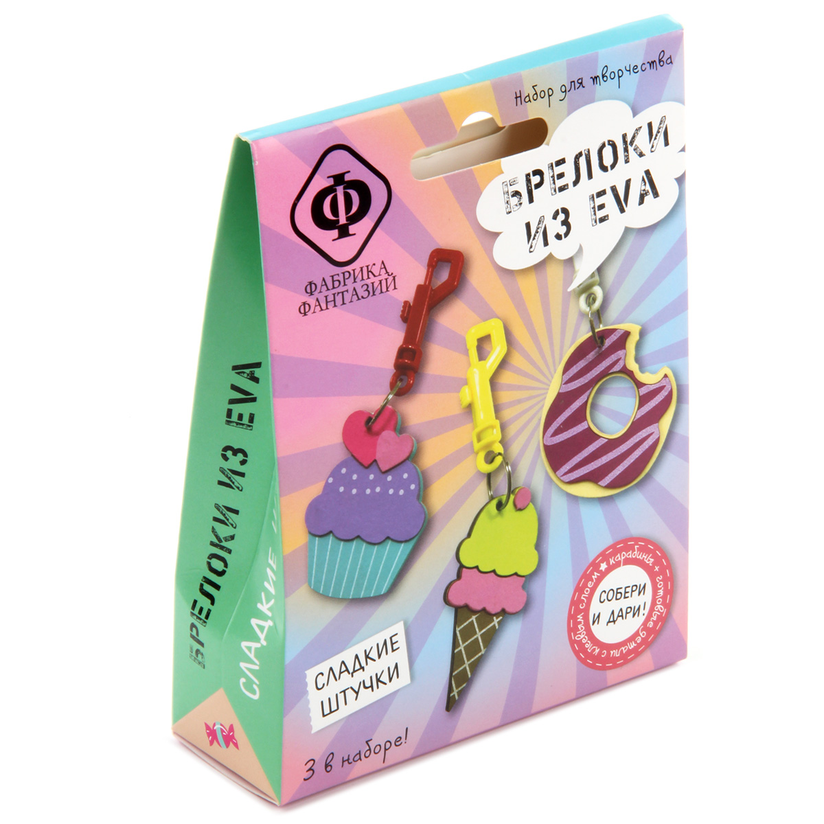 Набор для творчества "Брелоки из EVA". EVA foam, или фоамиран, или по-просту "пенка" - это прекрасный материал для творчества! Он легкий, яркий, прочный и приятный на ощупь. В наборе есть все необходимое для создания трех забавных брелоков. Не нужны ножницы и клей. На детали уже нанесен клеевой слой, поэтому брелочки собираются легко, быстро и чисто. В наборе: пластиковый карабин с колечком 3шт, набор деталей из EVA с клеевым слоем 3 комплекта. Рекомендуемый возраст: 5+ Размер: 10*3*13см