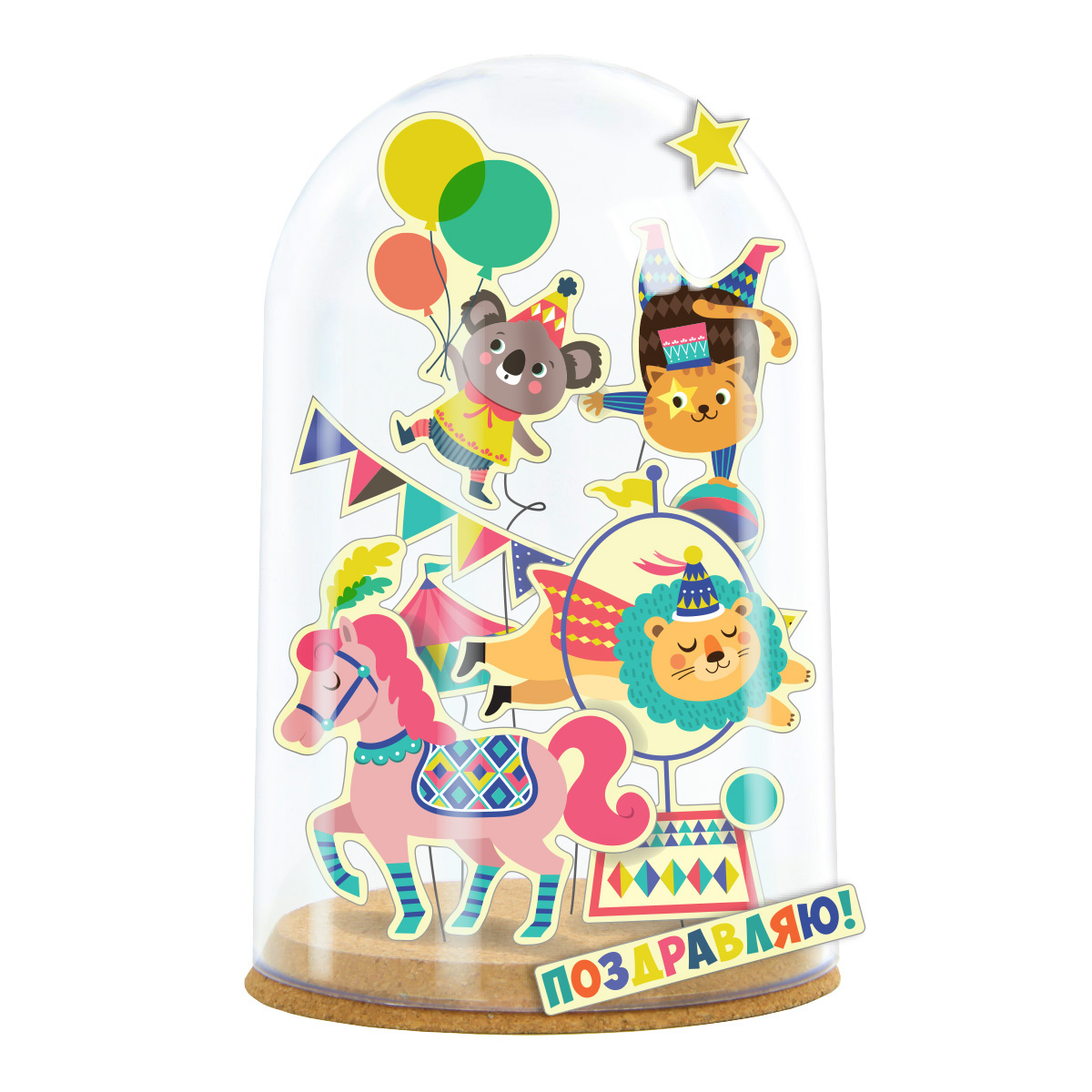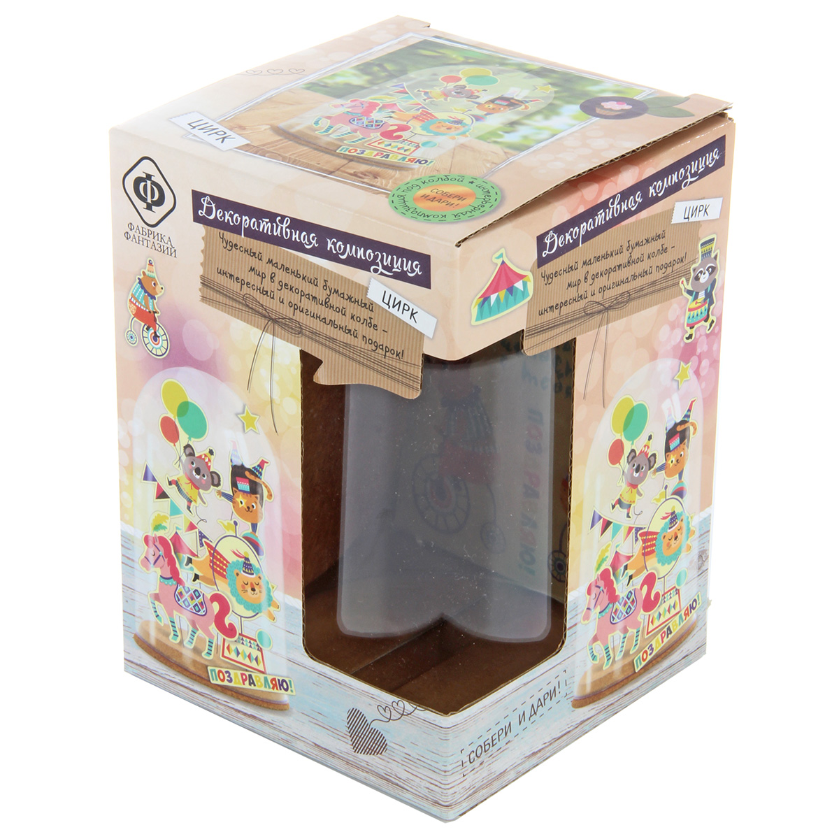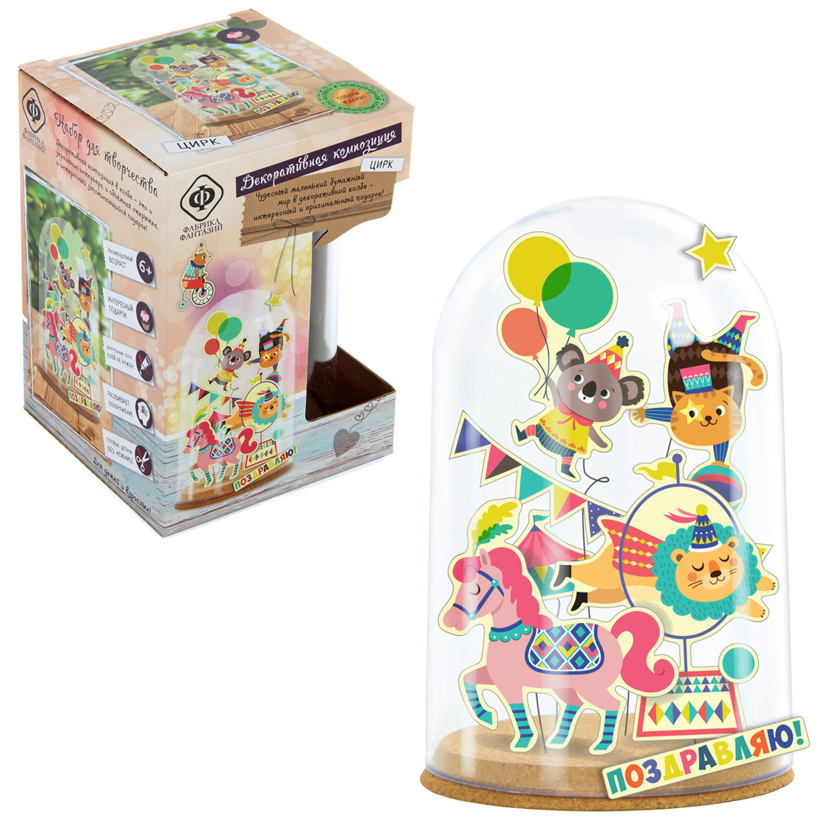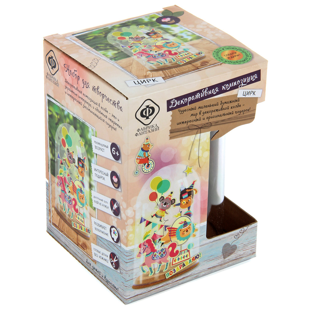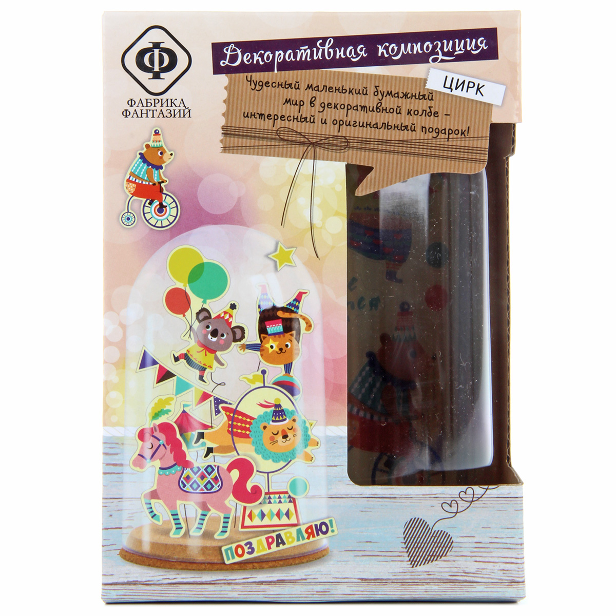 Набор для создания декоративной интерьерной композиции. Чудесный маленький бумажный мир в декоративой колбе - интересный и оригинальный подарок. Инструкция: создать композицию очень просто. Приклейте парные (лицо и оборот) готовые бумажные детали на проволоку с помощью кусочков скотча, отрежьте нужный по длине кусок проволоки и аккуратно вставьте в основу из пробки. На большие детали клейте несколько кусочков скотча. На одну проволоку можно клеить несколько деталей - выше и ниже. Можно завернуть некоторые проволочки пружинкой (на карандаш). Добавьте надписи, также можно добавить пару деталей на саму колбу сверху. Можно вложить под колбу небольшой сувенир или купюру и использовать как эффектный подарок. Воздушная композиция очень интересно смотрится в интерьере и будет долго Вас радовать. Размер коробки: 11*11*16см В наборе: основа из пробки, пластиковый колпак-колба, проволока, готовые цветные детали из бумаги, двусторонний скотч, инструкция на упаковке. Рекомендуемый возраст: 6+