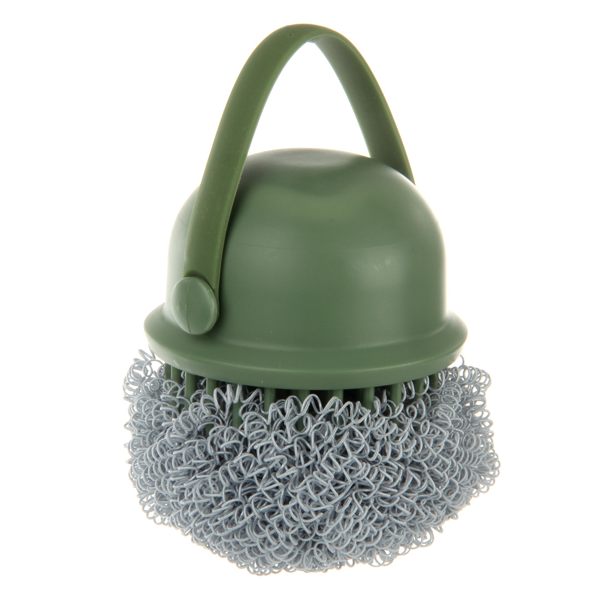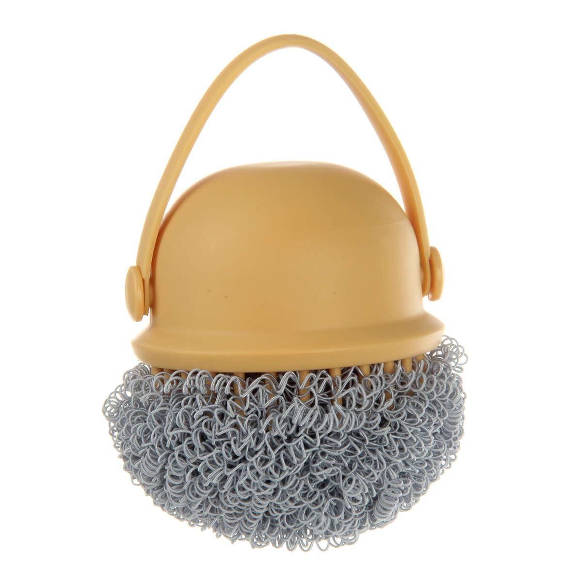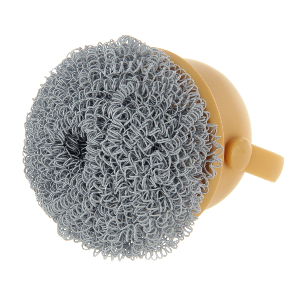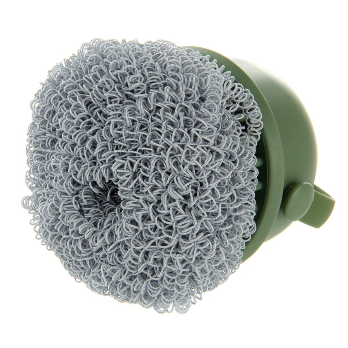 Щетка для мытья имеет снимающуюся с держателя губку, губка жесткая, благодаря этому щетка удаляет самые сложные засохшие и пригоревшие загрязнения.